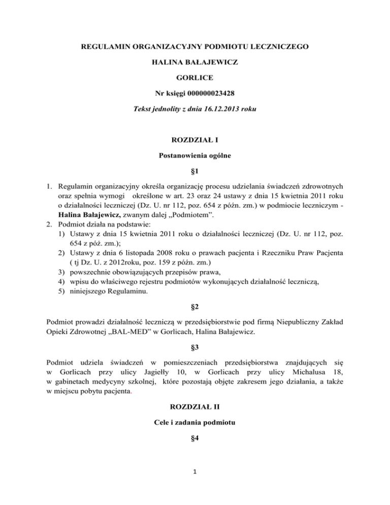 REGULAMIN ORGANIZACYJNY PODMIOTU LECZNICZEGO HALINA BAŁAJEWICZ GORLICE Nr księgi 000000023428 Tekst jednolity z dnia 16.12.2013 roku ROZDZIAŁ I Postanowienia ogólne §1 1. Regulamin organizacyjny określa organizację procesu udzielania świadczeń zdrowotnych oraz spełnia wymogi określone w art. 23 oraz 24 ustawy z dnia 15 kwietnia 2011 roku o działalności leczniczej (Dz. U. nr 112, poz. 654 z późn. zm.) w podmiocie leczniczym Halina Bałajewicz, zwanym dalej „Podmiotem”. 2. Podmiot działa na podstawie: 1) Ustawy z dnia 15 kwietnia 2011 roku o działalności leczniczej (Dz. U. nr 112, poz. 654 z póż. zm.); 2) Ustawy z dnia 6 listopada 2008 roku o prawach pacjenta i Rzeczniku Praw Pacjenta ( tj Dz. U. z 2012roku, poz. 159 z późn. zm.) 3) powszechnie obowiązujących przepisów prawa, 4) wpisu do właściwego rejestru podmiotów wykonujących działalność leczniczą, 5) niniejszego Regulaminu. §2 Podmiot prowadzi działalność leczniczą w przedsiębiorstwie pod firmą Niepubliczny Zakład Opieki Zdrowotnej „BAL-MED” w Gorlicach, Halina Bałajewicz. §3 Podmiot udziela świadczeń w pomieszczeniach przedsiębiorstwa znajdujących się w Gorlicach przy ulicy Jagiełły 10, w Gorlicach przy ulicy Michalusa 18, w gabinetach medycyny szkolnej, które pozostają objęte zakresem jego działania, a także w miejscu pobytu pacjenta. ROZDZIAŁ II Cele i zadania podmiotu §4 1 1. Celem Podmiotu jest udzielanie świadczeń zdrowotnych poprzez wykonywanie zawodowo działań służących zachowaniu, ratowaniu, przywracaniu i poprawie zdrowia oraz innych działań medycznych wynikających z procesu leczenia lub przepisów regulujących zasady ich wykonywania jak również działania mające na celu propagowanie zachowań prozdrowowtnych. 2. Cele i zadania będą realizowane z wykorzystaniem nowoczesnych, dostępnych metod promocji zdrowia, profilaktyki, leczenia i rehabilitacji, także poprzez podnoszenie poziomu świadczonych usług. 3. Świadczenia mogą być udzielane pacjentom bezpłatnie w przypadku zawarcia umowy o udzielanie świadczeń opieki zdrowotnej z dysponentem środków publicznych oraz umów cywilnoprawnych zawartych z innymi instytucjami, osobami prawnymi i pracodawcami, na rzecz osób uprawnionych do tych świadczeń. 4. W pozostałych przypadkach, nie wymienionych w ust. 3 niniejszego paragrafu, świadczenia mogą być udzielane odpłatnie. Przed udzielaniem w/w świadczeń pacjent zostanie poinformowany o kosztach związanych z udzielonymi mu świadczeniami zdrowotnymi. Cennik w/w świadczeń stanowi załącznik nr 1 niniejszego Regulaminu. 5. Szczegółowy zakres wykonywanych świadczeń zdrowotnych określają umowy podpisane z Narodowym Funduszem Zdrowia. 6. Udzielanie świadczeń zdrowotnych odpłatnych pozostaje bez wpływu na ustaloną kolejność udzielania świadczeń opieki zdrowotnej finansowanych ze środków publicznych. 7. Lekarze planują i realizują kompleksową opiekę lekarską nad osobą objętą opieką medyczną, rodziną i społecznością w środowisku zamieszkania, z uwzględnieniem miejsca wykonywania świadczenia, w warunkach ambulatoryjnych i domowych w zakresie: 1) działań mających na celu utrzymanie zdrowia, 2) działań mających na celu profilaktykę chorób, 3) działań mających na celu rozpoznanie chorób, 4) działań mających na celu leczenie chorób, 5) działań mających na celu usprawnianie pacjenta, a także orzekają i opiniują o stanie zdrowia. . §5 1. Podmiot prowadzi działalność leczniczą w rodzaju ambulatoryjnych świadczeń zdrowotnych. 2. Podmiot prowadzi działalność leczniczą w zakresie: 1) Podstawowej opieki zdrowotnej 2) Specjalistycznej opieki zdrowotnej 3) Rehabilitacji leczniczej 4) Profilaktyki i promocji zdrowia §6 2 1. Zadania o których mowa w § 4-5 będą wykonywane przez personel medyczny Podmiotu, posiadający wymagane przepisami odrębnymi kwalifikacje zawodowe. 2. Świadczenia zdrowotne udzielane są z zachowaniem należytej staranności, zgodnie ze wskazaniami aktualnej wiedzy medycznej, respektując prawa pacjenta oraz zgodnie z zasadami etyki zawodowej. 3. Pomieszczenia oraz wyposażenie przedsiębiorstwa w sprzęt medyczny odpowiadają wymaganiom fachowym, sanitarnym i standardom określonym w odrębnych przepisach 4. Aparatura i sprzęt medyczny przedsiębiorstwa są wprowadzone do obrotu i używania zgodnie z obowiązującymi przepisami. §7 Cele i zadania określone w § 4-5 Podmiot realizuje z wykorzystaniem posiadanych zasobów kadrowych, lokalowych, sprzętowych i finansowych oraz we współpracy z: 1. Szpitalami oraz innymi podmiotami wykonującymi działalność leczniczą; 2. Placówkami klinicznymi akademii medycznych i instytucjami naukowymi 3. Innymi podmiotami. ROZDZIAŁ III Struktura organizacyjna podmiotu i zasady współdziałania §8 1. Na czele podmiotu stoi Kierownik, któremu podlegają wszyscy pracownicy, a w szczególności osoby udzielające świadczeń zdrowotnych w imieniu Podmiotu. 2. Na zewnątrz podmiot reprezentowany jest przez Kierownika lub pełnomocnika. 3. Kierownik podejmuje samodzielnie decyzje dotyczące funkcjonowania Podmiotu i ponosi za nie odpowiedzialność. 4. W czasie nieobecności Kierownika zastępuje go osoba stosownie upoważniona przez niego. 5. Kierownik wykonuje wszystkie obowiązki i prawa, jakie na Podmiot nakładają powszechnie obowiązujące przepisy prawa. 6. Do wyłącznej dyspozycji Kierownik zastrzega sobie: 1) organizowanie i kierowanie pracą podległych mu pracowników, 2) zatwierdzenie planów inwestycyjnych, 3) tworzenie aktów normatywnych (zarządzenia wewnętrzne), 4) wydawanie upoważnień i pełnomocnictw ogólnych oraz do załatwiania określonych spraw, 5) reprezentowanie jednostki przed organami kontroli zewnętrznej w trakcie ich przeprowadzania i w postępowaniu pokontrolnym, 6) zawieranie umów na usługi medyczne, 7) podpisywanie umów cywilno-prawnych, 8) zatrudnianie i zwalnianie pracowników Prz