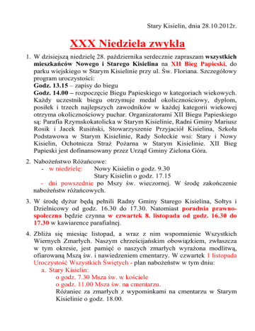 Stary Kisielin, dnia 28.10.2012r. XXX Niedziela zwykła 1. W dzisiejszą niedzielę 28. października serdecznie zapraszam wszystkich mieszkańców Nowego i Starego Kisielina na XII Bieg Papieski, do parku wiejskiego w Starym Kisielinie przy ul. Św. Floriana. Szczegółowy program uroczystości: Godz. 13.15 – zapisy do biegu Godz. 14.00 – rozpoczęcie Biegu Papieskiego w kategoriach wiekowych. Każdy uczestnik biegu otrzymuje medal okolicznościowy, dyplom, posiłek i trzech najlepszych zawodników w każdej kategorii wiekowej otrzyma okolicznościowy puchar. Organizatorami XII Biegu Papieskiego są: Parafia Rzymskokatolicka w Starym Kisielinie, Radni Gminy Mariusz Rosik i Jacek Rusiński, Stowarzyszenie Przyjaciół Kisielina, Szkoła Podstawowa w Starym Kisielinie, Rady Sołeckie wsi: Stary i Nowy Kisielin, Ochotnicza Straż Pożarna w Starym Kisielinie. XII Bieg Papieski jest dofinansowany przez Urząd Gminy Zielona Góra. 2. Nabożeństwo Różańcowe: - w niedzielę: Nowy Kisielin o godz. 9.30 Stary Kisielin o godz. 17.15 - dni powszednie po Mszy św. wieczornej. W środę zakończenie nabożeństw różańcowych. 3. W środę dyżur będą pełnili Radny Gminy Starego Kisielina, Sołtys i Dzielnicowy od godz. 16.30 do 17.30. Natomiast poradnia prawnospołeczna będzie czynna w czwartek 8. listopada od godz. 16.30 do 17.30 w kawiarence parafialnej. 4. Zbliża się miesiąc listopad, a wraz z nim wspomnienie Wszystkich Wiernych Zmarłych. Naszym chrześcijańskim obowiązkiem, zwłaszcza w tym okresie, jest pamięć o naszych zmarłych wyrażona modlitwą, ofiarowaną Mszą św. i nawiedzeniem cmentarzy. W czwartek 1 listopada Uroczystość Wszystkich Świętych - plan nabożeństw w tym dniu: a. Stary Kisielin: o godz. 7.30 Msza św. w kościele o godz. 11.00 Msza św. na cmentarzu. Różaniec za zmarłych z wypominkami na cmentarzu w Starym Kisielinie o godz. 18.00. b. Nowy Kisielin: o godz. 9.00 Msza św. na cmentarzu. Różaniec za zmarłych z wypominkami na cmentarzu w Nowy Kisielin o godz.16.30. 5. W piątek 2 listopada Wspomnienie Wszystkich Wiernych Zmarłych Dzień Zaduszny. Msze św.: a. Stary Kisielin o godz. 7.00; 18.00 b. Nowy Kisielin o godz. 16.30 c. Do 8. listopada za nawiedzenie cmentarza można zyskać odpust zupełny pod zwykłymi warunkami. Zachęcamy do skorzystania z tej możliwości. d. Rozdajemy wydrukowane formularze do wypisania imion zmarłych, których chcemy polecić Bogu podczas wypominków. Pamiętajmy o uporządkowaniu cmentarza i grobów. 6. W tym tygodniu przypada I piątek miesiąca: odwiedziny chorych w domach o zwykłej porze. Spowiedź św. pół godziny przed każdą Mszą św.. Dzieci, które w tym roku przystąpiły do I Komunii św. przychodzą w piątek do spowiedzi św., oraz na Mszę św. w strojach komunijnych. 7. W pierwszą sobotę miesiąca zapraszam do wspólnej modlitwy ku czci Niepokalanego Serca Najświętszej Maryi Panny do kościoła w Nowym Kisielinie. O godz. 17.30 modlitwa różańcowa, następnie o godz. 18.00 – eucharystia, wystawienie Najświętszego Sakramentu i adoracja. 8. W przyszłą niedzielę zmiana tajemnic Żywego Różańca o godz. 7.30 w kościele w Starym Kisielinie. 9. Za złożone ofiary na cele kościelne i parafialne składam serdeczne Bóg zapałać. Ks. kanonik dr Andrzej Brenk Proboszcz