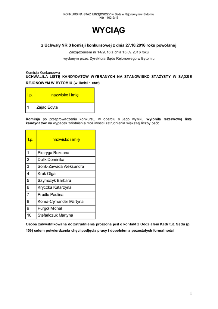 KONKURS NA STAŻ URZ ĘDNICZY w Sądzie Rejonowym w Bytomiu Kdr 1102-2/16 WYCIĄG z Uchwały NR 3 komisji konkursowej z dnia 27.10.2016 roku powołanej Zarządzeniem nr 14/2016 z dnia 13.09. 2016 roku wydanym przez Dyrektora Sądu Rejonowego w Bytomiu Komisja Konkurs owa UCHWALIŁA LISTĘ KANDYDATÓW W YBRANYCH NA STANOWISKO STAŻYSTY W S ĄDZI E REJONOW YM W BYTOMIU (w ilości 1 etat) l.p. 1 nazwisko i imię Zając Edyta Komi sja po przeprowadzeniu konkursu, w oparciu o jego wy niki, wyłoniła rezerwową listę kandydatów na wypadek zaistnienia możliwości zatrudnienia większej liczby osób l.p. nazwisko i imię 1 Pietryga Roksana 2 Dulik Dominika 3 Sollik-Zawada Aleksandra 4 Kruk Olga 5 Szymczyk Barbara 6 Kryczka Katarzyna 7 Prudlo Paulina 8 Koma-Cymander Martyna 9 Purgoł Michał 10 Stefańczuk Martyna Osoba zakwalifikowana do zatrudnienia proszona jest o kontakt z Oddziałem Kadr tut. Sądu (p. 109) celem potwierdzenia chęci podjęcia pracy i dopełnienia pozostałych formalności 1