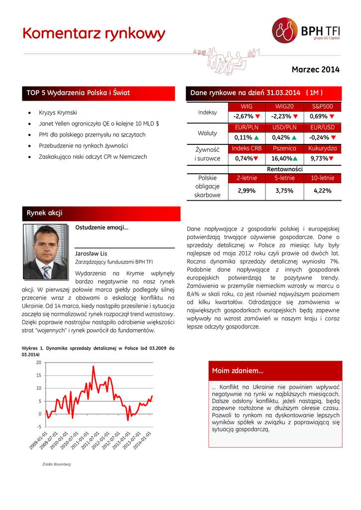 Marzec 2014 TOP 5 Wydarzenia Polska i Świat Kryzys Krymski Janet Yellen ograniczyła QE o kolejne 10 MLD $ PMI dla polskiego przemysłu na szczytach Przebudzenie na rynkach żywności Zaskakująco niski odczyt CPI w Niemczech Dane rynkowe na dzień 31.03.2014 ( 1M ) Indeksy Waluty Żywność i surowce Polskie obligacje skarbowe WIG WIG20 S&P500 -2,67% -2,23% 0,69% EUR/PLN USD/PLN EUR/USD 0,11% 0,42% -0,24% Indeks CRB Pszenica Kukurydza 0,74% 16,40% 9,73% 2-letnie Rentowności 5-letnie 10-letnie 2,99% 3,75% 4,22% Rynek akcji Ostudzenie emocji… Jarosław Lis Zarządzający funduszami BPH TFI Wydarzenia na Krymie wpłynęły bardzo negatywnie na nasz rynek akcji. W pierwszej połowie marca giełdy podlegały silnej przecenie wraz z obawami o eskalację konfliktu na Ukrainie. Od 14 marca, kiedy nastąpiło przesilenie i sytuacja zaczęła się normalizować rynek rozpoczął trend wzrostowy. Dzięki poprawie nastrojów nastąpiło odrobienie większości strat "wojennych" i rynek powrócił do fundamentów. Dane napływające z gospodarki polskiej i europejskiej potwierdzają trwające ożywienie gospodarcze. Dane o sprzedaży detalicznej w Polsce za miesiąc luty były najlepsze od maja 2012 roku czyli prawie od dwóch lat. Roczna dynamika sprzedaży detalicznej wyniosła 7%. Podobnie dane napływające z innych gospodarek europejskich potwierdzają te pozytywne trendy. Zamówienia w przemyśle niemieckim wzrosły w marcu o 8,4% w skali roku, co jest również najwyższym poziomem od kilku kwartałów. Odradzające się zamówienia w największych gospodarkach europejskich będą zapewne wpływały na wzrost zamówień w naszym kraju i coraz lepsze odczyty gospodarcze. Wykres 1. Dynamika sprzedaży detalicznej w Polsce (od 03.2009 do 03.2014) 20 Moim zdaniem… 15 … Konflikt na Ukrainie nie powinien wpływać negatywnie na rynki w najbliższych miesiącach. Dalsze odsłony konfliktu, jeżeli nastąpią, będą zapewne rozłożone w dłuższym okresie czasu. Pozwoli to rynkom na dyskontowanie lepszych wyników spółek w związku z poprawiającą się sytuacją gospodarczą. 10 5 0 -5 Źródło: Bloomberg Rynek obligacji i rynek walutowy Obligacje wciąż jeszcze atrakcyjne ? Paweł Gołębiewski Zarządzający funduszami BPH TFI To był dobry miesiąc dla posiadaczy polskich obligacji skarbowych. Europa flirtuje z deflacją. To nowe ryzyko dla strefy euro odnotowują szanowane instytucje, takie jak MFW. Oczekiwania, na pakiet QE w wykonaniu ECB wzrosły szczególnie po wypowiedziach prezesa Bundesbanku Jensa Weidmann'a, który uznawany był do tej pory za główną przeszkodę we wdrożeniu nieortodoksyjnej polityki pieniężnej. Zobaczyliśmy również zaskakująco niski odczyt CPI w Niemczech,a w Hiszpanii w Wykres 2. Dynamika kredytów dla gospodarstw domowych w strefie euro (od 01.2004 do 01.2014) lutym ceny nawet spadały r/r. Czynniki lokalne również pomagały obligacjom. RPP wydłużyła okres na jaki zostanie utrzymana historycznie nieska stopa bazowa - do końca trzeciego kwartału br. Dodatkowo, towarzysząca posiedzeniu projekcja NBP wskazuje, że tempo wzrostu CPI nie będzie szybkie i za dwa lata można spodziewać się tego wskaźnika w pobliżu celu inflacyjnego, a jednocześnie średniorocznej inflacji poniżej wartości 2,5%. Członkowie Rady są wyraźnie zaniepokojeni sytuacją gospodarczą na Ukrainie oraz potencjalnymi reperkusjami (spadek dynamiki PKB o 0,2-0,4 pp). Brak presji popytowej potwierdziły dane makro. Zrewidowana inflacja za styczeń wyniosła jedynie 0,5% r/r, natomiast za luty 0,7% r/r, z uwagi na niską dynamikę cen żywności. Jednocześnie średnioterminowe prognozy pozostają optymistyczne, w czym utwierdza wskaźnik managerów logistyki na poziomie 55,9 za luty. Moim zdaniem... …Europa powoli wychodzi na prostą. Mimo wysokiej dynamiki indeksów wyprzedzających aktywność kredytowa banków w strefie pozostaje bardzo niska. Proces delewarowania trwa, co wywiera presję deflacyjną oraz zwiększa ryzyko spirali deflacyjnej. 12% 10% 8% 6% 4% 2% 0% -2% Źródło: Bloomberg Rynek surowcowy Surowce wracają do gry ? Karol Godyń Zarządzający funduszami BPH TFI Po obfitującym w wydarzenia geopolityczne marcu można mieć nadzieję, że inwestorzy przypomną sobie o surowcach. W zasadzie od S&P GSCI Agricultural Index Total Return CME (od 12.2012 do 04.2014) 800 750 700 650 600 550 500 Źródło: Bloomberg początku roku obserwujemy rosnącą zmienność, dodatnie stopy zwrotu, a co najważniejsze – dekorelację z innymi klasami aktywów. Marzec zdecydowanie należał do segmentu żywności. Na fali anomalii pogodowych ceny zbóż pokonywały kolejne poziomy cenowe rosnąco ponad 16% w przypadku pszenicy, czy niemal 10% dla kukurydzy. Na drugim biegunie znalazły się metale, a w szczególności miedź i srebro taniejące o przeszło 6%. Moim zdaniem... Uważam, że miniony kwartał może wzbudzić zainteresowanie inwestorów, którzy od dłuższego czasu omijali rynek surowców szerokim łukiem. Nasze fundusze miesiąca Najwyższą miesięczną stopę zwrotu spośród funduszy otwartych BPH TFI osiągnął Subfundusz: BPH Akcji Europy Wschodzącej +5,67% Najchętniej wybieranym funduszem z spośród funduszy otwartych BPH TFI był Subfundusz: BPH Skarbowy Tabela 1. Wyniki funduszy otwartych BPH TFI – stan na dzień 31.03.2014 Fundusz Stopy zwrotu w % 1m 3m 6m 12m 24m 36m 60m BPH Skarbowy 0,15 0,42 0,90 1,69 6,25 10,33 22,19 BPH Obligacji 1 0,34 0,62 1,88 2,40 7,25 10,54 31,63 BPH Obligacji 2 0,44 0,46 1,63 3,49 6,86 9,40 31,58 BPH Obligacji Korporacyjnych 0,31 1,17 2,21 1,57 7,04 8,93 25,05 BPH Stabilnego Wzrostu -0,59 0,66 2,31 4,59 10,27 4,40 46,39 BPH Aktywnego Zarządzania -0,90 0,45 2,79 5,74 11,62 -0,45 46,36 0,01 0,83 3,73 11,63 27,55 26,07 b.d. BPH Globalny Żywności i Surowców -0,32 2,49 2,86 0,62 -4,77 -15,93 23,61 BPH Akcji -2,30 1,28 4,43 10,23 19,23 -6,20 66,47 1,61 0,62 1,60 -0,21 6,86 10,12 b.d. BPH Akcji Dynamicznych Sp