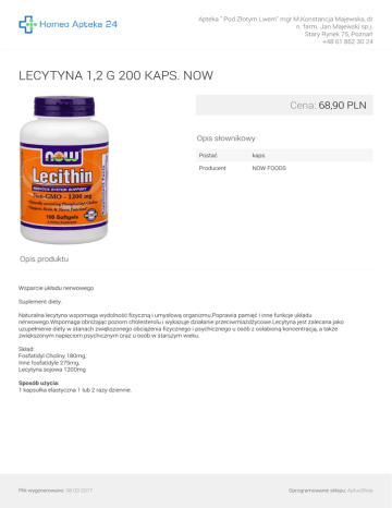 Apteka " Pod Złotym Lwem" mgr M.Konstancja Majewska, dr n. farm. Jan Majewski sp.j. Stary Rynek 75, Poznań +48 61 852 30 24 LECYTYNA 1,2 G 200 KAPS. NOW Cena: 68,90 PLN Opis słownikowy Postać kaps. Producent NOW FOODS Opis produktu Wsparcie układu nerwowego Suplement diety. Naturalna lecytyna wspomaga wydolność fizyczną i umysłową organizmu.Poprawia pamięć i inne funkcje układu nerwowego.Wspomaga obniżając poziom cholesterolu i wykazuje działanie przeciwmiażdżycowe.Lecytyna jest zalecana jako uzupełnienie diety w stanach zwiększonego obciążenia fizycznego i psychicznego u osób z osłabioną koncentracją, a także zwiększonym napięciom psychicznym oraz u osób w starszym wieku. Skład: Fosfatidyl Choliny 180mg, Inne fosfatidyle 275mg, Lecytyna sojowa 1200mg Sposób użycia: 1 kapsułka elastyczna 1 lub 2 razy dziennie. Plik wygenerowano: 08-03-2017 Powered by TCPDF (www.tcpdf.org) Oprogramowanie sklepu: AptusShop