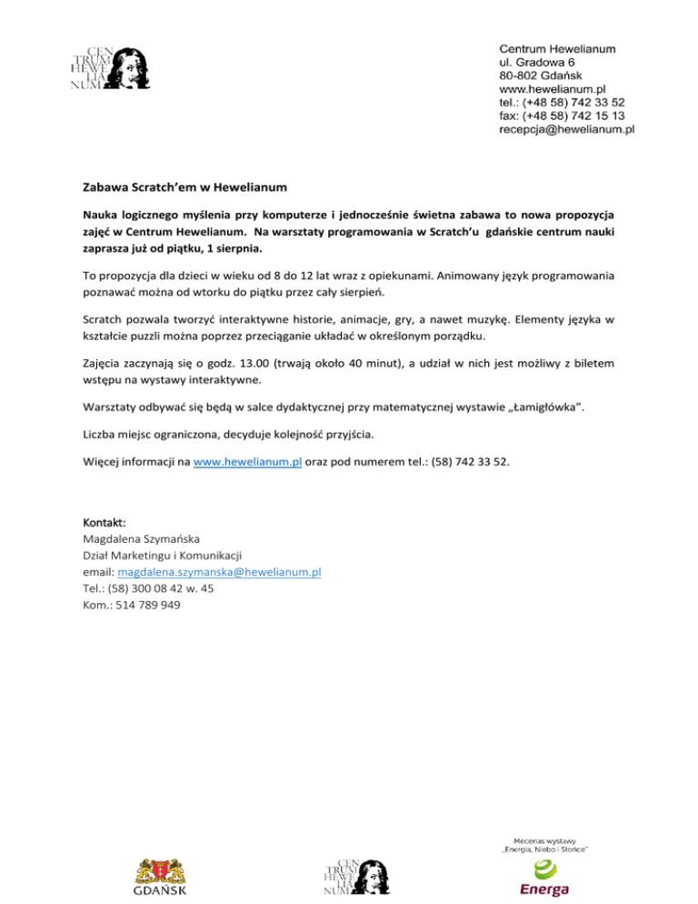 Zabawa Scratch’em w Hewelianum Nauka logicznego myślenia przy komputerze i jednocześnie świetna zabawa to nowa propozycja zajęć w Centrum Hewelianum. Na warsztaty programowania w Scratch’u gdańskie centrum nauki zaprasza już od piątku, 1 sierpnia. To propozycja dla dzieci w wieku od 8 do 12 lat wraz z opiekunami. Animowany język programowania poznawać można od wtorku do piątku przez cały sierpień. Scratch pozwala tworzyć interaktywne historie, animacje, gry, a nawet muzykę. Elementy języka w kształcie puzzli można poprzez przeciąganie układać w określonym porządku. Zajęcia zaczynają się o godz. 13.00 (trwają około 40 minut), a udział w nich jest możliwy z biletem wstępu na wystawy interaktywne. Warsztaty odbywać się będą w salce dydaktycznej przy matematycznej wystawie „Łamigłówka”. Liczba miejsc ograniczona, decyduje kolejność przyjścia. Więcej informacji na www.hewelianum.pl oraz pod numerem tel.: (58) 742 33 52. Kontakt: Magdalena Szymańska Dział Marketingu i Komunikacji email: [email protected] Tel.: (58) 300 08 42 w. 45 Kom.: 514 789 949