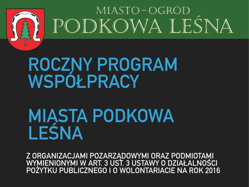 ROCZNY PROGRAM WSPÓŁPRACY MIASTA PODKOWA LEŚNA Z ORGANIZACJAMI POZARZĄDOWYMI ORAZ PODMIOTAMI WYMIENIONYMI W ART. 3 UST. 3 USTAWY O DZIAŁALNOŚCI POŻYTKU PUBLICZNEGO I O WOLONTARIACIE NA ROK 2016 MIEJSCE REALIZACJI PROGRAMU: PODKOWA LEŚNA Adresaci Programu: organizacje pozarządowe, podmioty, o których mowa w art. 3 ust. 3 ustawy z dnia 24 kwietnia 2003 r. o działalności pożytku publicznego i o wolontariacie PODSTAWY PRAWNE: ustawa o samorządzie gminnym; ustawa o działalności pożytku publicznego i o wolontariacie; uchwała Rady Miasta Podkowy Leśnej w sprawie przyjęcia Strategii zrównoważonego rozwoju miasta ogrodu Podkowy Leśnej na lata 2013-2025; uchwała Rady Miasta Podkowy Leśnej w sprawie określenia sposobu konsultowania z radami działalności pożytku publicznego lub organizacjami pozarządowymi i podmiotami wymienionymi w art. 3 ust. 3 ustawy o działalności pożytku publicznego i o wolontariacie, projektów aktów prawa miejscowego w dziedzinach dotyczących działalności statutowych tych organizacji. FORMY WSPÓŁPRACY: charakter finansowy; charakter pozafinansowy. MAŁE GRANTY: wysokość dofinansowania lub finansowania zadania publicznego nie przekracza kwoty 10.000 złotych; zadanie publiczne ma być realizowane w okresie nie dłuższym niż 90 dni; łączna kwota przekazana w ten sposób tej samej organizacji w danym roku nie może przekroczyć 20.000 złotych; łączna kwota przekazana w tym trybie nie może przekroczyć 20% dotacji planowanych w roku budżetowym na realizację zadań publicznych przez organizacje pozarządowe; zadanie mieści się w katalogu zadań określonych w art. 4 ust.1 ustawy; oferta powinna być złożona nie później niż, na 14 dni przed dniem planowanego terminu rozpoczęcia realizacji zadania. DOTACJE NIE MOGĄ BYĆ WYKORZYSTANE NA: zadania i zakupy inwestycyjne; zakupy gruntów; działalność gospodarczą; pokrycie kosztów utrzymania biura podmiotów programu, z wyłączeniem bezpośrednich kosztów związanych z realizacją zadania; działalność partii politycznych; działalność związków zawodowych, organizacji pracodawców i samorządów zawodowych; działalność fundacji, których jedynym fundatorem jest Skarb Państwa, jednostka samorządu terytorialnego lub partia polityczna. PRIORYTETOWE ZADANIA PUBLICZNE: Zaspokajanie potrzeb i zainteresowań kulturalnych, edukacyjnych i społecznych mieszkańców miasta, w tym edukacja kulturalna, społeczna i proekologiczna dzieci, młodzieży oraz dorosłych, w tym osób niepełnosprawnych. Wspieranie działań promujących lokalne dziedzictwo historyczne, kulturowe i przyrodnicze; Zaspokajanie potrzeb i zainteresowań z dziedziny kultury fizycznej i sportu dzieci, młodzieży oraz dorosłych mieszkańców Miasta, w tym osób niepełnosprawnych. Wspieranie działań przeciwdziałających uzależnieniom i patologiom społecznym. Wspieranie działań związanych z integracją międzypokoleniową, budowaniem współpracy pomiędzy seniorami i młodzieżą; Wspieranie działań zwalczających dyskryminację w społecznościach lokalnych i internetowych. OKRES REALIZACJI PROGRAMU: program obowiązuje w okresie od 1 stycznia 2016 r. do 31 grudnia 2016 r. PEŁNOMOCNIK DS. WSPÓŁPRACY Z ORGANIZACJAMI POZARZĄDOWYMI: realizuje program; przygotowuje projekt planu współpracy z organizacjami pozarządowymi oraz przeprowadza jego konsultacje z Forum Podkowiańskich Organizacji Pozarządowych; wspiera lub powierza realizację zadań publicznych; informuje organizacje o projektach aktów normatywnych w dziedzinach dotyczących działalności statutowej organizacji; promuje działalności sektora pozarządowego. SPOSÓB REALIZACJI PROGRAMU: Zlecanie realizacji zadań publicznych w formie otwartych konkursów ofert (art. 13); zlecanie - na wniosek organizacji - z pominięciem otwartego konkursu ofert (art. 19 a); z inicjatywy własnej organizacji (art.12). WYSOKOŚĆ ŚRODKÓW PLANOWANYCH NA REALIZACJĘ PROGRAMU: określa uchwała budżetowa; planuje się kwotę w wysokości co najmniej 100 000 zł. OCENA REALIZACJI PROGRAMU: do dnia 30 kwietnia następnego roku; zamieszczone w Biuletynie Informacji Publicznej oraz na stronie internetowej miasta. KOMISJA KONKURSOWA: Burmistrz każdorazowo powołuje komisje konkursową zarządzeniem; Przewodniczącym komisji konkursowej jest przedstawiciel burmistrza – określa on termin i miejsce posiedzenia komisji; Obsługę administracyjno-biurową komisji konkursowych prowadzi pełnomocnik; Uczestnictwo w pracach komisji jest nieodpłatne; W pracach komisji nie mogą brać udziału osoby reprezentujące podmioty biorące udział w konkursie ani urzędnicy formalnie związani z danym podmiotem – Kodeks postępowania administracyjnego. KOMISJA KONKURSOWA: Obowiązki informacyjne. Rozpatrzenie prawidłowo złożonych ofert oraz rozstrzygnięcie konkursu ofert nastąpi w ciągu 14 dni od daty otwarcia ofert. Ocena ofert pod względem poprawności formalnej. W trakcie opiniowania każdego z wniosków komisja bada czy oferta konkursowa spełnia wymagania formalne oraz ocenia zawartość merytoryczną wniosku. Komisja odrzuca oferty zawierające błędy formalne. OCENA MERYTORYCZNA: ocenie możliwości realizacji zadania przez oferenta, ocenie spójności celu realizacji zadania określonego w ogłoszeniu oraz w ofercie z zakresem rzeczowym zadania, harmonogramem i kosztorysem, sprawdzeniu oferty pod względem rachunkowym. KRYTERIA OCENY: ocena możliwości realizacji zadania publicznego przez wnioskodawcę, adresaci - ilość osób korzystających z efektu,doświadczenie wnioskodawcy w realizacji zadań publicznych (rzetelności terminowość oraz sposób rozliczenia otrzymanych w latach ubiegłych środków), ocena przedstawionej kalkulacji kosztów realizacji zadania publicznego, planowany udział środków finansowych własnych lub środków pochodzących z innych źródeł na realizację zadania publicznego, planowany wkład rzeczowy, osobow