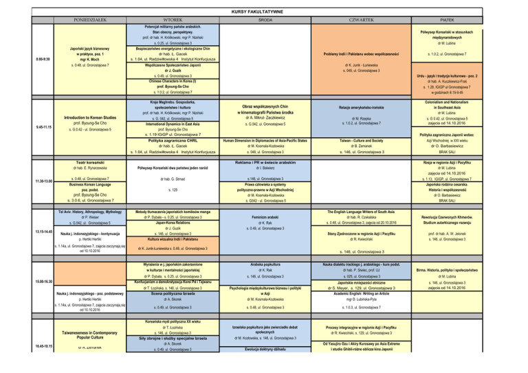 KURSY FAKULTATYWNE PONIEDZIAŁEK 8:00-9:30 9.45-11.15 Japoński język biznesowy w praktyce, poz. 1 mgr K. Moch s. 0.48, ul. Gronostajowa 7 Introduction to Korean Studies prof. Byoung-Se Cho s. G 0.42 - ul. Gronostajowa 5 Teatr koreański dr hab. E. Rynarzewska 11.30-13.00 s. 0.48, ul. Gronostajowa 7 Business Korean Language poz. podst. WTOREK Nauka j. indonezyjskiego - kontynuacja p. Hertiki Hertiki s. 1.14a, ul. Gronostajowa 7, zajęcia zaczynają się od 10.10.2016 15.00-16.30 Nauka j. indonezyjskiego - poz. podstawowy p. Hertiki Hertiki s. 1.14a, ul. Gronostajowa 7, zajęcia zaczynają się od 10.10.2016 Problemy Indii i Pakistanu wobec współczesności 16.45-18.15 dr A. Zemanek s. 1.0.2, ul. Gronostajowa 7 dr K. Junik - Łuniewska s. 049, ul. Gronostajowa 3 Urdu - język i tradycja kulturowa - poz. 2 dr hab. A. Kuczkiewicz-Fraś s. 1.28, IGIGP ul Gronostajowa 7 w godzinach 8.15-9.45 s. G.042, ul. Gronostajowa 5 dr M. Rzepka s. 1.0.2, ul. Gronostajowa 7 Polityka zagraniczna CHRL dr hab. Ł. Gacek Human Dimension in Diplomacies of Asia-Pacific States dr M. Kosmala-Kozłowska Taiwan - Culture and Society dr B. Zemanek Polityka zagraniczna Japonii wobec Azji Wschodniej w XXI wieku dr O. Barbasiewicz s. 1.04, ul. Radziwiłłowska 4 Instytut Konfucjusza s. 048, ul. Gronostajowa 3 s. 146, ul. Gronostajowa 3 BRAK SALI Półwysep Koreański dwa państwa jeden naród Reklama i PR w świecie arabskim dr I. Balwierz dr hab. G. Strnad s. 129 Metody tłumaczenia japońskich komiksów manga dr P. Dybała - s. 0.25, ul. Gronostajowa 3 Japan-Korea Relations dr J. Guzik s. 146, ul. Gronostajowa 3 Kultura wizualna Indii i Pakistanu Obraz współczesnych Chin w kinematografii Państwa środka dr A. Mikrut- Żaczkiewicz Relacje amerykańsko-irańskie Rosja w regionie Azji i Pacyfiku dr M. Lubina zajęcia od 14.10.2016 s. 1.13, IGIGP, ul. Gronostajowa 7 Japońska rodzina cesarska. Historia i współczesność dr O. Barbasiewicz BRAK SALI s.146, ul. Gronostajowa 3 Prawa człowieka a systemy polityczno-prawne w Azji Wschodniej dr M. Kosmala-Kozłowska s. G042 - ul. Gronostajowa 5 Feminizm arabski dr K. Rak s. 0.49, ul. Gronostajowa 3 dr K. Junik-Łuniewska s. 0.49, ul. Gronostajowa 3 The English Language Writers of South Asia dr hab. R. Czekalska s. 0.48, ul. Gronostajowa 3, zajęcia od 20.10.2016 Rewolucja Czerwonych Khmerów. Studium autarkicznego rozwoju Stany Zjednoczone w regionie Azji i Pacyfiku dr R. Kwieciński prof. dr hab. A. W. Jelonek s. 146, ul. Gronostajowa 3 s. 146, ul. Gronostajowa 3 Wyrażenia w j. japońskim zakorzenione w kulturze i mentalności japońskiej Arabska popkultura dr K. Rak Nauka dialektu irackiego j. arabskiego - kurs podst. dr hab. P. Siwiec, prof. UJ dr P. Dybała, s. 0.25, ul. Gronostajowa 3 Konfucjanizm a demokratyzacja Korei Pd i Tajwanu s. 146, ul. Gronostajowa 3 s. 025, ul. Gronostajowa 3 dr M. Lubina dr T. Łozińska, s. 146, ul. Gronostajowa 3 Scena polityczna Izraela dr A. Skorek Psychologia międzykulturowa biznesu i polityki w Azji dr M. Kosmala-Kozłowska Japońskie mniejszości etniczne dr S. Meyer, s. 129, ul. Gronostajowa 3 Academic English: Writing an Article mgr D. Lubińska-Pyla s. 146, ul. Gronostajowa 3 zajęcia od 14.10.2016 s. 0.49, ul. Gronostajowa 3 s. 0.48, ul. Gronostajowa 3 s. 1.0.3, ul. Gronostajowa 7 Izraelska popkultura jako zwierciadło debat społecznych Procesy integracyjne w regionie Azji i Pacyfiku dr R. Kwieciński, s. 129, ul. Gronostajowa 3 Koreańska myśl polityczna XX wieku Taiwaneseness in Contemporary Popular Culture PIĄTEK Colonialism and Nationalism in Southeast Asia dr M. Lubina s. G 0.42, ul. Gronostajowa 5 zajęcia od 14.10.2016 Kraje Maghrebu. Gospodarka, społeczeństwo i kultura prof. dr hab. H. Królikowski, mgr P. Niziński s. G. 042, ul. Gronostajowa 5 International Dynamics in East Asia prof. Byoung-Se Cho s. 1.19 IGiGP ul. Gronostajowa 7 s. 3.0.6, ul. Gronostajowa 7 13.15-14.45 CZWARTEK Półwysep Koreański w stosunkach międzynarodowych dr M. Lubina Współczesne Społeczeństwo Japonii dr J. Guzik s. 0.49, ul. Gronostajowa 3 Chinese Characters in Korea (I) prof. Byoung-Se Cho s. 1.0.2, ul. Gronostajowa 7 prof. Byoung-Se Cho Tel Aviv. History, Athropology, Mythology dr P. Weiser s. G.042, ul. Gronostajowa 5 ŚRODA Potencjał militarny państw arabskich. Stan obecny, perspektywy. prof. dr hab. H. Królikowski, mgr P. Niziński s. 0.25, ul. Gronostajowa 3 Bezpieczeństwo energetyczne i ekologiczne Chin dr hab. Ł. Gacek s. 1.04, ul. Radziwiłłowska 4 Instytut Konfucjusza dr T. Łozińska s. 146, ul. Gronostajowa 3 Siły zbrojne i służby specjalne Izraela dr A. Skorek s. 0.49, ul. Gronostajowa 3 dr M. Kozłowska, s. 146, ul. Gronostajowa 3 Ewolucja doktryny dżihadu Od Yasujiro Ozu i Akiry Kurosawy po Asia Extreme i studio Ghibli-różne oblicza kina Japonii Birma. Historia, polityka i społeczeństwo 16.45-18.15 s. 146, ul. Gronostajowa 3 Australia na politycznym rozdrożu - jeszcze Oceania czy już Azja? dr hab. P. Siwiec, prof. UJ s. 0.48, ul. Gronostajowa 3 dr A. Mikrut-Żaczkiewicz, s. 1.0.3, ul. Gronostajowa 7 dr D. Zdziech, s. 048, ul. Gronostajowa 3 18.30-20.00 Budowanie współczesnego konfliktu medialnego na BW prof. dr hab. H. Królikowski, mgr P. Niziński s.129, ul. Gronostajowa 7 Film izraelski dr P. Weiser s. 0.49, ul. Gronostajowa 3 Język turecki - język i tradycja kulturowa - poz. 2 mgr G. Stoczyńska-Tunçtemir, s. 0.25, ul. Gronostajowa 3 The History of Globalization prof. S. Babones, s. 1.0.2, ul. Gronostajowa 7 UWAGA NIESTANDARDOWY UKŁAD ZAJĘĆ* Azja Wschodnia w polityce państw Australii i Oceanii dr D. Zdziech s. 048, ul. Gronostajowa 3 Kobieta w Izraelu dr M. Kozłowska s. 146, ul. Gronostajowa 3 Japoński język biznesowy w praktyce, poz. 2 mgr K. Moch s. 049, ul. Gronostajowa 3 *The History of Globalization - prof. S. Babones/ dr M. Lubina zajęcia od 11października - 24 października 2016 roku w godz. 16.45 - 20.00 prowadzi dr M. Lubina 07.11.2016 (poniedziałek) 16.45 - 20.00 - prof