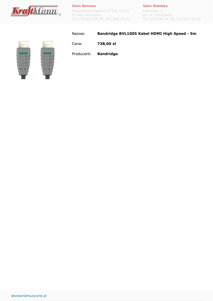 akcesoriamuzyczne.pl Salon Bemowo Salon Białołęka Powstańców Śląskich 87 lok. U10 B 01-466 Warszawa Tel. (22)427-89-95, (22)398-73-32 Kabrioletu 4 03-117 Warszawa Tel. (22)490-31-43, (22)243-36-05 Nazwa: Bandridge BVL1005 Kabel HDMI High Speed - 5m Cena: 738,00 zł Producent: Bandridge