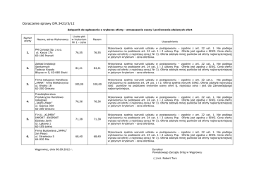 Oznaczenie sprawy DM.3421/5/12 Załącznik do ogłoszenia o wyborze oferty - streszczenie oceny i porównania złoŜonych ofert Numer oferty Nazwa, adres Wykonawcy 1. PM Concept Sp. z o.o. ul. Kacza 17a 60-106 Poznań 2. Zakład Instalacji Sanitarnych Tadeusz Kopała Blizyce nr 5, 62-085 Skoki 3. Firma Usługowo-Handlowa „ANNA” Anna Białobrzycka ul. Wodna 18 62-200 Gniezno 4. Przedsiębiorstwo Produkcyjno-HandlowoUsługowe „JAWO-ZNAK” ul. Gajowa 36A 62-200 Gniezno 5. 6. Liczba pkt w kryterium Nr 1 - cena F.H.U. „KLIMEK” IMPORT –EXSPORT ElŜbieta Janik Ul. Łąkowa 1 62-105 Łekno Firma Budowlana „JAMAL” Jan Pieprz ul. Strzelecka 5 64-920 Piła Wągrowiec, dnia 06.09.2012 r. Razem Uzasadnienie 76,55 Wykonawca spełnia warunki udziału w postępowaniu – zgodnie z art. 22 ust. 1. Nie podlega wykluczeniu na podstawie art. 24 ust. 1 i 2 ustawy Pzp. Oferta jest zgodna z SIWZ. Cena oferty wyŜsza od oferty z najniŜszą ceną ( Nr 3). Oferta zdobyła mniej punktów od oferty najkorzystniejszej w jedynym kryterium - cena ofertowa. 84,41 84,41 Wykonawca spełnia warunki udziału w postępowaniu – zgodnie z art. 22 ust. 1. Nie podlega wykluczeniu na podstawie art. 24 ust. 1 i 2 ustawy Pzp. Oferta jest zgodna z SIWZ. Cena oferty wyŜsza od oferty z najniŜszą ceną ( Nr 3). Oferta zdobyła mniej punktów od oferty najkorzystniejszej w jedynym kryterium - cena ofertowa. 100,00 100,00 Wykonawca spełnia warunki udziału w postępowaniu – zgodnie z art. 22 ust.1. Nie podlega wykluczeniu na podstawie art. 24 ust. 1 i 2. Oferta spełnia warunki SIWZ. Oferta zdobyła najwyŜszą ilość punktów na podstawie kryteriów oceny ofert tj. najniŜsza cena i jest dla Zamawiającego najkorzystniejsza. 76,36 76,36 Wykonawca spełnia warunki udziału w postępowaniu – zgodnie z art. 22 ust. 1. Nie podlega wykluczeniu na podstawie art. 24 ust. 1 i 2 ustawy Pzp. Oferta jest zgodna z SIWZ. Cena oferty wyŜsza od oferty z najniŜszą ceną ( Nr 3). Oferta zdobyła mniej punktów od oferty najkorzystniejszej w jedynym kryterium - cena ofertowa. 71,38 71,38 Wykonawca spełnia warunki udziału w postępowaniu – zgodnie z art. 22 ust. 1. Nie podlega wykluczeniu na podstawie art. 24 ust. 1 i 2 ustawy Pzp. Oferta jest zgodna z SIWZ. Cena oferty wyŜsza od oferty z najniŜszą ceną ( Nr 3). Oferta zdobyła mniej punktów od oferty najkorzystniejszej w jedynym kryterium - cena ofertowa. 68,40 Wykonawca spełnia warunki udziału w postępowaniu – zgodnie z art. 22 ust. 1. Nie podlega wykluczeniu na podstawie art. 24 ust. 1 i 2 ustawy Pzp. Oferta jest zgodna z SIWZ. Cena oferty wyŜsza od oferty z najniŜszą ceną ( Nr 3). Oferta zdobyła mniej punktów od oferty najkorzystniejszej w jedynym kryterium - cena ofertowa. 76,55 68,40 Dyrektor Powiatowego Zarządu Dróg w Wągrowcu (-) inŜ. Robert Torz