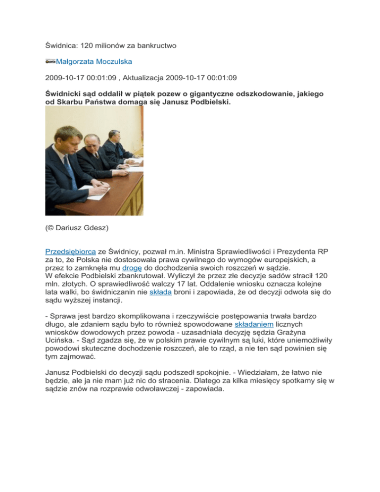 Świdnica: 120 milionów za bankructwo Małgorzata Moczulska 2009-10-17 00:01:09 , Aktualizacja 2009-10-17 00:01:09 Świdnicki sąd oddalił w piątek pozew o gigantyczne odszkodowanie, jakiego od Skarbu Państwa domaga się Janusz Podbielski. (© Dariusz Gdesz) Przedsiębiorca ze Świdnicy, pozwał m.in. Ministra Sprawiedliwości i Prezydenta RP za to, że Polska nie dostosowała prawa cywilnego do wymogów europejskich, a przez to zamknęła mu drogę do dochodzenia swoich roszczeń w sądzie. W efekcie Podbielski zbankrutował. Wyliczył że przez złe decyzje sadów stracił 120 mln. złotych. O sprawiedliwość walczy 17 lat. Oddalenie wniosku oznacza kolejne lata walki, bo świdniczanin nie składa broni i zapowiada, że od decyzji odwoła się do sądu wyższej instancji. - Sprawa jest bardzo skomplikowana i rzeczywiście postępowania trwała bardzo długo, ale zdaniem sądu było to również spowodowane składaniem licznych wniosków dowodowych przez powoda - uzasadniała decyzję sędzia Grażyna Ucińska. - Sąd zgadza się, że w polskim prawie cywilnym są luki, które uniemożliwiły powodowi skuteczne dochodzenie roszczeń, ale to rząd, a nie ten sąd powinien się tym zajmować. Janusz Podbielski do decyzji sądu podszedł spokojnie. - Wiedziałam, że łatwo nie będzie, ale ja nie mam już nic do stracenia. Dlatego za kilka miesięcy spotkamy się w sądzie znów na rozprawie odwoławczej - zapowiada.