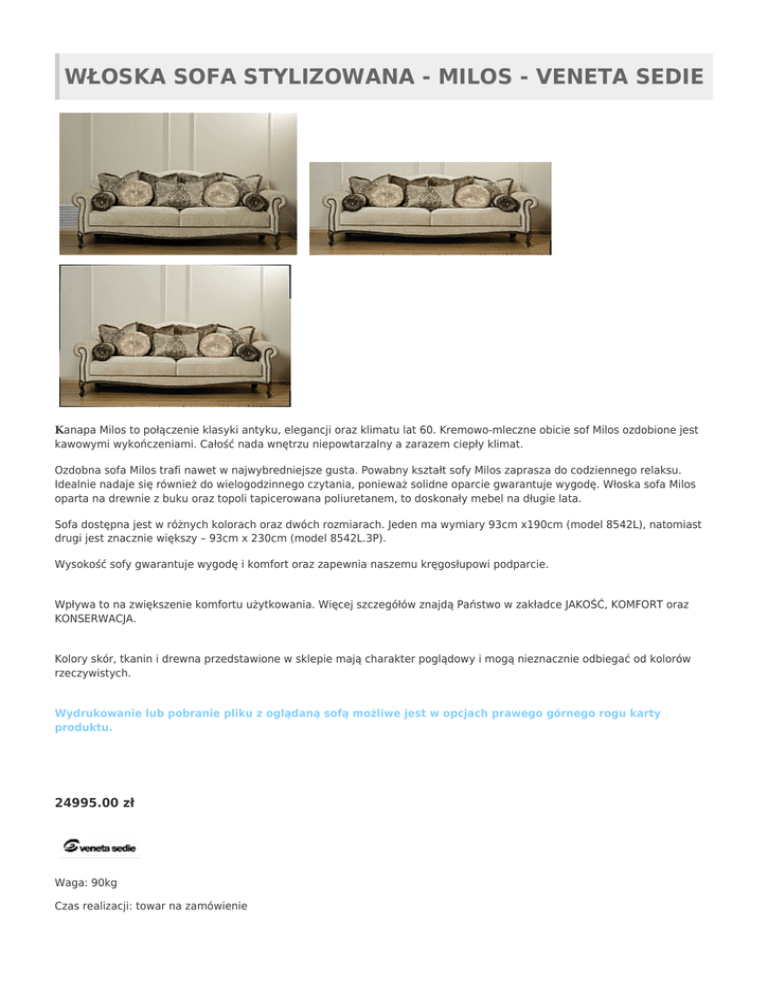 WŁOSKA SOFA STYLIZOWANA - MILOS - VENETA SEDIE Kanapa Milos to połączenie klasyki antyku, elegancji oraz klimatu lat 60. Kremowo-mleczne obicie sof Milos ozdobione jest kawowymi wykończeniami. Całość nada wnętrzu niepowtarzalny a zarazem ciepły klimat. Ozdobna sofa Milos trafi nawet w najwybredniejsze gusta. Powabny kształt sofy Milos zaprasza do codziennego relaksu. Idealnie nadaje się również do wielogodzinnego czytania, ponieważ solidne oparcie gwarantuje wygodę. Włoska sofa Milos oparta na drewnie z buku oraz topoli tapicerowana poliuretanem, to doskonały mebel na długie lata. Sofa dostępna jest w różnych kolorach oraz dwóch rozmiarach. Jeden ma wymiary 93cm x190cm (model 8542L), natomiast drugi jest znacznie większy – 93cm x 230cm (model 8542L.3P). Wysokość sofy gwarantuje wygodę i komfort oraz zapewnia naszemu kręgosłupowi podparcie. Wpływa to na zwiększenie komfortu użytkowania. Więcej szczegółów znajdą Państwo w zakładce JAKOŚĆ, KOMFORT oraz KONSERWACJA. Kolory skór, tkanin i drewna przedstawione w sklepie mają charakter poglądowy i mogą nieznacznie odbiegać od kolorów rzeczywistych. Wydrukowanie lub pobranie pliku z oglądaną sofą możliwe jest w opcjach prawego górnego rogu karty produktu. 24995.00 zł Waga: 90kg Czas realizacji: towar na zamówienie Opcje sofy Wymiary sofy 93 x 100 Rozmiar sofy 230 +2 812.00 zł 190 0.00 zł Rodzaj wykończenia + wybór koloru Ekoskóra - Buffalino 0.00 zł Stalowy col. B-010 Ciemny brązowy - col. B-017 Jasny zielony - col. B-023 Żółty - col. B-029 Pomarańczowy - col. B-030 Granatowy - col. B-033 Fuksja - col. B-038 Biały - col. B-BCO Jasno szary - col. B.SILVER Skóra naturalna E-F +12 737.00 zł Ciemno - niebieski Biały Bułgarski Brąz Ciemna zieleń butelkowa Ciemny brąz Czarny Czerwony Kremowy Piaskowy Tkanina z wzorem 0.00 zł Biały - M1473 col.01 - wzór Beżowy - M1473 col. 02 kwiatowy wzór kwiatowy Jasno brązowy - M1473 col.03 - wzór kwiatowy Musztardowy - M1473 col.04 - wzór kwiatowy Ciemno czerwony - M1473 col. 05 - wzór kwiatowy Szaro - fioletowy - M1473 col. 06 - wzór kwiatowy Niebieski - M1473 col. 07 - Szaro- brązowy - M1473 col. wzór kwiatowy 08- wzór kwiatowy Beżowy - M1474 col. 02 wzór pasy Musztardowy - M1474 col. 04 - wzór pasy Ciemno czerwony - M1474 col.06 - wzór pasy Szaro - fioletowy - M1474 col. 06 - wzór pasy Niebieski - M1474 col. 07 - Szaro - brązowy - M1474 col. wzór pasy 08 - wzór pasy Biały - M1474 col.01 - wzór Beżowy - M1475 col. 02 pasy gładki Jasno brązowy - M1475 col. Musztardowy - M1475 col. 03 - gładki 04 - gładki Ciemno czerwony - M1475 col.05 - gładki Szaro- fioletowy - M1475 col.06 - gładki Niebieski - M1475 col.07 - Szaro - brązowy - M1475 col. gładki 08 - gładki Jasno brązowy - M1474 col. 03 - wzór pasy Tkanina Veluto Alcantara F-R +1 164.00 zł Kremowy - col. FR 01 Jasno brązowy - col. FR02 Brązowy - col. FR08 Rudawy brąz - col. FR08 Bordowy - col. FR 12 Stalowy fiolet - col. FR13 Jasno zielony - col. FR17 Niebieski - col. FR19 Stalowy col. FR 21 Dodatki Rodzaj nóżek Nóżki kwadratowe 0.00 zł Pozostałe © Copyrights 2012 WloskieSofy.pl | Wszelkie prawa zastrzeżone Wenge kwadratowe