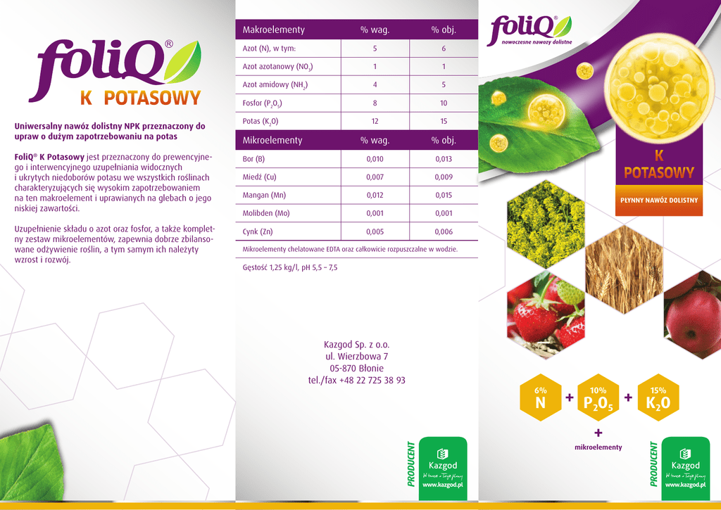 Makroelementy Uniwersalny nawóz dolistny NPK przeznaczony do upraw o dużym zapotrzebowaniu na potas % wag. % obj. Azot (N), w tym: 5 6 Azot azotanowy (NO3) 1 1 Azot amidowy (NH2) 4 5 Fosfor (P2O5) 8 10 Potas (K2O) 12 15 % wag. % obj. Mikroelementy FoliQ® K Potasowy jest przeznaczony do prewencyjnego i interwencyjnego uzupełniania widocznych i ukrytych niedoborów potasu we wszystkich roślinach charakteryzujących się wysokim zapotrzebowaniem na ten makroelement i uprawianych na glebach o jego niskiej zawartości. Bor (B) 0,010 0,013 Miedź (Cu) 0,007 0,009 Mangan (Mn) 0,012 0,015 Molibden (Mo) 0,001 0,001 Uzupełnienie składu o azot oraz fosfor, a także kompletny zestaw mikroelementów, zapewnia dobrze zbilansowane odżywienie roślin, a tym samym ich należyty wzrost i rozwój. Cynk (Zn) 0,005 0,006 PŁYNNY NAWÓZ DOLISTNY Mikroelementy chelatowane EDTA oraz całkowicie rozpuszczalne w wodzie. Gęstość 1,25 kg/l, pH 5,5 – 7,5 Kazgod Sp. z o.o. ul. Wierzbowa 7 05-870 Błonie tel./fax +48 22 725 38 93 6% N 10% P2O5 mikroelementy 15% K2O Kluczowe zalety Płynna formulacja, gwarantująca dobrą rozpuszczalność w wodzie, w każdym stężeniu Perfekcyjnie zbilansowany skład, zapewniający właściwe odżywienie roślin pH zbliżone do neutralnego, poprawiające wchłanianie składników odżywczych oraz mieszalność nawozu ze środkami ochrony roślin Dawki i terminy stosowania Uprawa Dawka l/ha Liczba zabiegów 5 2 w fazie strzelania w źdźbło oraz grubienia pochwy liściowej liścia flagowego 4–5 4 jesienią – jeden zabieg w fazie 4 – 8 liści, wiosną – 3 zabiegi w fazie wydłużania pędu głównego, formowania pąków kwiatowych oraz tuż przed kwitnieniem Buraki cukrowe 5 2–3 Kukurydza 5 2 Ziemniaki 5 3–4 Warzywa 5 (0,2 – 0,3%) 3 w gruncie – od 2 tygodnia po wschodach/wysadzeniu w odstępach 10 – 14 dni, pod osłonami – dolistnie lub doglebowo Drzewa i krzewy owocowe 5 2–3 od fazy zielonego pąka do początku kwitnienia oraz w fazie wzrostu zawiązków i owoców Truskawki 5 2–3 od białego pąka 0,1 – 0,5% wielokrotnie Zboża ozime Rzepak Rośliny ozdobne (w uprawach polowych, pod osłonami i w doniczkach) Najważniejsze korzyści od fazy 4 liści do zwarcia międzyrzędzi od fazy 4 liści pierwszy – na początku intensywnego wzrostu liści i łodyg, następne – w odstępach 10 – 14 dni dolistnie lub do podłoża, w odstępach 10 – 14 dni HUMEKTANTY Usprawnienie gospodarki wodnej w roślinach i podniesienie tolerancji na suszę Przyspieszenie procesu fotosyntezy i pozytywny wpływ na gromadzenie i transport asymilatów z liści do korzeni Zwiększona jędrność liści i owoców Wyższa tolerancja na choroby i szkodniki (mszyce, mątwik burakowy) Poprawa jakości owoców i warzyw – wielkości, zawartości cukru, aromatu, smaku, wyrównania Wyższy plon o wyższej jakości MIESZALNOŚĆ ZE ŚRODKAMI OCHRONY ROŚLIN SURFAKTANTY Lepsza odporność na niskie temperatury Terminy stosowania ANTYODPAROWYWACZE ŚRODKI ZWIĘKSZAJĄCE PRZYCZEPNOŚĆ CHELATOWANIE EDTA