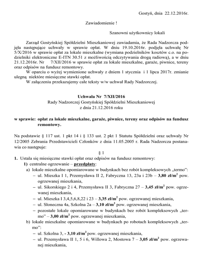 Gostyń, dnia 22.12.2016r. Zawiadomienie ! Szanowni użytkownicy lokali Zarząd Gostyńskiej Spółdzielni Mieszkaniowej zawiadamia, że Rada Nadzorcza podjęła następujące uchwały w sprawie opłat. W dniu 19.10.2016r. podjęła uchwałę Nr 5/X/2016 w sprawie opłat za lokale mieszkalne (wymiana podzielników kosztów c.o. na podzielniki elektroniczne E-ITN 30.51 z możliwością odczytywania drogą radiową), a w dniu 21.12.2016r. Nr 7/XII/2016 w sprawie opłat za lokale mieszkalne, garaże, piwnice, tereny oraz odpisów na fundusz remontowy. W oparciu o wyżej wymienione uchwały z dniem 1 stycznia i 1 lipca 2017r. zmianie ulegną niektóre miesięczne stawki opłat. W załączeniu przekazujemy całe teksty w/w uchwał Rady Nadzorczej. Uchwała Nr 7/XII/2016 Rady Nadzorczej Gostyńskiej Spółdzielni Mieszkaniowej z dnia 21.12.2016 roku w sprawie: opłat za lokale mieszkalne, garaże, piwnice, tereny oraz odpisów na fundusz remontowy. Na podstawie § 117 ust. 1 pkt 14 i § 133 ust. 2 pkt 1 Statutu Spółdzielni oraz uchwały Nr 12/2005 Zebrania Przedstawicieli Członków z dnia 11.05.2005 r. Rada Nadzorcza postanawia co następuje: §1 1. Ustala się miesięczne stawki opłat oraz odpisów na fundusz remontowy: 1) centralne ogrzewanie – przedpłaty: a) lokale mieszkalne opomiarowane w budynkach bez robót kompleksowych „termo”: ul. Mieszka I 1, Przemysława II 2, Fabryczna 13, 23a i 23b – 3,80 zł/m2 pow. ogrzewanej mieszkania, ul. Sikorskiego 2 i 4, Przemysława II 3, Fabryczna 27 – 3,45 zł/m2 pow. ogrzewanej mieszkania, ul. Mieszka I 3,4,5,6,8,22 i 23 – 3,35 zł/m2 pow. ogrzewanej mieszkania, ul. Słoneczna 4a, Szkolna 2a – 3,10 zł/m2 pow. ogrzewanej mieszkania, pozostałe lokale opomiarowane w budynkach bez robót kompleksowych „termo” – 3,00 zł/m2 pow. ogrzewanej mieszkania, b) lokale mieszkalne opomiarowane w budynkach po robotach kompleksowych „termo”: ul. Szkolna 3, - 3,10 zł/m2 pow. ogrzewanej mieszkania, ul. Przemysława II 1, 5 i 6, Willowa 2, Mostowa 7 – 3,05 zł/m2 pow. ogrzewanej mieszkania, ul. Przemysława II 4 i 7, Willowa 1, Mostowa 8 – 2,95 zł/m2 pow. ogrzewanej mieszkania, ul. Górna 42, Łokietka 1, Kolejowa 16, Willowa 3, Wrocławska 1, - 2,70 zł/m2 pow. ogrzewanej mieszkania, ul. Sikorskiego 3, 700-lecia 1,2,3,4,5,6 i 7, Mostowa 2 – 2,30 zł/m2 pow. ogrzewanej mieszkania. 2) podgrzanie wody – przedpłata – lokale mieszkalne opomiarowane 32,00 zł/m3 wody, 3) podatek od nieruchomości i teren: a) mieszkania w Gostyniu – 0,23 zł/m2 pow. użytkowej mieszkania (nie dotyczy odrębnej własności), b) mieszkania w Pudliszkach – 0,15 zł/m2 pow. użytkowej mieszkania (nie dotyczy odrębnej własności), c) garaże w Gostyniu nr 80-106 i 232-336 – 1,10 zł/m2 pow. użytkowej garażu (nie dotyczy odrębnej własności), d) garaże w Gostyniu nr 125-231 – 0,90zł /m2 pow. użytkowej garażu (nie dotyczy odrębnej własności), e) pozostałe garaże w Gostyniu – 0,80 zł/m2 pow. użytkowej garażu ( nie dotyczy odrębnej własności), f) garaże w Pudliszkach – 0,62 zł/m2 pow. użytkowej garażu (nie dotyczy odrębnej własności), g) mieszkania i garaże na zasadach odrębnej własności – 0,04 zł/m2 pow. użytkowej mieszkania lub garażu (opłata dotyczy nieruchomości stanowiących mienie Spółdzielni), 4) gospodarowanie odpadami komunalnymi – mieszkania –wg stawek opłat KZGRL, 5) gaz ryczałtowy – przedpłata – mieszkania – 10,30 zł od osoby, 6) energia elektryczna – garaże: w Gostyniu od nr 80 do 336 – 4,75 zł od garażu, pozostałe – 3,15 zł od garażu, 7) oświetlenie piwnicy – 2,05 zł od piwnicy, 8) dzierżawa gruntów: a) pod garaże - 1,60 zł/m2 gruntu, b) pozostałych: do 200 m2 – 3,66 zł/m2 gruntu, pow. 200 m2 – 1,20 zł/m2 gruntu, 9) zimna woda plus ścieki: a) lokale mieszkalne opomiarowane w Gostyniu – wg stawek opłat ZWiK Sp. z o.o. w Gostyniu, 2 b) lokale mieszkalne opomiarowane w Pudliszkach – wg stawek opłat MZWiK w Strzelcach Wielkich, c) lokale mieszkalne nieopomiarowane – równowartość 6 m3 wody i ścieków na osobę, d) abonament za wodomierze budynkowe w Pudliszkach – 0,70 zł od lokalu mieszkalnego, 10) za urządzenia gospodarstwa domowego podłączone do sieci elektrycznej w piwnicy (lodówka, zamrażarka, itp.) – 25,00 zł od urządzenia, 11) domofon 1,00 zł od urządzenia w mieszkaniu, 12) gaz ziemny w pralniach – wg wskazań licznika po aktualnie obowiązującej cenie gazu, 13) za jedno pranie przy taboretach elektrycznych lub gazowych – 8,00 zł, 14) za jedną godzinę maglowania – 7,35 zł, 15) opłata eksploatacyjna za mieszkania: a) dla osób będących członkami Spółdzielni: ul. Wrocławska1, Mieszka I 1 – 0,75 zł/m2 pow. użytkowej mieszkania, ul. Górna 4,6,8,10,12,14,16,18,20,22,24,26,28,30,32, Willowa 3, Kolejowa 16 – 0,90 zł/m2 pow. użytkowej mieszkania, ul. Mostowa 2,3,4,5, Wojska Polskiego 1,2,3,4,5,6, Witosa 7 – 1,00 zł/m2 pow. użytkowej mieszkania, Mieszka I 3,4,5,6,7,8, Mostowa 7,8, Przemysława II 1,2,3,4,5,6, Łokietka 1, os. 700-lecia 1-15,17,18, Sikorskiego 2,4, Fabryczna 13 – 1,05 zł/m2 pow. użytkowej mieszkania, ul. Sikorskiego 1,3, Górna 1,3,5,7,9, Szkolna 2a – 1,10 zł/m2 pow. użytkowej mieszkania, Willowa 1,2, Przemysława II 7, Górna 34,36,38,40,42, Mieszka I 22,23 – 1,15 zł/m2 pow. użytkowej mieszkania, Fabryczna 27 – 1,20 zł/m2 pow. użytkowej mieszkania, ul. Fabryczna 23a i 23b – 1,25 zł/m2 pow. użytkowej mieszkania, ul. Szkolna 3, Słoneczna 4a, - 1,35 zł/m2 pow. użytkowej mieszkania, b) dla osób niebędących członkami Spółdzielni stawka opłaty eksploatacyjnej za mieszkania jest wyższa o 0,05 zł/m2 pow. użytkowej mieszkania, 16) opłata eksploatacyjna za garaże: a) dla osób będących członkami Spółdzielni: garaże nr 232 – 336 – 1,20 zł/m2 pow. użytkowej garażu, garaże nr 80 – 106 – 1,10 zł/m2 pow. użytkowej garażu, garaże nr 125 – 231 