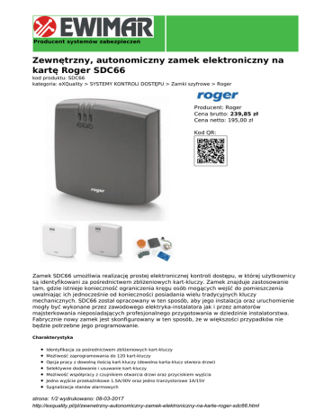 Producent systemów zabezpieczeń Zewnętrzny, autonomiczny zamek elektroniczny na kartę Roger SDC66 kod produktu: SDC66 kategoria: eXQuality > SYSTEMY KONTROLI DOSTĘPU > Zamki szyfrowe > Roger Producent: Roger Cena brutto: 239,85 zł Cena netto: 195,00 zł Kod QR: Zamek SDC66 umożliwia realizację prostej elektronicznej kontroli dostępu, w której użytkownicy są identyfikowani za pośrednictwem zbliżeniowych kart-kluczy. Zamek znajduje zastosowanie tam, gdzie istnieje konieczność ograniczenia kręgu osób mogących wejść do pomieszczenia uwalniając ich jednocześnie od konieczności posiadania wielu tradycyjnych kluczy mechanicznych. SDC66 został opracowany w ten sposób, aby jego instalacja oraz uruchomienie mogły być wykonane przez zawodowego elektryka-instalatora jak i przez amatorów majsterkowania nieposiadających profesjonalnego przygotowania w dziedzinie instalatorstwa. Fabrycznie nowy zamek jest skonfigurowany w ten sposób, że w większości przypadków nie będzie potrzebne jego programowanie. Charakterystyka Identyfikacja za pośrednictwem zbliżeniowych kart-kluczy Możliwość zaprogramowania do 120 kart-kluczy Opcja pracy z dowolną ilością kart-kluczy (dowolna karta-klucz otwiera drzwi) Selektywne dodawanie i usuwanie kart-kluczy Możliwość współpracy z czujnikiem otwarcia drzwi oraz przyciskiem wyjścia Jedno wyjście przekaźnikowe 1.5A/30V oraz jedno tranzystorowe 1A/15V Sygnalizacja stanów alarmowych strona: 1/2 wydrukowano: 08-03-2017 http://exquality.pl/pl/zewnetrzny-autonomiczny-zamek-elektroniczny-na-karte-roger-sdc66.html Możliwość montażu zamka na puszcze podtynkowej lub bezpośrednio na ścianie Praca na zewnątrz i wewnątrz budynków Zasilanie z zasilacza 12VDC lub transformatora 12VAC Ochrona antysabotażowa (tamper) Znak CE W zestawie: Zamek SDC66 Transformator zasilający Puszka podtynkowa z kompletem wkrętów mocujących Karta programująca Master Karta-klucz (5 szt.) Instrukcja obsługi Dostępne wersje i oznaczenia SDC66-G-SET Obudowa ciemnoszara SDC66-W-SET Obudowa biała SDC66-S-SET Obudowa srebrny metalik strona: 2/2 wydrukowano: 08-03-2017 http://exquality.pl/pl/zewnetrzny-autonomiczny-zamek-elektroniczny-na-karte-roger-sdc66.html