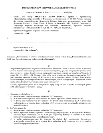 POROZUMIENIE W SPRAWIE SAMOFAKTUROWANIA zawarte w Poznaniu w dniu ........................ r. pomiędzy: 1. Spółką pod firmą: SOUFFLET AGRO POLSKA spółka z ograniczoną odpowiedzialnością z siedzibą w Poznaniu, ul. Szwajcarska 13, 61-285 Poznań, wpisaną do rejestru przedsiębiorców Krajowego Rejestru Sądowego prowadzonego przez Sąd Rejonowy Poznań – Nowe Miasto i Wilda w Poznaniu, VIII Wydział Gospodarczy Krajowego Rejestru Sądowego pod numerem: 0000430739, wysokość kapitału zakładowego: 5.000,00 zł; NIP: 782-25-51-391, REGON: 302164363, reprezentowaną przez: Stéphane Hervouin - Prokurent zwana dalej: „SAP”, a 2. .................................................................................................................................. .................................................................................................................................. reprezentowanym przez ........................................ zwany dalej: „Sprzedawcą”. Niniejsze „Porozumienie w sprawie samofakturowania” zwane będzie dalej „Porozumieniem”, zaś SAP oraz Sprzedawca zwani będą wspólnie „Stronami”. §1 1. Na podstawie przepisów Rozporządzenia Ministra Finansów z dnia 28 marca 2011 r. w sprawie zwrotu podatku niektórym podatnikom, wystawiania faktur, sposobu ich przechowywania oraz listy towarów i usług, do których nie mają zastosowania zwolnienia od podatku od towarów i usług (Dz. U. z 2011 r., Nr 68, poz. 360 z późn. zm.), niniejszym Sprzedawca upoważnia SAP jako nabywcę towarów i usług od Sprzedawcy, do wystawiania faktur i innych dokumentów rozliczeniowych, w szczególności faktur zaliczkowych, faktur korygujących i duplikatów faktur (dalej jako: „Faktury”), w imieniu i na rzecz Sprzedawcy. 2. Faktury wystawiane przez SAP uwzględniać będą sumy należne z tytułu zakupionych przez SAP od Sprzedawcy towarów i usług. §2 1. Sprzedawca oświadcza, że: a) posiada status zarejestrowanego podatnika VAT czynnego, b) w okresie obowiązywania Porozumienia nie będzie wystawiać Faktur na rzecz SAP, c) w trybie natychmiastowym (w terminie do dwóch dni) poinformuje SAP w przypadku wykreślenia go z rejestru jako podatnika VAT czynnego oraz w przypadku zbycia swego przedsiębiorstwa. 2. SAP oświadcza, że: a) posiada status zarejestrowanego podatnika VAT czynnego, b) będzie wystawiać Faktury zgodnie z obowiązującymi przepisami, w szczególności Faktury zawierać będą informację, że to SAP jest wystawcą Faktury w imieniu i na rzecz Sprzedawcy oraz adnotację „samofakturowanie”, c) w trybie natychmiastowym (w terminie do dwóch dni) poinformuje Sprzedawcę w przypadku wykreślenia go z rejestru jako podatnika VAT czynnego oraz w przypadku zbycia swego przedsiębiorstwa. 1 §3 1. Wystawiane przez SAP Faktury będą przesyłane Sprzedawcy przez SAP przy wykorzystaniu (niepotrzebne skreślić): a) poczty elektronicznej (e-mail) - w tym przypadku zastosowanie znajdzie § 4 Porozumienia b) FAX-u - w tym przypadku zastosowanie znajdzie § 5 Porozumienia §4 1. Niniejszy § 4 Porozumienia ma zastosowanie w przypadku wyboru przez Strony przesyłania Faktur z wykorzystaniem poczty elektronicznej (e-mail). 2. Faktury przesyłane Sprzedawcy przez SAP przy wykorzystaniu poczty elektronicznej (e-mail) będą przesyłane w formacie pliku PDF. 3. Sprzedawca wyraża zgodę i akceptuje sposób przesyłania Faktur przez SAP w formacie plików PDF przy wykorzystaniu poczty elektronicznej (e-mail). 4. Strony zgodnie ustalają, że SAP będzie przesyłać Sprzedawcy Faktury przy wykorzystaniu następujących adresów poczty elektronicznej (e-mail): .......................................................................................................................................................... .......................................................................................................................................................... 5. Strony zgodnie ustalają, że SAP będzie przesyłać Faktury na następujący adres poczty elektronicznej (e-mail) Sprzedawcy: 6. 7. 8. 9. .......................................................................................................................................................... Zmiana adresów poczty elektronicznej (e-mail), o których mowa w § 4 ust. 4 oraz ust. 5 Porozumienia wymaga zawarcia aneksu do niniejszego Porozumienia. SAP zobowiązuje się przesyłać Faktury do Sprzedawcy niezwłocznie po ich wystawieniu, nie później niż do 5 (słownie: pięć) dnia miesiąca następującego po miesiącu, w którym wystawiono Faktury. W treści wiadomości elektronicznej (e-mail), do której załączona będzie Faktura (Faktury) wskazane zostaną numer oraz data wystawienia Faktury (Faktur). Sprzedawca zobowiązuje się dokonywać zatwierdzania Faktur otrzymywanych od SAP w terminie do 7 (słownie: siedem) dni od dnia następującego po dniu otrzymania Faktury (Faktur), przy czym Strony jednocześnie zgodnie ustalają, że brak uwag Sprzedawcy co do treści wystawionej i przesłanej przez SAP Faktury (Faktur), przedstawionych SAP przez Sprzedawcę w terminie 7 (słownie: siedem) dni od dnia następującego po dniu otrzymania Faktury (Faktur), będzie rozumiany jako (będzie oznaczać) zatwierdzenie Faktury (Faktur) przez Sprzedawcę. Dokonanie zatwierdzenia Faktury (Faktur) przez Sprzedawcę, o którym mowa w § 4 ust. 8 Porozumienia może nastąpić poprzez przesłanie wiadomości elektronicznej (e-mail), w szczególności zwrotnej wiadomości elektronicznej (e-mail) ze stosowną informacją (np. „brak uwag”, „zatwierdzam Faktury”, itp.), z odpowiednim uwzględnieniem § 4 ust. 4 oraz ust. 5 Porozumienia. §5 1. Niniejszy § 5 Porozumienia ma zastosowanie w przypadku wyboru przez Strony przesyłania Faktur przy wykorzystaniu FAX-u. 2. Sprzedawca wyraża zgodę i akceptuje sposób przesyłania Faktur przez SAP przy wykorzystaniu FAX-u. 2 3. Strony 