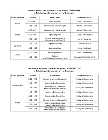 Harmonogram zajęć w ramach Programu ALTERNATYWA w Publicznym Gimnazjum nr 1 w Puławach Dzień tygodnia Godzina Nazwa zajęć Osoba prowadząca 8.00-8.45 Język angielski Agata Czech-Dysput 13.50-14.35 Matematyka z informatyką Dorota Tadasiewicz 8.00-8.45 Matematyka z informatyką Dorota Tadasiewicz 8.00-8.45 Język angielski Agata Czech-Dysput 14.35-16.05 Zajęcia dziennikarskie z elementami profilaktyki Anna Filipowska 13.50-14.35 Liga piłki nożnej Jarosław Mazur 13.50-14.35 Język angielski Anna Jakubczyk 10.00-10.45 Telewizja szkolna Anna Orkiszewska 11.30-13.00 Zajęcia profilaktyczno-terapeutyczne Agnieszka Nita-Kościelniak Wtorek Środa Czwartek Sobota Harmonogram pracy opiekuna Programu ALTERNATYWA w Publicznym Gimnazjum nr 1 w Puławach Dzień tygodnia Godzina Rodzaj zajęć Osoba prowadząca 12.25-13.10 Zajęcia grupowe dla uczniów Grażyna Kraszewska 13.10-13.55 Konsultacje dla uczniów Grażyna Kraszewska 13.55-14.40 Konsultacje dla rodziców Konsultacje dla nauczycieli Grażyna Kraszewska 14.40-15.35 Sprawy administracyjne Grażyna Kraszewska 12.25-13.10 Konsultacje dla uczniów Grażyna Kraszewska 13.10-13.55 Zajęcia grupowe dla uczniów Grażyna Kraszewska 13.55-14.40 Konsultacje dla uczniów Sprawy administracyjne Grażyna Kraszewska 14.40-15.35 Konsultacje dla rodziców Konsultacje dla nauczycieli Grażyna Kraszewska Poniedziałek Piątek