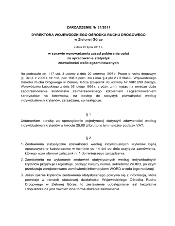 ZARZĄDZENIE Nr 31/2011 DYREKTORA WOJEWÓDZKIEGO OŚRODKA RUCHU DROGOWEGO w Zielonej Górze z dnia 25 lipca 2011 r. w sprawie wprowadzenia zasad pobierania opłat za opracowanie statystyk zdawalności osób egzaminowanych Na podstawie art. 117 ust. 3 ustawy z dnia 20 czerwca 1997 r. Prawo o ruchu drogowym (tj. Dz.U. z 2005 r. Nr 108, poz. 908 z późn. zm.) oraz § 4 pkt 2 i 3 Statutu Wojewódzkiego Ośrodka Ruchu Drogowego w Zielonej Górze (załącznik do uchwały Nr VIII/12/99 Zarządu Województwa Lubuskiego z dnia 09 lutego 1999 r. z późn. zm.), mając na uwadze duże zapotrzebowanie środowiska zainteresowanego szkoleniem i egzaminowaniem kandydatów na kierowców, na dostęp do statystyk zdawalności według indywidualnych kryteriów, zarządzam, co następuje: §1 Ustanawiam stawkę za sporządzenie pojedynczej statystyki zdawalności według indywidualnych kryteriów w kwocie 25,00 zł brutto w tym należny podatek VAT. §2 1. Zestawienia statystyczne zdawalności według indywidualnych kryteriów będą opracowywane każdorazowo w terminie do 14 dni od dnia przyjęcia zamówienia, którego wzór stanowi załącznik nr 1 do niniejszego zarządzenia. 2. Zamówienia na wykonanie zestawień statystycznych według indywidualnych kryteriów przyjmuje i rejestruje, nadając kolejny numer, sekretariat WORD, po czym przekazuje zarejestrowane zamówienie informatykom WORD w celu jego realizacji. 3. Jeżeli zakres kryteriów zestawienia statystycznego pokrywa się z informacją, która powstaje w ramach statutowej działalności Wojewódzkiego Ośrodka Ruchu Drogowego w Zielonej Górze, to zestawienie udostępniane jest bezpłatnie i dopuszczalna jest również inna forma złożenia zamówienia. §3 1. Zamówienia podlegają realizacji i skalkulowaniu przez informatyka WORD. 2. Zrealizowane zestawienia statystyczne są przekazywane do Sekretariatu, a zamówienie z wypełnioną kalkulacją przekazywane jest do kasy WORD. 3. Odbiór przygotowanych zestawień statystycznych następuje w sekretariacie WORD po okazaniu wystawionej w kasie WORD faktury VAT, która w treści powinna zawierać numer zamówienia. §4 Zarządzenie wchodzi w życie z dniem 01 sierpnia 2011r.