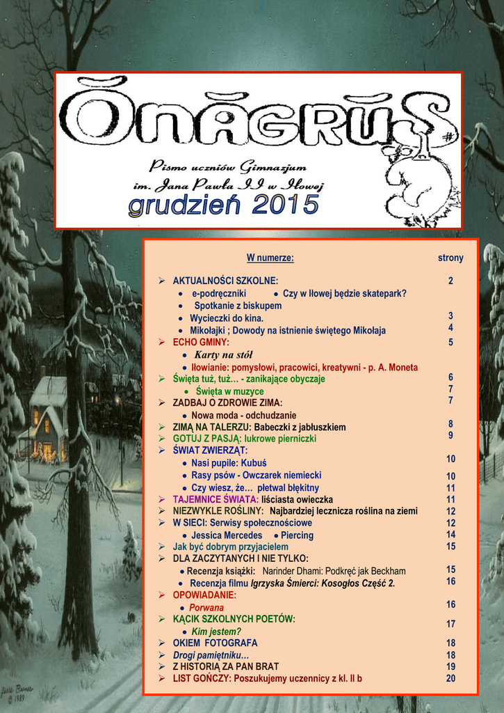 W numerze: AKTUALNOŚCI SZKOLNE: e-podręczniki Czy w Iłowej będzie skatepark? Spotkanie z biskupem Wycieczki do kina. Mikołajki ; Dowody na istnienie świętego Mikołaja ECHO GMINY: Karty na stół Iłowianie: pomysłowi, pracowici, kreatywni - p. A. Moneta Święta tuż, tuż… - zanikające obyczaje Święta w muzyce ZADBAJ O ZDROWIE ZIMA: Nowa moda - odchudzanie ZIMĄ NA TALERZU: Babeczki z jabłuszkiem GOTUJ Z PASJĄ: lukrowe pierniczki ŚWIAT ZWIERZĄT: Nasi pupile: Kubuś Rasy psów - Owczarek niemiecki Czy wiesz, że… płetwal błękitny TAJEMNICE ŚWIATA: liściasta owieczka NIEZWYKLE ROŚLINY: Najbardziej lecznicza roślina na ziemi W SIECI: Serwisy społecznościowe Jessica Mercedes Piercing Jak być dobrym przyjacielem DLA ZACZYTANYCH I NIE TYLKO: Recenzja książki: Narinder Dhami: Podkręć jak Beckham Recenzja filmu Igrzyska Śmierci: Kosogłos Część 2. OPOWIADANIE: Porwana KĄCIK SZKOLNYCH POETÓW: Kim jestem? OKIEM FOTOGRAFA Drogi pamiętniku… Z HISTORIĄ ZA PAN BRAT LIST GOŃCZY: Poszukujemy uczennicy z kl. II b strony 2 3 4 5 6 7 7 8 9 10 10 11 11 12 12 14 15 15 16 16 17 18 18 19 20 Z ŻYCIA SZKOŁY e-podręczniki E-podręczniki dobre są do przygotowania się do konkursów, powtórzenia wiadomości przed egzaminami. Podręczniki dla gimnazjum dostępne są na stronie https://www.epodreczniki.pl/front/education/3. Wejdź na stronę i korzystaj!!! Czy w Iłowej będzie skatepark? - debata z radnymi 26 listopada w naszej szkole gościli członkowie Rady Miejskiej w Iłowej. Zostali zaproszeni na dyskusję z uczniami. Gimnazjaliści przedstawili pomysł stworzenia skateparku w Iłowej. Byłoby to bezpieczne miejsce do jazdy na rolkach czy deskorolce lub po prostu spotkań. Pomysł został pozytywnie przyjęty przez radnych. Z powodu dużych kosztów wybudowania skateparku na razie nie wiadomo, czy powstanie, a jeśli tak, budowa zacznie się dopiero za kilka lat. Soul Lemon Spotkanie z Biskupem W dniu 7 grudnia 2015r. nasze gimnazjum odwiedził biskup Paweł Socha. Przybył do Iłowej z okazji przystąpienia do bierzmowania gimnazjalistów z klas II i III. Biskup pojawił się na 3 lekcji i został zaproszony do świetlicy, gdzie czekali nasi uczniowie ubrani w galowe stroje. W momencie wejścia ks. Biskupa wszyscy zaczęli śpiewać „Barkę”, ulubioną pieśń Papieża Jana Pawła II. Następnie gość obejrzał prezentację przypominającą nadanie naszemu gimnazjum imienia Jana Pawła II, które odbyło się 16 października 2007 r. Odpowiedział także na pytania, które przygotowaliśmy dla niego wraz z księdzem Mariuszem na lekcjach religii. W prezencie od uczniów otrzymał piękną bombkę. Gość nie zabawił długo, ponieważ tego dnia czekało na niego wiele obowiązków. Odwiedził także szkolę podstawową oraz spotkał się z pracownikami urzędu miasta. Był to interesujący i ciekawy czas spędzony w szkole. Kuchcik Wycieczki do kina 26 listopada 2015 r., odbyła się wycieczka klas pierwszych do kina na film Igrzyska Śmierci: Kosogłos Część 2. Opiekunami byli pani Magdalena Góra, pani Ewa Gubernator i pan Daniel Graczyk. Po 7 lekcji wszyscy zebrali się przed szkołą i punktualnie o 1430 wyjechali autokarem do Zielonej Góry. Po przybyciu do Focus Parku uczniowie mieli 20 minut wolnego czasu. Następnie rozpoczął się film. Był on dość długi, trwał ponad 2 godziny. Do Iłowej uczestnicy wrócili o 20. Film bardzo podobał się młodzieży i wszyscy mamy nadzieję na więcej takich wyjazdów. Mikołajkowe wycieczki 3 grudnia rozpoczęły się mikołajkowe wyjazdy do kina w Zielonej Górze. Pod opieką wychowawców – p. Agnieszki Szubały, p. Danuty Szeszo i p. Dominiki Świder - klasy drugie wybrały się na film Listy do M. 2 w reżyserii Macieja Dejczera. Ponieważ podróż przebiegła sprawnie, seans filmowy poprzedziły przedświąteczne zakupy. Największym powodzeniem cieszył się Empik, w którym wielu uczniów zdołało kupić gwiazdkowe prezenty dla bliskich. Potem jeszcze obowiązkowy zakup popcornu oraz coli i zanurzenie w świecie komedii romantycznej. Zabawne sytuacje przeplatały się z momentami wzruszającymi a nawet bardzo smutnymi. Na pewno atutem filmu była gra aktorów: Agnieszki Dygant, Agnieszki Wagner, Piotra Adamczyka, Macieja Stuhra i Tomasza Karolaka. Opinie o komedii opowiadającej o losach mieszkańców Warszawy podczas świąt Bożego Narodzenia były podzielone. Większości uczniów film się podobał. Może właśnie dlatego, że nie wszystko w nim było świątecznie słodkie. Jak to w życiu bywa. Wszyscy natomiast byli zadowoleni z wyjazdu. R., I., SL. *** Uczniowie klas I także z repertuaru kinowego wybrali Listy do M. 2 i 9 grudnia pojechali do Zielonej Góry pod opieką p. Danuty Holskiej, p. Jolanty Dąbrowskiej i p. Czesława Dąbrowskiego. Tym razem widzowie mieli podzielone zdania. Część bardzo dobrze się bawiła, natomiast sporej grupie film nie przypadł do gustu. Niewątpliwą atrakcją była wizyta w Centrum Przyrodniczym Keplera. Największe zainteresowanie wzbudziła możliwość oglądania filmów w 3D, oglądanie promieni plazmy rozchodzących się z kuli oraz obserwowanie, jak pracują płuca. Ciekawostek było o wiele więcej. Jeden z uczniów powiedział, że musi się tam wybrać z rodzicami, żeby oglądnąć i doświadczyć wszystkiego, co centrum oferuje zwiedzającym. Redakcja *** Klasy III b i c na mikołajkową wycieczkę do kina wybrały się 11 grudnia. Opiekunami byli p. Beata Jakubowicz i p. Mieczysław Jakubowicz. Spod szkoły wyruszyliśmy po drugiej lekcji. Podróż w autobusie minęła dość spokojnie i cicho. Do kina przyjechaliśmy wcześniej niż było planowane. Na ekranie grali 3 Kochajmy się od święta – amerykańską komedię z Alanem Arkinem, Johnem Goodmanem i Diane Keaton w rolach głównych. Komedia okazała się być bardzo zabawna i wiele osób naprawdę obejrzało ją z zaciekawieniem. Po skończeniu filmu mieliśmy chwilę czasu 