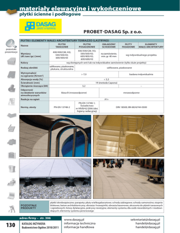materiały elewacyjne i wykończeniowe m płytki ścienne i podłogowe PROBET-DASAG Sp. z o.o. PŁYTKI I ELEMENTY MAŁEJ ARCHITEKTURY TERRAZZO (LASTRYKO) Nazwa pozostałe prezentacje Wymiary (dł./szer./gr.) [mm] PŁYTKI TARASOWE PŁYTKI POSADZKOWE OKŁADZINY SCHODOWE 400/400/(38; 43); 500/500/43; 600/400/43 300/300/(28; 35); 500/500/43; 600/400/43; 600/600/43 na zamówienie, min. gr. 40 mm Kolory Rodzaj obróbki wg indywidualnego projektu szlifowane, piaskowane > 7,0 Absorpcja wody [%] Ścieralność [mm] Obciążenie niszczące [kN] badana indywidualnie < 5,5 19 (metoda Capona) 3,2 Odporność na działanie warunków atmosferycznych – klasa B (mrozoodporne) Reakcja na ogień mrozoodporne A1fl Normy, atesty PN-EN 13748-2 PN-EN 13748-1; Świadectwo nr HR/B/42/2006 (dot. higieny radiacyjnej) DIN 18500; BN-80/6744-0500 płytki iskrobezpieczne; parapety; płyty wielkogabarytowe; schody zabiegowe; schody samonośne; stopnie blokowe; beton architektoniczny; obrzeża i krawężniki; obrzeża basenowe; akcesoria do płytek tarasowych i ogrodowych; listwy dylatacyjne, pokrywy rewizyjne; elementy systemu dla osób niewidomych i niedowidzących; elementy systemu peronowego adres firmy – str. 306 130 ELEMENTY MAŁEJ ARCHITEKTURY wg dostępnych serii lub na indywidualne zamówienie (tylko duże projekty) szlifowane, piaskowane, płukane, strukturalne Wytrzymałość na zginanie [N/mm2] POZOSTAŁE PRODUKTY PŁYTY FASADOWE KATALOG INŻYNIERA Budownictwo Ogólne 2010/2011 www.dasag.pl informacja techniczna informacja handlowa [email protected] [email protected] [email protected]