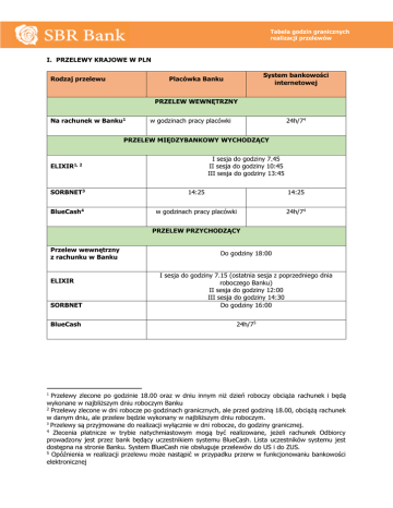 Tabela godzin granicznych realizacji przelewów I. PRZELEWY KRAJOWE W PLN Rodzaj przelewu System bankowości internetowej Placówka Banku PRZELEW WEWNĘTRZNY Na rachunek w Banku1 w godzinach pracy placówki 24h/74 PRZELEW MIĘDZYBANKOWY WYCHODZĄCY I sesja do godziny 7.45 II sesja do godziny 10:45 III sesja do godziny 13:45 ELIXIR1, 2 SORBNET3 14:25 14:25 BlueCash4 w godzinach pracy placówki 24h/74 PRZELEW PRZYCHODZĄCY Przelew wewnętrzny z rachunku w Banku Do godziny 18:00 SORBNET I sesja do godziny 7.15 (ostatnia sesja z poprzedniego dnia roboczego Banku) II sesja do godziny 12:00 III sesja do godziny 14:30 Do godziny 16:00 BlueCash 24h/75 ELIXIR Przelewy zlecone po godzinie 18.00 oraz w dniu innym niż dzień roboczy obciąża rachunek i będą wykonane w najbliższym dniu roboczym Banku 2 Przelewy zlecone w dni robocze po godzinach granicznych, ale przed godziną 18.00, obciążą rachunek w danym dniu, ale przelew będzie wykonany w najbliższym dniu roboczym. 3 Przelewy są przyjmowane do realizacji wyłącznie w dni robocze, do godziny granicznej. 4 Zlecenia płatnicze w trybie natychmiastowym mogą być realizowane, jeżeli rachunek Odbiorcy prowadzony jest przez bank będący uczestnikiem systemu BlueCash. Lista uczestników systemu jest dostępna na stronie Banku. System BlueCash nie obsługuje przelewów do US i do ZUS. 5 Opóźnienia w realizacji przelewu może nastąpić w przypadku przerw w funkcjonowaniu bankowości elektronicznej 1 Tabela godzin granicznych realizacji przelewów II. PRZELEWY ZAGRANICZNE LUB PRZELWY KRAJOWE W WALUCIE OBCEJ Rodzaj przelewu Data waluty Placówka Banku System bankowości internetowej PRZELEW WEWNĘTRZNY Na rachunek w Banku D 14:30 14:30 PRZELEW WYCHODZĄCY Przekaz w trybie standardowym: SEPA, polecenie wypłaty w walucie EUR D+1 14:30 14:30 Pozostałe polecenia wypłaty D+2 14:30 14:30 D 12:00 12:00 Przekaz w trybie pilnym (EUR, USD, GBP) PRZELEW PRZYCHODZĄCY Na rachunek w Banku D 14:30 Przelew wychodzący zlecony po godzinie granicznej oraz w dniu innym niż dzień roboczy obciążą rachunek klienta w następnym dniu roboczym, a przelew będzie wykonany z datą waluty ustaloną jak dla przelewu złożonego w następnym dniu roboczym.