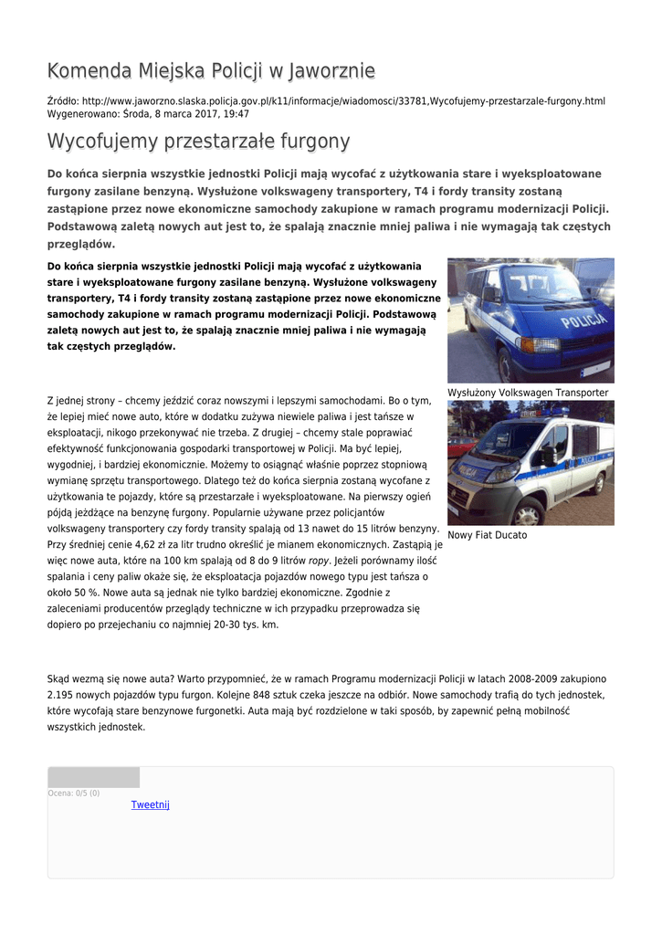 Komenda Miejska Policji w Jaworznie Źródło: http://www.jaworzno.slaska.policja.gov.pl/k11/informacje/wiadomosci/33781,Wycofujemy-przestarzale-furgony.html Wygenerowano: Środa, 8 marca 2017, 19:47 Wycofujemy przestarzałe furgony Do końca sierpnia wszystkie jednostki Policji mają wycofać z użytkowania stare i wyeksploatowane furgony zasilane benzyną. Wysłużone volkswageny transportery, T4 i fordy transity zostaną zastąpione przez nowe ekonomiczne samochody zakupione w ramach programu modernizacji Policji. Podstawową zaletą nowych aut jest to, że spalają znacznie mniej paliwa i nie wymagają tak częstych przeglądów. Do końca sierpnia wszystkie jednostki Policji mają wycofać z użytkowania stare i wyeksploatowane furgony zasilane benzyną. Wysłużone volkswageny transportery, T4 i fordy transity zostaną zastąpione przez nowe ekonomiczne samochody zakupione w ramach programu modernizacji Policji. Podstawową zaletą nowych aut jest to, że spalają znacznie mniej paliwa i nie wymagają tak częstych przeglądów. Z jednej strony – chcemy jeździć coraz nowszymi i lepszymi samochodami. Bo o tym, Wysłużony Volkswagen Transporter że lepiej mieć nowe auto, które w dodatku zużywa niewiele paliwa i jest tańsze w eksploatacji, nikogo przekonywać nie trzeba. Z drugiej – chcemy stale poprawiać efektywność funkcjonowania gospodarki transportowej w Policji. Ma być lepiej, wygodniej, i bardziej ekonomicznie. Możemy to osiągnąć właśnie poprzez stopniową wymianę sprzętu transportowego. Dlatego też do końca sierpnia zostaną wycofane z użytkowania te pojazdy, które są przestarzałe i wyeksploatowane. Na pierwszy ogień pójdą jeżdżące na benzynę furgony. Popularnie używane przez policjantów volkswageny transportery czy fordy transity spalają od 13 nawet do 15 litrów benzyny. Przy średniej cenie 4,62 zł za litr trudno określić je mianem ekonomicznych. Zastąpią je Nowy Fiat Ducato więc nowe auta, które na 100 km spalają od 8 do 9 litrów ropy. Jeżeli porównamy ilość spalania i ceny paliw okaże się, że eksploatacja pojazdów nowego typu jest tańsza o około 50 %. Nowe auta są jednak nie tylko bardziej ekonomiczne. Zgodnie z zaleceniami producentów przeglądy techniczne w ich przypadku przeprowadza się dopiero po przejechaniu co najmniej 20-30 tys. km. Skąd wezmą się nowe auta? Warto przypomnieć, że w ramach Programu modernizacji Policji w latach 2008-2009 zakupiono 2.195 nowych pojazdów typu furgon. Kolejne 848 sztuk czeka jeszcze na odbiór. Nowe samochody trafią do tych jednostek, które wycofają stare benzynowe furgonetki. Auta mają być rozdzielone w taki sposób, by zapewnić pełną mobilność wszystkich jednostek. Ocena: 0/5 (0) Tweetnij