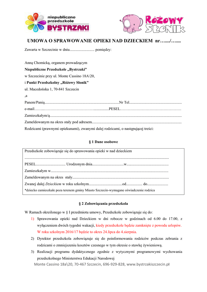 UMOWA O SPRAWOWANIE OPIEKI NAD DZIECKIEM nr…..../….... Zawarta w Szczecinie w dniu.......................... pomiędzy: Anną Chomicką, organem prowadzącym Niepubliczne Przedszkole „Bystrzaki” w Szczecinie przy ul. Monte Cassino 18A\20, i Punkt Przedszkolny „Różowy Słonik” ul. Macedońska 1, 70-841 Szczecin ,a Panem/Panią..............................................................................Nr Tel....................................................... e-mail……..…………………………………................PESEL………………………………………… Zamieszkałym/ą.......................................................................................................................................... Zameldowanym na okres stały pod adresem.............................................................................................. Rodzicami (prawnymi opiekunami), zwanymi dalej rodzicami, o następującej treści: § 1 Dane osobowe Przedszkole zobowiązuje się do sprawowania opieki w nad dzieckiem ....................................................................................................................................................... PESEL............................... Urodzonym dnia.................................w............................................ Zamieszkałym w........................................................................................................................... Zameldowanym na okres stały..................................................................................................... Zwanej dalej Dzieckiem w roku szkolnym...................................od................. do...................... *dziecko zamieszkałe poza terenem gminy Miasto Szczecin-wymagane oświadczenie rodzica § 2 Zobowiązania przedszkola W Ramach określonego w § I przedmiotu umowy, Przedszkole zobowiązuje się do: 1) Sprawowania opieki nad Dzieckiem w dni robocze w godzinach od 6.00 do 17.00, z wyłączeniem dwóch tygodni wakacji, kiedy przedszkole będzie zamknięte z powodu urlopów. W roku szkolnym 2016/17 będzie to okres 24.lipca do 4.sierpnia. 2) Dyrektor przedszkola zobowiązuje się do poinformowania rodziców podczas zebrania z rodzicami o zmniejszeniu kosztów czesnego w tym okresie o stawkę żywieniową. 3) Realizacji programu dydaktycznego zgodnie z wytycznymi programowymi wychowania przedszkolnego Ministerstwa Edukacji Narodowej Monte Cassino 18a\20, 70-467 Szczecin, 696-929-828, www.bystrzakiszczecin.pl 4) zapewnienia wyżywienia: śniadanie, I danie obiadowe i II danie obiadowe, 5) Prowadzenie zajęć dydaktycznych przez wykwalifikowany personel. 6) Ubezpieczenie dziecka od NW 7) Do wyposażenia przedszkola w artykuły sanitarne, artykuły plastyczne, zabawki, pomoce dydaktyczne 8) Bezpłatnych zajęć dodatkowych odbywających się na terenie przedszkola tj. rytmika, język obcy, porady logopedyczne dla dzieci z trudnościami wymowy, zajęcia specjalistyczne dla dzieci niepełnosprawnych. § 3 Zobowiązania rodziców Rodzice (prawni opiekunowie) zobowiązani są do : 1. Przyprowadzania zdrowego Dziecka do przedszkola, nie później niż o 9.00 2. Osobistego odbierania dziecka lub przez osoby upoważnione w godzinach od 14.00 do 17.00 do odbioru dziecka upoważniam: (proszę podać imię i nazwisko oraz stopień pokrewieństwa) ..................................................................................................................... ..................................................................................................................... 3. Po każdej przebytej chorobie dziecka prosimy o przynoszenie zaświadczenia od lekarza, iż dziecko jest zdrowe i może uczęszczać do przedszkola Przestrzegania obowiązującego w Przedszkolu Regulaminu i stosowania się do podawanych przez Dyrektora komunikatów. 4. Współdziałania z przedszkolem w zakresie wychowawczym 5. Regularnego wnoszenia opłaty za Przedszkole o której mowa w & 4 § 4 Oplaty 1. Rodzice zobowiązani są do wnoszenia w czasie trwania całego roku opłaty w wysokości ………………………………………………………………………………………………….. ustalonej przez Dyrektora Przedszkola, przy czym oplata ta może ulec zmianie przez okres obowiązywania umowy, o czym rodzice zostaną powiadomieni nie później niż miesiąc przed planowaną zmianą. 2. Opłata za przedszkole jest stała i nie podlega zwrotowi i nie zmniejsza się w przypadku choroby lub urlopowania dziecka. Monte Cassino 18a\20, 70-467 Szczecin, 696-929-828, www.bystrzakiszczecin.pl 3. Rodzic zobowiązany jest w dniu zapisu dziecka wpłacić wpisowe w wysokości 300, które zajmuje miejsce dla dziecka w przedszkolu. Kwota ta pokrywa kosz ubezpieczenia dziecka NNW, i podręczniki z podstawy programowej. 4. Wpisowe jest bezzwrotne. 5. Opłaty, o której mowa w pkt. 1 wnoszona winna być do 5-go dnia każdego miesiąca przelewem na konto wskazane przez właściciela przedszkola. ING 50 1050 1559 1000 0090 9011 0785 W przypadku niezapłacenia czesnego w terminie, zostanie naliczona opłata dodatkowa 1PLN dziennie za każdy dzień zwłoki. 6. Opłata za przedszkole wnoszona jest przed 12 m-cy w roku, bez względu na miesiące wakacyjne. 7. W przypadku odebrania dziecka po godzinie 17.00 rodzic zobowiązany jest zapłacić 10 zł za każdą rozpoczętą godzinę po 17.00. § 5 Rozwiązanie umowy 1. Niniejsza umowa może zostać rozwiązana w przypadku braku wniesienia opłaty, o której mowa w & 4 co najmniej w jednym miesiącu. 2. Umowę może rozwiązać każda ze stron z zachowaniem miesięcznego okresu wypowiedzenia z zastrzeżeniem od 1. następnego miesiąca. § 6 Regulacja prawna W kwestiach spornych nie uregulowanych niniejszą umową zastosowanie mają przepisy Kodeksu Cywilnego. Wyrażam zgodę na przetwarzanie danych osobowych zawartych w umowie wyłącznie na potrzeby Niepublicznego Przedszkola BYST