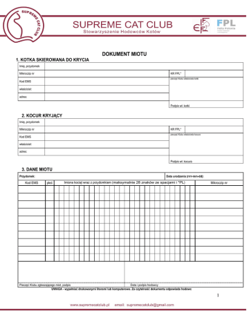 1. KOTKA SKIEROWANA DO KRYCIA DOKUMENT MIOTU Imię, przydomek Mikroczip nr KR FPL* pieczęć Klubu właściciela kotki Kod EMS właściciel: adres: Podpis wł. kotki 2. KOCUR KRYJĄCY Imię, przydomek Mikroczip nr KR FPL* pieczęć Klubu właściciela kocura Kod EMS właściciel: adres: Podpis wł. kocura 3. DANE MIOTU Przydomek: Kod EMS Data urodzenia (rrrr-mm-dd): płeć Imiona kociąt wraz z przydomkiem (maksymalnie 28 znaków ze spacjami i *PL) Mikroczip nr Pieczęć Klubu zgłaszającego miot, podpis Data i podpis hodowcy UWAGA - wypełniać drukowanymi literami lub komputerowo. Za czytelność dokumentu odpowiada hodowc 1