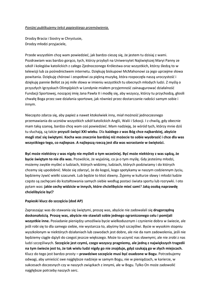 Poniżej publikujemy tekst papieskiego przemówienia. Drodzy Bracia i Siostry w Chrystusie, Drodzy młodzi przyjaciele, Przede wszystkim chcę wam powiedzieć, jak bardzo cieszę się, że jestem tu dzisiaj z wami. Pozdrawiam was bardzo gorąco, tych, którzy przybyli na Uniwersytet Najświętszej Maryi Panny ze szkół i kolegiów katolickich z całego Zjednoczonego Królestwa oraz wszystkich, którzy śledzą to w telewizji lub za pośrednictwem internetu. Dziękuję biskupowi McMahonowi za jego uprzejme słowa powitania. Dziękuję chórowi i zespołowi za piękną muzykę, która rozpoczęła naszą uroczystość i dziękuję pannie Bellot za jej miłe słowa w imieniu wszystkich tu obecnych młodych ludzi. Z myślą o przyszłych Igrzyskach Olimpijskich w Londynie miałem przyjemność zainaugurować działalność Fundacji Sportowej, noszącej imię Jana Pawła II i modlę się, aby wszyscy, którzy tu przychodzą, głosili chwałę Boga przez swe działania sportowe, jak również przez dostarczanie radości samym sobie i innym. Nieczęsto zdarza się, aby papież a nawet ktokolwiek inny, miał możność jednoczesnego przemawiania do uczniów wszystkich szkół katolickich Anglii, Walii i Szkocji. I z chwilą, gdy obecnie mam taką szansę, bardzo chcę wam coś powiedzieć. Mam nadzieję, że wśród tych, którzy mnie dziś tu słuchają, są także przyszli święci XXI wieku. Dla każdego z was Bóg chce najbardziej, abyście mogli stać się świętymi. Kocha was znacznie bardziej niż możecie to sobie wyobrazić i chce dla was wszystkiego tego, co najlepsze. A najlepszą rzeczą jest dla was wzrastanie w świętości. Być może niektórzy z was nigdy nie myśleli o tym wcześniej. Być może niektórzy z was sądzą, że bycie świętym to nie dla was. Pozwólcie, że wyjaśnię, co ja o tym myślę. Gdy jesteśmy młodzi, możemy zwykle myśleć o ludziach, których widzimy, ludziach, których podziwiamy i do których chcemy się upodobnić. Może się zdarzyć, że do kogoś, kogo spotykamy w naszym codziennym życiu, będziemy żywić wielki szacunek. Lub będzie to ktoś sławny. Żyjemy w kulturze sławy i młodzi ludzie często są zachęcani do kształtowania samych siebie według postaci świata sportu lub rozrywki. I oto pytam was: jakie cechy widzicie w innych, które chcielibyście mieć sami? Jaką osobą naprawdę chcielibyście być? Papieski klucz do szczęścia (dod AP) Zapraszając was do stawania się świętymi, proszę was, abyście nie zadowalali się drugorzędną doskonałością. Proszę was, abyście nie stawiali sobie jednego ograniczonego celu i pomijali wszystkie inne. Posiadanie pieniędzy umożliwia bycie wielkodusznym i czynienie dobra w świecie, ale jeśli robi się to dla samego siebie, nie wystarcza to, abyśmy byli szczęśliwi. Bycie w wysokim stopniu wyszkolonym w niektórych działaniach lub zawodach jest dobre, ale nie da nam zadowolenia, jeśli nie będziemy ciągle dążyli do czegoś jeszcze większego. Może to uczynić nas sławnymi, ale nie zrobi z nas ludzi szczęśliwych. Szczęście jest czymś, czego wszyscy pragniemy, ale jedną z największych tragedii na tym świecie jest to, że tak wielu ludzi nigdy go nie znajduje, gdyż szukają go w złych miejscach. Klucz do tego jest bardzo prosty – prawdziwe szczęście musi być osadzone w Bogu. Potrzebujemy odwagi, aby umieścić swe najgłębsze nadzieje w samym Bogu, nie w pieniądzach, w karierze, w sukcesach doczesnych czy w naszych związkach z innymi, ale w Bogu. Tylko On może zadowolić najgłębsze potrzeby naszych serc. Bóg nie tylko kocha nas tak dogłębnie i intensywnie, że możemy tylko cząstkowo próbować to zrozumieć, ale wzywa nas, abyśmy odpowiedzieli na tę miłość. Wiecie wszyscy, jak to jest, gdy spotykacie kogoś ciekawego i pociągającego i chcecie się stać przyjacielem takiej osoby. Często macie nadzieję, że oni uznają za ciekawych i pociągających was i będą chcieli być waszymi przyjaciółmi. Bóg chce waszej przyjaźni. Skutki w życiu człowieka młodego przyjaźni z Bogiem (dod AP) I gdy pewnego razu nawiążecie przyjaźń z Bogiem, wszystko w waszym życiu zacznie się zmieniać. Gdy poznacie Go lepiej, zauważycie, że chcecie odzwierciedlać coś z Jego nieskończonej dobroci w swoim własnym życiu. Zacznie was pociągać praktykowanie cnót. Zaczniecie dostrzegać chciwość i samolubstwo oraz wszelkie inne grzechy, jakimi one rzeczywiście są, niszczycielskie i niebezpieczne tendencje, powodujące głębokie cierpienia i wyrządzające wielkie szkody i zechcecie sami unikać wpadania w te pułapki. Zaczniecie odczuwać współczucie dla ludzi przeżywających trudności oraz zapragniecie uczynić coś, aby im pomóc. Zechcecie udać się z pomocą ubogim i głodnym, zechcecie pocieszać smutnych, być dobrymi i wielkodusznymi. I pewnego razu sprawy te zaczynają mieć dla was znaczenie a wy wkraczacie na drogę do stania się świętymi. Wasze szkoły katolickie zawsze dają szerszy obraz wykraczający poza przedmioty, których się uczycie i kwalifikacje, które zdobywacie. Całą pracę, jaką wykonujecie, umieszczają w kontekście wzrastania w przyjaźni z Bogiem i wszystkiego, co wypływa z tej przyjaźni. Uczycie się więc nie tyle po to, aby być dobrymi uczniami ale aby być dobrymi obywatelami, dobrymi ludźmi. Gdy przechodzicie do wyższych klas, musicie wybierać przedmioty, których się uczycie, zaczynacie specjalizować się, mając na uwadze to, co będziecie robić później w życiu. Jest to słuszne i właściwe. Zawsze jednak pamiętajcie, że każdy przedmiot, którego się uczycie, jest częścią większego obrazu. Nigdy nie dopuszczajcie do tego, abyście stawali się ludźmi o ciasnych horyzontach. Świat potrzebuje dobrych uczonych, ale spojrzenie naukowe staje się niebezpiecznie wąskie, jeśli pomija religijny lub etyczny wymiar życia, tak jak i religia staje się zawężona, jeśli odrzuca