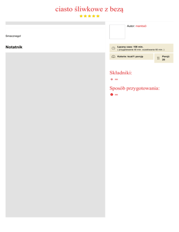 ciasto śliwkowe z bezą Autor: mamba3 Smacznego! Notatnik Łączny czas: 100 min. ( przygotowanie 40 min. oczekiwanie 60 min. ) Kalorie: kcal/1 porcję Składniki: xxx Sposób przygotowania: xxx Porcji: 20