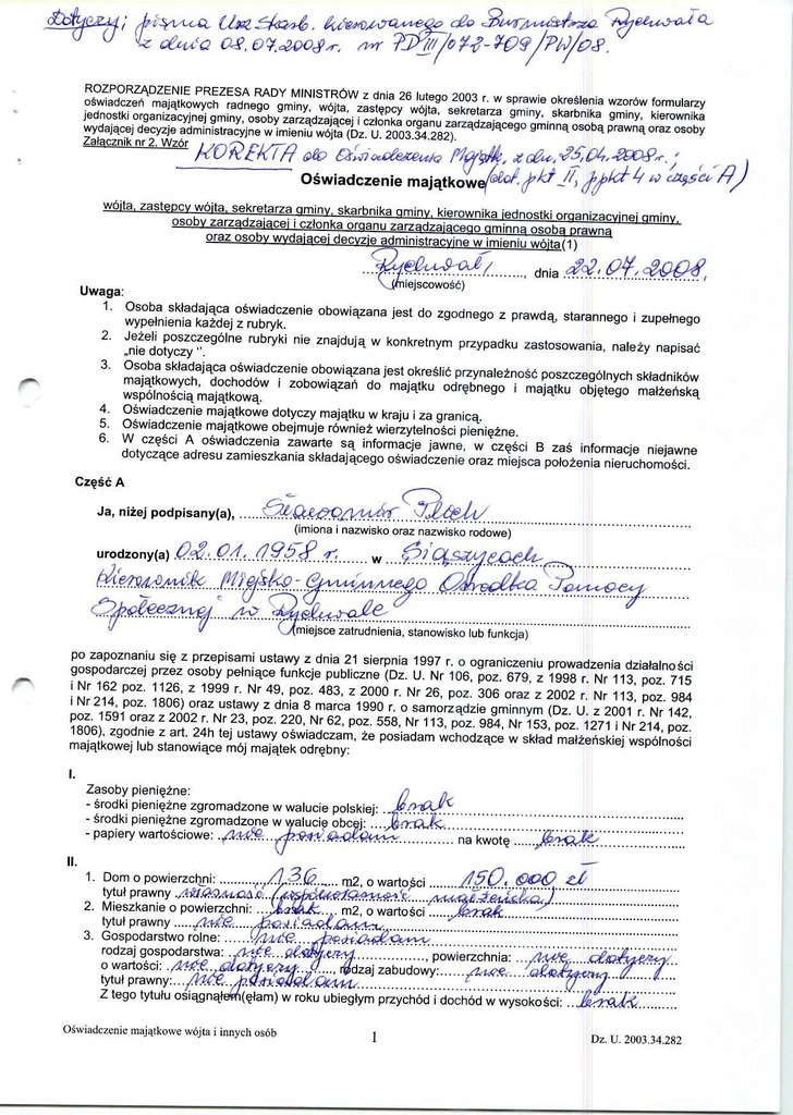 ; A eeu,9-, Q- ti-wct - tt-t c2 O2, O&OR ROZPORZ/ADZENIE PREZESA RADY MINISTROW z dnia 26 lutego 2003 r. w sprawie okre§Ienia wzor6w formularzy o§wiadczen majqtkowych radnego gminy, w6jta, zast@pcy w6jta, sekretarza gminy, skarbnika gminy, kierownika jednostki organizacyjnej gminy, osoby zarzqdzajqcej i czlonka organu zarzadzajacego gminna osobq prawna oraz osoby wydajqcej decyzje administracyjne w imieniu w6jta (Dz. U. 2003.34.282). Za#acznik nr 2. WzOr Oswiadczenie majgtkowe^°^' /" sce 119) w6ita, zasteocv w6ita sekretarza gminv skarbnika gminv kierownika iednostki organizacvinei gminv osoby zarza(jzaiacei i cz#onka organu zarzadzaiacego gminna osoba orawna oraz osoby wvdaiacei decvzie administracvjne w imieniu w j (1) ........ e#scowosc) Uwaga: dnia ..liter '4, dni a 1. Osoba skladajqca oswiadczenie obowiazana jest do zgodnego z prawdq, starannego i zupelnego wypelnienia kazdej z rubryk. 2. Jezeli poszczeg6lne rubryki nie znajduja w konkretnym przypadku zastosowania, nalezy napisac ,,nie dotyczy ". 3. Osoba skladajqca oswiadczenie obowiqzana jest okre§Iic przynaleznosc poszczeg6lnych sk#adnik6w majqtkowych, dochod6w i zobowiazar do majqtku odrgbnego i majatku obj@tego ma#ze6ska wsp6lno§cia majqtkowq. 4. O§wiadczenie majqtkowe dotyczy majqtku w kraju i za granicq. 5. O§wiadczenie majqtkowe obejmuje r6wniez wierzytelno§ci pieni@zne. 6. W cz@sci A o§wiadczenia zawarte sq informacje jawne, w czg§ci B za§ informacje niejawne dotyczqce adresu zamieszkania skladajacego oswiadczenie oraz miejsca potozenia nieruchomo§ci. Czgsc A Ja, nize J ' Pod uQ^/Lt^t^ .....C t/ Pisan y(a ), ......'`7e C ............................................................... (imiona i nazwisko oraz nazwisko rodowe) urodzony(a) ✓ ..v c..^/^^^ .. ............. . ?', w yam) )C' C:J c12 ............................................................... miejsce zatrudnienia, stanowisko lub funkcja) po zapoznaniu sig z przepisami ustawy z dnia 21 sierpnia 1997 r. o ograniczeniu prowadzenia dziatalno§ci gospodarczej przez osoby pe#niace funkcje publiczne (Dz. U. Nr 106, poz. 679, z 1998 r. Nr 113, poz. 715 i Nr 162 poz. 1126, z 1999 r. Nr 49, poz. 483, z 2000 r. Nr 26, poz. 306 oraz z 2002 r. Nr 113, poz. 984 i Nr 214, poz. 1806) oraz ustawy z dnia 8 marca 1990 r. o samorzqdzie gminnym (Dz. U. z 2001 r. Nr 142, poz. 1591 oraz z 2002 r. Nr 23, poz. 220, Nr 62, poz. 558, Nr 113, poz. 984, Nr 153, poz. 1271 i Nr 214, poz. 1806), zgodnie z art. 24h tej ustawy o§wiadczam, ze posiadam wchodzace w sklad mal2eriskiej wsp6lno§ci majqtkowej lub stanowiace m6j majqtek odrgbny: Zasoby pieniczne: - §rodki pienigzne zgromadzone w walucie polskiej: . - srodki pieniqzne zgromadzone w aIucie obc j:.... ii:>4 • • • - papiery warto § ciowe : .,142:L ... ....... !tit-t- .......... na kwotg ...... 1. Dom o powierzchni : ..........r.,, o ......... ✓^ ..................... &900 ZZ, rn2, wartosci ^ tytu# prawny ,!^^1.G. i.4r.^^ .e...^. .................................. ..................... .......... M ieszkanie o powierzchni:... 24 m2, o wartosci .......... . tytut prawny ........... . 3. Gospodarstwo rolne : ..... ../L."'-c.... m^ca^ ................................................. rodzaj gospodarstwa :.. .. e171-0 . .. powierzchnia : -A.... 't . ...... • o wartosci . ./.A....F..G rl...^ tytu# prawny :... C?: ... ^ dzaj zabudow y .. .... . . .. ... ........... .. . . ................. ................. . .. . . .. . .. . L4! Z tego tytufu osiagnam) w roku ubieglym przych6d i doch6d w wysoko .. . §ci:...A! •........• Oswiadczenie majatkowe w6jta i innych os6b I Dz. U. 2003,34,282 _ D fl(. ^)!C^4^. 4. Inne nieruchomosci :, ,L#P ' powierzchnia : ^. Q ^Yi....... .. ...V...u....... o warto§ci .....V . f.^. .. 6 ?fT!t. :..°.. ..... ,... tytut prawny :.j,j7 O .. .... .,^r:f^?. 7 ...... ........................ 1-11//), Posiadam uciziafy w sp6tkach handlowych - nalezy podac Iiczbc i emitenta udziaf6w: r ..... ^5 ^!"t.. ?e: ' - !! ............................................................................................... udzialy to sta owie pakiet wi @ kszy ni± 10% udziaf6w w sp6fce: ......? .............................................................................................. Z tego tytu osiagnatem(gfam) w roku ubiegtym doch6d w wysoko§ci: c .... ^?^ t..... mow.... w.. ............................................................ IV. Posiadam a je w sp6fk;,ch handlowych - nalezy podac Iiczbg i emitenta akcji: .... ........ !.....:.r9 ............................... ............. ........................................................................................................................... akcje to stan wia ppkiet iqkszy niz 10% akcji w spotce: u^Q .... ..c?d 04'G.. ................................................................................................ Z tego tytut osiagnafem (gtact) w roku ubiegtym doch6d w wysokosci: /.114, .....Cj? 3 ......................................................................................... V. Nabylem ( am) (nabyt m6j mat2onek , z wytaczeniem mienia przynale2nego do jego majatku odrgbnego) od Skarbu Panstwa , innej panstwowej osoby prawnej , jednostek samorzadu terytorialnego , ich zwiazk6w lub od komunalnej osoby prawnej nast^pujace mienie , kt6re podlegato zbyciu w drodze przetargu - nale2y po^^d a^c opis mienia i da q nabycia , od kogo: w... ........................................... VI. 1. PrAwadz dziatalno §c^gospodarpza(2).(nal zy podaa formg prawna i przedmiot dziatalnosci ) :............... /1. c. rb .... rl c^C sz:9 '. P . . . . Sor i<c cam ^?? i ......................................... ........... ................. ... . ....... . . . . . . .... .... .. .......... . ...... ....... .... .... ............ ........ .. ......................................... wsp6lnie z innymi osobami :....^.I 4`Z° ... ................'?! .-----.--.------------...--......................... Z tego tytutu osiagnatem ( gtam) w roku ubiejfym przych6d i dtich