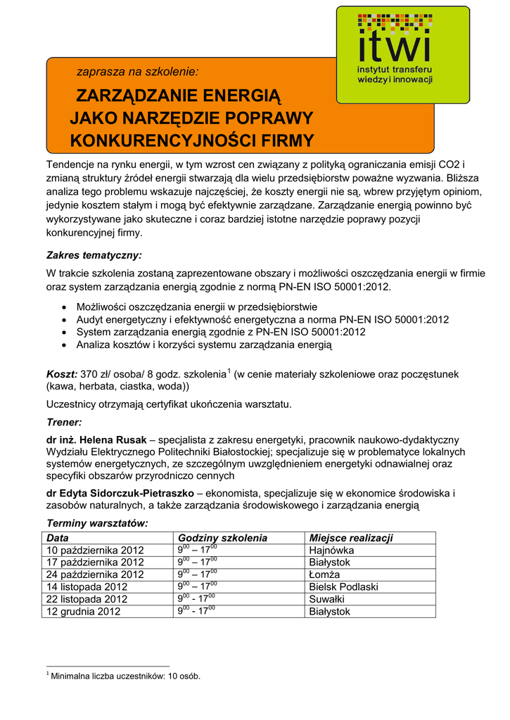 zaprasza na szkolenie: ZARZĄDZANIE ENERGIĄ JAKO NARZĘDZIE POPRAWY KONKURENCYJNOŚCI FIRMY Tendencje na rynku energii, w tym wzrost cen związany z polityką ograniczania emisji CO2 i zmianą struktury źródeł energii stwarzają dla wielu przedsiębiorstw poważne wyzwania. Bliższa analiza tego problemu wskazuje najczęściej, że koszty energii nie są, wbrew przyjętym opiniom, jedynie kosztem stałym i mogą być efektywnie zarządzane. Zarządzanie energią powinno być wykorzystywane jako skuteczne i coraz bardziej istotne narzędzie poprawy pozycji konkurencyjnej firmy. Zakres tematyczny: W trakcie szkolenia zostaną zaprezentowane obszary i możliwości oszczędzania energii w firmie oraz system zarządzania energią zgodnie z normą PN-EN ISO 50001:2012. • • • • Możliwości oszczędzania energii w przedsiębiorstwie Audyt energetyczny i efektywność energetyczna a norma PN-EN ISO 50001:2012 System zarządzania energią zgodnie z PN-EN ISO 50001:2012 Analiza kosztów i korzyści systemu zarządzania energią Koszt: 370 zł/ osoba/ 8 godz. szkolenia 1 (w cenie materiały szkoleniowe oraz poczęstunek (kawa, herbata, ciastka, woda)) Uczestnicy otrzymają certyfikat ukończenia warsztatu. Trener: dr inż. Helena Rusak – specjalista z zakresu energetyki, pracownik naukowo-dydaktyczny Wydziału Elektrycznego Politechniki Białostockiej; specjalizuje się w problematyce lokalnych systemów energetycznych, ze szczególnym uwzględnieniem energetyki odnawialnej oraz specyfiki obszarów przyrodniczo cennych dr Edyta Sidorczuk-Pietraszko – ekonomista, specjalizuje się w ekonomice środowiska i zasobów naturalnych, a także zarządzania środowiskowego i zarządzania energią Terminy warsztatów: Data 10 października 2012 17 października 2012 24 października 2012 14 listopada 2012 22 listopada 2012 12 grudnia 2012 1 Godziny szkolenia 900 – 1700 900 – 1700 900 – 1700 900 – 1700 900 - 1700 900 - 1700 Minimalna liczba uczestników: 10 osób. Miejsce realizacji Hajnówka Białystok Łomża Bielsk Podlaski Suwałki Białystok