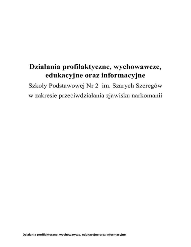 Działania profilaktyczne, wychowawcze, edukacyjne oraz informacyjne Szkoły Podstawowej Nr 2 im. Szarych Szeregów w zakresie przeciwdziałania zjawisku narkomanii Działania profilaktyczne, wychowawcze, edukacyjne oraz informacyjne Podstawy prawne: 1. Konstytucja Rzeczypospolitej Polskiej z dnia 2 kwietnia 1997 r. (Dz. U. z 1997 r. Nr 78, poz. 283 z późn. zm.). 2. Konwencja o Prawach Dziecka przyjęta przez Zgromadzenie Ogólne Narodów Zjednoczonych dnia 20 listopada 1989 r. (Dz. U. z 1991 r. Nr 120, poz. 526). 3. Rozporządzenia Ministra Edukacji Narodowej z 30 kwietnia 2013 r. w sprawie zasad udzielania i organizacji pomocy psychologiczno - pedagogicznej w publicznych przedszkolach, szkołach i placówkach (Dz. U. z 2013 r. poz. 532). 4. Rozporządzenie Ministra Edukacji Narodowej z dnia 27 sierpnia 2012 r. w sprawie podstawy programowej wychowania przedszkolnego oraz kształcenia ogólnego w poszczególnych typach szkół (Dz. U. z 2012 r. poz. 977 z późn. zm.). 5. Rozporządzenie Ministra Edukacji Narodowej z 6 sierpnia 2015 r. w sprawie wymagao wobec szkół i placówek (Dz.U. z 2015 r. poz. 1214). 6. Rozporządzenie Ministra Edukacji Narodowej z dnia 24 lipca 2015 r. w sprawie warunków organizowania kształcenia, wychowania i opieki dla dzieci i młodzieży niepełnosprawnych oraz niedostosowanych społecznie w przedszkolach, szkołach i oddziałach ogólnodostępnych lub integracyjnych (Dz. U. z 2015 r. poz. 1113). 7. Rozporządzenie Ministra Edukacji Narodowej z 18 sierpnia 2015 r. z zakresu i form prowadzenia w szkołach i placówkach systemu oświaty działalności wychowawczej, edukacyjnej, informacyjnej i profilaktycznej w celu przeciwdziałania narkomanii (Dz. U. z 2015 r. poz. 1249). 8. Uchwała Nr 130/2014 Rady Ministrów z dnia 8 lipca 2014 r. w sprawie przyjęcia rządowego programu na lata 2014-2016 „Bezpieczna i przyjazna szkoła”. 9. Rozporządzenie Rady Ministrów z dnia 23 czerwca 2015 r. w sprawie realizacji Rządowego programu wspomagania w latach 2015-2018 organów prowadzanych szkoły w zapewnieniu bezpiecznych warunków nauki, wychowania i opieki w szkołach - „Bezpieczna+” (Dz. U. z 2015 r. poz. 972). 10. Uchwała Nr 89/2015 Rady Ministrów z dnia 23 czerwca 2015 r. w sprawie Rządowego programu wspomagania w latach 2015-2018 organów prowadzących szkoły w zapewnieniu bezpiecznych warunków nauki, wychowania i opieki w szkołach - „Bezpieczna+”. 11. Ustawa z dnia 7 września 1991 r. o systemie oświaty (Dz. U. z 2004 r., Nr 256, poz. 2572 z późn. zm.). 12. Ustawy z dnia 26 listopada 1982 r. - Karta Nauczyciela (Dz. U. z 2014 r. poz. 19). 13. Ustawa z dnia 25 czerwca 2010 r. o sporcie (Dz. U. z 2010 r. nr 127, poz. 857). 14. Ustawa z dnia 29 lipca 2005 r. o przeciwdziałaniu narkomanii (Dz. U. z 2012 r. poz.124). Działania profilaktyczne, wychowawcze, edukacyjne oraz informacyjne 15. Ustawa z dnia 26 października 1982 r. o wychowaniu w trzeźwości w przeciwdziałaniu alkoholizmowi (Dz. U. z 2013 r. poz. 1563). 16. Ustawa z dnia 26 października 1982 r. o postępowaniu w sprawach nieletnich (Dz.U. z 2014 r., poz. 382). 17. Ustawa z dnia 19 sierpnia 1994 r. o ochronie zdrowia psychicznego (Dz. U. z 2011 r. Nr 231, poz. 1375). 18. Ustawa z dnia 29 lipca 2005 r. o przeciwdziałaniu przemocy w rodzinie (Dz. U. z 2005 r. Nr 180, poz. 1493 z późn. zm.). 19. Ustawa z dnia 9 listopada 1995 r. o ochronie zdrowia przed następstwami używania tytoniu i wyrobów tytoniowych (Dz. U. z 2015 r. poz. 298). 20. Ustawa z dnia 24 sierpnia 1991 r. o ochronie przeciwpożarowej (Dz. U. z 2009 r. Nr 178, poz. 1380, z późn. zm.); 21. Ustawa z dnia 24 sierpnia 1991 r. o Paostwowej Straży Pożarnej (Dz. U. z 2013 r. poz. 1340, z późn. zm.); 22. Ustawa z dnia 9 czerwca 2011 r. o wspieraniu rodziny i systemie pieczy zastępczej (Dz. U. 2015 r. poz. 332); 23. Konwencję o prawach osób niepełnosprawnych, sporządzoną w Nowym Jorku dnia 13 grudnia 2006 r. (Dz. U. z 2012 r. poz. 1169). Działania profilaktyczne, wychowawcze, edukacyjne oraz informacyjne Realizując działania opisane w ROZPORZĄDZENIU MINISTRA EDUKACJI NARODOWEJ z dnia 18 sierpnia 2015 r. „w sprawie zakresu i form prowadzenia w szkołach i placówkach systemu oświaty działalności wychowawczej, edukacyjnej informacyjnej i profilaktycznej w celu przeciwdziałania narkomanii” (Dz. U. z 2015 r. , poz. 1249), szkoła opracowała niniejszy dokument, stanowiący listę działao podejmowanych przez placówkę, mających na celu przeciwdziałanie oraz zapobieganie problemowi narkomanii. Przygotowanie wspomnianych aktywności zostało poprzedzone procesem ewaluacji przeprowadzonej w dniach 5 – 26 października 2015 r., na bazie której opracowana została diagnoza problemu. Zawarte w diagnozie wnioski były efektem przeprowadzonego bardzo szeroko procesu ewaluacji, którego wyniki zawarte są w dokumencie: „Raport z ewaluacji” oraz przeprowadzonej szczegółowej analizy występujących w szkole czynników ryzyka oraz zapobiegających im czynników chroniących, odzwierciedlonych w dokumencie: „Diagnoza czynników ryzyka oraz czynników chroniących”. Na bazie przeprowadzonych prac, opracowanych dokumentów oraz wyznaczonych w Rozporządzeniu obszarów, zaplanowane działania zostały podzielone na cztery kategorie, tj. działalnośd: 1. wychowawczą, 2. edukacyjną, 3. informacyjną, 4. profilaktyczną. Zaplanowane propozycje działao mają na celu, opisane w Rozporządzeniu, skuteczne przeciwdziałanie pojawianiu się zachowao ryzykownych związanych z używaniem środków odurzających, substancji psychoaktywnych, środków zastępczych, nowych substancji psychoaktywnych przez uczniów i wychowanków naszej placówki, w szczególności charakteryzujących się nieprzestrzeganiem przyjętych dla danego wieku zwyczajowych norm i wymagao, niosących ryzyko negatywnych konsekwencji dla zdrowia fizycznego i psychicznego oraz jego otoczenia społecznego. Realizacja powyższych działao 