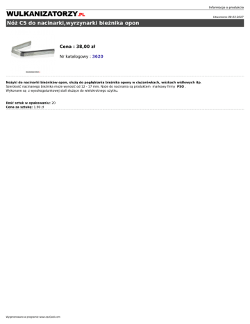 Informacje o produkcie Utworzono 08-03-2017 Nóż C5 do nacinarki,wyrzynarki bieżnika opon Cena : 38,00 zł Nr katalogowy : 3620 Nożyki do nacinarki bieżników opon, służą do pogłębiania bieżnika opony w ciężarówkach, wózkach widłowych itp. Szerokość nacinanego bieżnika może wynosić od 12 - 17 mm. Noże do nacinania są produktem markowy firmy PSO . Wykonane są z wysokogatunkowej stali służące do wielokrotnego użytku. Ilość sztuk w opakowaniu: 20 Cena za sztukę: 1.90 zł Wygenerowano w programie www.oscGold.com