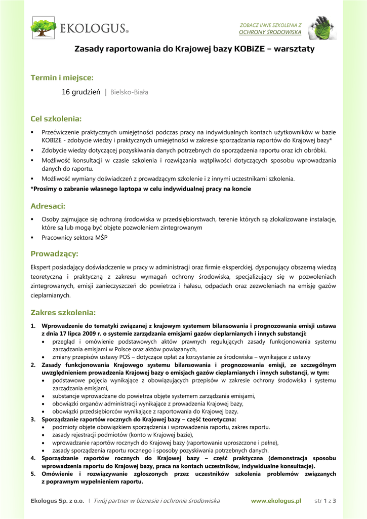 ZOBACZ INNE SZKOLENIA Z OCHRONY ŚRODOWISKA Zasady raportowania do Krajowej bazy KOBiZE – warsztaty Termin i miejsce: 16 grudzień | Bielsko-Biała Cel szkolenia: Przećwiczenie praktycznych umiejętności podczas pracy na indywidualnych kontach użytkowników w bazie KOBIZE - zdobycie wiedzy i praktycznych umiejętności w zakresie sporządzania raportów do Krajowej bazy* Zdobycie wiedzy dotyczącej pozyskiwania danych potrzebnych do sporządzenia raportu oraz ich obróbki. Możliwość konsultacji w czasie szkolenia i rozwiązania wątpliwości dotyczących sposobu wprowadzania danych do raportu. Możliwość wymiany doświadczeń z prowadzącym szkolenie i z innymi uczestnikami szkolenia. *Prosimy o zabranie własnego laptopa w celu indywidualnej pracy na koncie Adresaci: Osoby zajmujące się ochroną środowiska w przedsiębiorstwach, terenie których są zlokalizowane instalacje, które są lub mogą być objęte pozwoleniem zintegrowanym Pracownicy sektora MŚP Prowadzący: Ekspert posiadający doświadczenie w pracy w administracji oraz firmie eksperckiej, dysponujący obszerną wiedzą teoretyczną i praktyczną z zakresu wymagań ochrony środowiska, specjalizujący się w pozwoleniach zintegrowanych, emisji zanieczyszczeń do powietrza i hałasu, odpadach oraz zezwoleniach na emisję gazów cieplarnianych. Zakres szkolenia: 1. 2. 3. 4. 5. Wprowadzenie do tematyki związanej z krajowym systemem bilansowania i prognozowania emisji ustawa z dnia 17 lipca 2009 r. o systemie zarządzania emisjami gazów cieplarnianych i innych substancji: przegląd i omówienie podstawowych aktów prawnych regulujących zasady funkcjonowania systemu zarządzania emisjami w Polsce oraz aktów powiązanych, zmiany przepisów ustawy POŚ – dotyczące opłat za korzystanie ze środowiska – wynikające z ustawy Zasady funkcjonowania Krajowego systemu bilansowania i prognozowania emisji, ze szczególnym uwzględnieniem prowadzenia Krajowej bazy o emisjach gazów cieplarnianych i innych substancji, w tym: podstawowe pojęcia wynikające z obowiązujących przepisów w zakresie ochrony środowiska i systemu zarządzania emisjami, substancje wprowadzane do powietrza objęte systemem zarządzania emisjami, obowiązki organów administracji wynikające z prowadzenia Krajowej bazy, obowiązki przedsiębiorców wynikające z raportowania do Krajowej bazy. Sporządzanie raportów rocznych do Krajowej bazy – część teoretyczna: podmioty objęte obowiązkiem sporządzenia i wprowadzenia raportu, zakres raportu. zasady rejestracji podmiotów (konto w Krajowej bazie), wprowadzanie raportów rocznych do Krajowej bazy (raportowanie uproszczone i pełne), zasady sporządzenia raportu rocznego i sposoby pozyskiwania potrzebnych danych. Sporządzanie raportów rocznych do Krajowej bazy – część praktyczna (demonstracja sposobu wprowadzenia raportu do Krajowej bazy, praca na kontach uczestników, indywidualne konsultacje). Omówienie i rozwiązywanie zgłoszonych przez uczestników szkolenia problemów związanych z poprawnym wypełnieniem raportu. Ekologus Sp. z o.o. | Twój partner w biznesie i ochronie środowiska www.ekologus.pl str 1 z 3 ZOBACZ INNE SZKOLENIA Z OCHRONY ŚRODOWISKA 6. Omówienie ogólnych zasad raportowania w ramach systemu PRTR Na zakończenie każdy uczestnik otrzymuje imienne zaświadczenie o udziale w szkoleniu oraz 10-dniowe mailowe konsultacje z wykładowcą po zakończeniu szkolenia. Cena: TERMIN SZKOLENIA 16.12 | Bielsko-Biała CENA netto/os CENA ZAWIERA (szkolenie bez noclegu): udział w szkoleniu, komplet materiałów drukowanych, zaświadczenie imienne potwierdzające udział w szkoleniu, 10-dniowe darmowe mailowe konsultacje z wykładowcą po zakończeniu szkolenia 500 zł +VAT* * Zwolnienie z podatku VAT w przypadku finansowania szkolenia co najmniej w 70% ze środków publicznych (Art. 43 ust. 1 pkt. 29 Ustawy o VAT) wyżywienie: obiady i przerwy kawowe. Istnieje możliwość rezerwacji noclegu – opcja dodatkowo płatna Rabaty: DLA STAŁYCH KLIENTÓW FIRST MINUTE UPUST NALICZANY INDYWIDUALNE -10% PRZY ZGŁOSZENIU DLA OSÓB/PRZEDSIĘBIORSTW, KTÓRE DO 42 DNI (6 TYGODNI) PRZED KORZYSTAJĄ Z NASZYCH USŁUG ROZPOCZĘCIEM SZKOLENIA DLA GRUPY 3+ -50% DLA CO TRZECIEJ OSOBY ZGŁOSZONEJ Z TEJ SAMEJ FIRMY/INSTYTUCJI UWAGA! Rabaty naliczane od cen podstawowych (bez noclegu). Rabaty nie sumują się. Warunkiem uczestnictwa w szkoleniu jest przesłanie do Ekologus Sp. z o.o. wypełnionego formularza zgłoszenia. W ciągu kolejnych 2 dni roboczych nasi pracownicy potwierdzą przyjęcie zgłoszenia. Organizator zastrzega sobie prawo do dokonywania modyfikacji programu lub terminu szkolenia w merytorycznie uzasadnionych przypadkach. O zmianach uczestnik zostanie poinformowany mailowo oraz telefonicznie. ZOBACZ HARMONOGRAM SZKOLEŃ ZAPRASZAMY DO KONTAKTU Z DZIAŁEM SZKOLEŃ NASI SPECJALIŚCI SĄ DO PAŃSTWA DYSPOZYCJI tel.: (33) 496 03 00, wewn. 15 i 20 fax: (33) 496 03 22 kom: e-mail: 606 914 909, 575 914 909 [email protected] A MOŻE SZKOLENIE ZAMKNIĘTE? Jeśli jesteś zainteresowany danym tematem w formie szkolenia zamkniętego napisz do nas. Dobierzemy indywidualnie do potrzeb Klienta zakres, termin i lokalizację szkolenia. KARTA ZGŁOSZENIA NA OSTATNIEJ STRONIE Ekologus Sp. z o.o. | Twój partner w biznesie i ochronie środowiska www.ekologus.pl str 2 z 3 KARTA ZGŁOSZENIA UDZIAŁU W SZKOLENIU Przesłana uzupełniona karta zgłoszenia stanowi umowę uczestnictwa w szkoleniu oraz oznacza akceptację poniższych warunków Warunki uczestnictwa: Podstawą udziału w szkoleniu jest przesłania faxem lub pocztą elektroniczną wypełnionej karty zgłoszenia w terminie do 7 dni roboczych przed rozpoczęciem szkolenia oraz dokonanie wpłaty do 3 dni przed szkoleniem na konto nr: 63 1090 1740 0000 0001 0246 2320 (BZ WBK S.A. O/Bielsko-Biała). W tytule przelewy należy wpisać imię i nazwisko uczestnika szkolenia oraz nr NIP Instytucji zgłaszającej. Zgłaszający upoważnia Ekologus Sp.