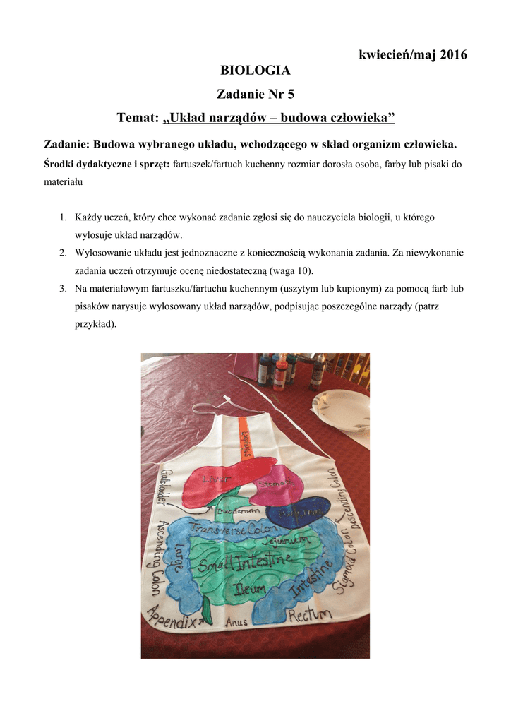 kwiecień/maj 2016 BIOLOGIA Zadanie Nr 5 Temat: „Układ narządów – budowa człowieka” Zadanie: Budowa wybranego układu, wchodzącego w skład organizm człowieka. Środki dydaktyczne i sprzęt: fartuszek/fartuch kuchenny rozmiar dorosła osoba, farby lub pisaki do materiału 1. Każdy uczeń, który chce wykonać zadanie zgłosi się do nauczyciela biologii, u którego wylosuje układ narządów. 2. Wylosowanie układu jest jednoznaczne z koniecznością wykonania zadania. Za niewykonanie zadania uczeń otrzymuje ocenę niedostateczną (waga 10). 3. Na materiałowym fartuszku/fartuchu kuchennym (uszytym lub kupionym) za pomocą farb lub pisaków narysuje wylosowany układ narządów, podpisując poszczególne narządy (patrz przykład). 4. Fartuszek/fartuch kuchenny z narysowanym układem, z podpisem (czytelnie - imię, nazwisko, klasa) na doczepionej (porządnie, żeby nie odpadła) karteczce należy dostarczyć do 20 maja 2016r. do sali 48. Kryteria oceny: 5 pkt za poprawność rysunku układu (proporcje, rozmieszczenie, dokładność, poprawność, podpisy) 5 pkt za wykonanie (estetyka, staranność, efektowność, kolorystyka, czytelność) 10 pkt –celujący 9-8 pkt –bardzo dobry 7-6 pkt – dobry Termin wykonania zadania upływa 20.05.2016r. Powodzenia Zyta Sendecka
