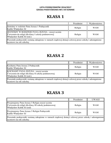LISTA PODRĘCZNIKÓW 2016/2017 SZKOŁA PODSTAWOWA NR 3 W KONINIE KLASA 1 Przedmiot Wydawnictwo Jesteśmy w rodzinie Pana Jezusa 1 Podręcznik Kubik Władysław SJ Religia WAM JESTEŚMY W RODZINIE PANA JEZUSA - zeszyt ucznia Ćwiczenia do religii dla klasy I szkoły podstawowej Władysław Kubik SJ (red.) Religia WAM Pozostałe podręczniki zostaną zakupione w ramach rządowej dotacji celowej przez szkołę i udostępnione uczniowi na rok szkolny KLASA 2 Przedmiot Wydawnictwo Kochamy Pana Jezusa 2 Podręcznik Kubik Władysław SJ Religia WAM KOCHAMY PANA JEZUSA - zeszyt ucznia Ćwiczenia do religii dla klasy II szkoły podstawowej Władysław Kubik SJ (red.) Religia WAM Pozostałe podręczniki zostaną zakupione w ramach rządowej dotacji celowej przez szkołę i udostępnione uczniowi na rok szkolny KLASA 3 Przedmiot UWAGI Przyjmujemy Pana Jezusa 3 Religia zeszyt ucznia Ćwiczenia do religii dla klasy III szkoły podstawowej Władysław Kubik SJ (red) Religia WAM Przyjmujemy Pana Jezusa 3 Religia Podręcznik Kubik Władysław SJ Religia WAM Pozostałe podręczniki zostaną zakupione w ramach rządowej dotacji celowej przez szkołę i udostępnione uczniowi na rok szkolny LISTA PODRĘCZNIKÓW 2016/2017 SZKOŁA PODSTAWOWA NR 3 W KONINIE KLASA 4 Zaproszeni przez Boga 4 Podręcznik red. Ks. Zbigniew Marek NOWA WERSJA Przedmiot Wydawnictwo Religia WAM Pozostałe podręczniki zostaną zakupione w ramach rządowej dotacji celowej przez szkołę i udostępnione uczniowi na rok szkolny KLASA 5 Obdarowani przez Boga 5 Podręcznik red. ks. Marek Zbigniew Przedmiot Wydawnictwo Religia WAM Pozostałe podręczniki zostaną zakupione w ramach rządowej dotacji celowej przez szkołę i udostępnione uczniowi na rok szkolny LISTA PODRĘCZNIKÓW 2016/2017 SZKOŁA PODSTAWOWA NR 3 W KONINIE KLASA 6 Przedmiot Wydawnictwo Klucz do historii. Podręcznik do klasy 6 Wojciech Kalwat Małgorzata Lis Historia i społeczeństwo WSiP Klucz do historii. Zeszyt ćwiczeń do klasy 6 Historia i społeczeństwo WSiP Wędrując ku dorosłości. Wychowanie do życia w rodzinie Teresa Król Wychowanie do życia w rodzinie RUBIKON Wędrując ku dorosłości. Wychowanie do życia w rodzinie. Zeszyt ćwiczeń VI Teresa Król Wychowanie do życia w rodzinie RUBIKON Team up 2 i Team up 3 Philippa Bowen, Denis Delaney Język angielski OXFORD Team up 2 i Team up 3. Zeszyty ćwiczeń (Workbook) Philippa Bowen Język angielski OXFORD Słowa na start 6 Podręcznik do kształcenia językowego część 1 Wojciechowska Anna, Marcinkiewicz Agnieszka Język polski Nowa Era Słowa na start 6 Podręcznik do kształcenia językowego część 2 Wojciechowska Anna, Marcinkiewicz Agnieszka Język polski Nowa Era Słowa na start 6 podręcznik do kształcenia literackiego i kulturowego z płytą CD + dodatek wakacyjny Derlukiewicz Marlena Język polski Nowa Era Matematyka wokół nas 6 Zeszyt ćwiczeń część 1 Lewicka Helena, Kowalczyk Marianna Matematyka WSiP Matematyka wokół nas 6 Podręcznik z płytą CD Lewicka Helena, Kowalczyk Marianna Matematyka WSiP Matematyka wokół nas 6 zeszyt ćwiczeń część 2 Lewicka Helena, Kowalczyk Marianna Matematyka WSiP Muzyka 4-6 podręcznik (PODRĘCZNIK TRZYLETNI) Rykowska Małgorzata, Szałko Zbigniew Muzyka OPERON Do dzieła 4-6 Podręcznik do plastyki z płytą CD (PODRĘCZNIK TRZYLETNI) Onak Krystyna, Lukas Jadwiga Plastyka Nowa Era Przyroda z klasą 6 Podręcznik Frąckowiak Ewa, Gęca Ewa, Buniowska Joanna Przyroda LektorKlett Przyroda z klasą 6 Ćwiczenia Frąckowiak Ewa, Gęca Ewa, Buniowska Joanna Przyroda LektorKlett Religia WAM Przemienieni przez Boga 6 Podręcznik red. ks. Marek Zbigniew