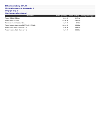 Sklep internetowy E-PLAY 02-296 Warszawa, ul. Kurzawska 6 [email protected] http://www.e-playsklep.pl/ Produkty Cena (brutto) Cena (netto) Futerał DELUXE Black 39,00 zł 31,71 zł Futerał Royal 2 czarny. 170,00 zł 138,21 zł Pokrowiec na kij bilardowy Eco. 12,00 zł 9,76 zł 160,00 zł 130,08 zł Futerał tuba Classic czarna na 1 kij 70,00 zł 56,91 zł Futerał walizka Black Basic na 1 kij 40,00 zł 32,52 zł Futerał walizka aluminiowa BUFFALO PIRAMID Cena promocyjna