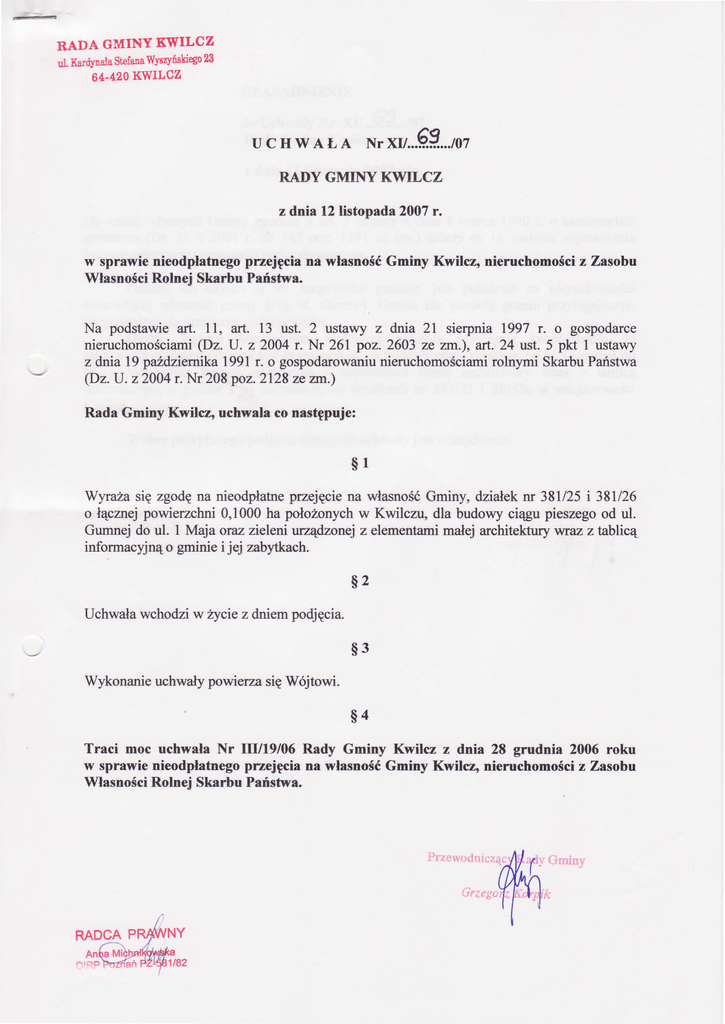 Uchwała Nr XI/69/2007 Rady Gminy Kwilcz z