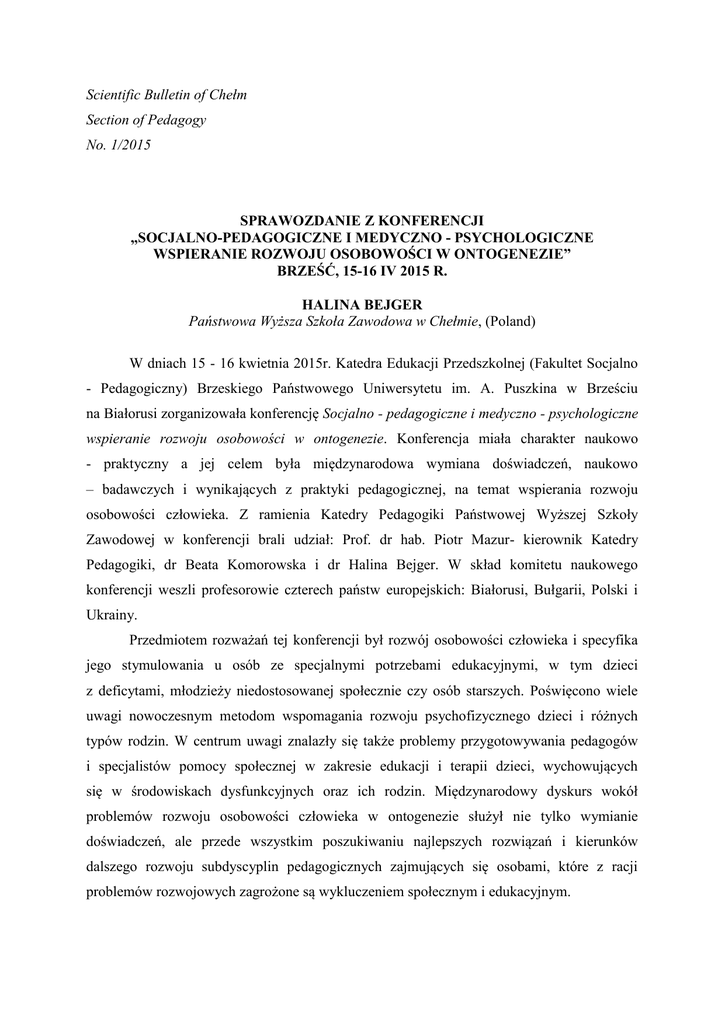 Scientific Bulletin of Chełm Section of Pedagogy No. 1/2015 SPRAWOZDANIE Z KONFERENCJI „SOCJALNO-PEDAGOGICZNE I MEDYCZNO - PSYCHOLOGICZNE WSPIERANIE ROZWOJU OSOBOWOŚCI W ONTOGENEZIE” BRZEŚĆ, 15-16 IV 2015 R. HALINA BEJGER Państwowa Wyższa Szkoła Zawodowa w Chełmie, (Poland) W dniach 15 - 16 kwietnia 2015r. Katedra Edukacji Przedszkolnej (Fakultet Socjalno - Pedagogiczny) Brzeskiego Państwowego Uniwersytetu im. A. Puszkina w Brześciu na Białorusi zorganizowała konferencję Socjalno - pedagogiczne i medyczno - psychologiczne wspieranie rozwoju osobowości w ontogenezie. Konferencja miała charakter naukowo - praktyczny a jej celem była międzynarodowa wymiana doświadczeń, naukowo – badawczych i wynikających z praktyki pedagogicznej, na temat wspierania rozwoju osobowości człowieka. Z ramienia Katedry Pedagogiki Państwowej Wyższej Szkoły Zawodowej w konferencji brali udział: Prof. dr hab. Piotr Mazur- kierownik Katedry Pedagogiki, dr Beata Komorowska i dr Halina Bejger. W skład komitetu naukowego konferencji weszli profesorowie czterech państw europejskich: Białorusi, Bułgarii, Polski i Ukrainy. Przedmiotem rozważań tej konferencji był rozwój osobowości człowieka i specyfika jego stymulowania u osób ze specjalnymi potrzebami edukacyjnymi, w tym dzieci z deficytami, młodzieży niedostosowanej społecznie czy osób starszych. Poświęcono wiele uwagi nowoczesnym metodom wspomagania rozwoju psychofizycznego dzieci i różnych typów rodzin. W centrum uwagi znalazły się także problemy przygotowywania pedagogów i specjalistów pomocy społecznej w zakresie edukacji i terapii dzieci, wychowujących się w środowiskach dysfunkcyjnych oraz ich rodzin. Międzynarodowy dyskurs wokół problemów rozwoju osobowości człowieka w ontogenezie służył nie tylko wymianie doświadczeń, ale przede wszystkim poszukiwaniu najlepszych rozwiązań i kierunków dalszego rozwoju subdyscyplin pedagogicznych zajmujących się osobami, które z racji problemów rozwojowych zagrożone są wykluczeniem społecznym i edukacyjnym. 240 SCIENTIFIC BULLETIN OF CHEŁM - SECTION OF PEDAGOGY Obrady rozpoczęła część plenarna, w której wystąpiło ośmiu przedstawicieli z czterech krajów Europy: Białorusi, Ukrainy, Rosji i Polski. Wystąpienia reprezentantów Państwowej Wyższej Szkoły Zawodowej w Chełmie znalazły się w części plenarnej tej konferencji i obejmowały referaty na temat: - Terapia i nauka przez teatr w warunkach szkoły przyszpitalnej. - prof. dr hab. Piotr Mazur, - Telefony zaufania na świecie jako interwencyjna forma pomocy dzieciom i rodzinom. - dr Halina Bejger, - Wartość zdrowia w hierarchii wartości młodzieży. -dr Beata Komorowska. W plenarnej części konferencji do interesujących wystąpień należały także referaty pracowników Państwowego Brzeskiego Uniwersytetu im. A. Puszkina w Brześciu: - Podstawowe kierunki i mechanizmy działalności w zakresie preorientacji zawodowej w warunkach innowacyjnego rozwoju kraju. – doc. dr Maria Kowalewicz, - Uczenie się relacji wewnątrzrodzinnych w młodych rodzinach wychowujących dzieci. – doc. dr W. Moskaluk, Dalsze obrady konferencji przebiegały w pięciu sekcjach (w każdej sekcji wystąpiło od 11 do 17 osób). W trzech z nich przewodniczyli – jako moderatorzy – pracownicy PWSZ w Chełmie: 1) prof. dr hab. Piotr Mazur – przewodniczący sekcji III - „Kształtowanie zdrowego obrazu życia ludzi”, 2) dr Halina Bejger – przewodnicząca sekcji IV- „Socjalno- psychologiczne i pedagogiczne wspieranie rodziny, 3) dr Beata Komorowska – przewodnicząca sekcji V - „Psychologiczne wspomaganie rozwoju osobowości w ontogenezie”. W dwóch pozostałych sekcjach obradami kierowali pracownicy naukowi Brzeskiego Państwowego Uniwersytetu im. A. Puszkina w Brześciu- doc. Galina Kazaruczik i doc. Maria Kowalewicz. Dyskusje te były poświęcone: - „Aktualnym problemom edukacji przedszkolnej” w sekcji I, - „Innowacyjnym tendencjom w edukacji: stanowi obecnemu i perspektywom w praktyce światowej” w sekcji II. Interesująca tematyka konferencji oraz bogactwo przykładów badań naukowych i dobrych praktyk sprzyjały wymianie doświadczeń, a także projektowaniu dalszej owocnej współpracy pomiędzy pracownikami naukowymi zaprzyjaźnionych Uczelni. Teksty Halina Bejger – Sprawozdanie… wystąpień uczestników konferencji zostały wydane w formie monografii „Socjalno pedagogiczne i medyczno - psychologiczne wspieranie rozwoju osobowości w ontogenezie”. 241
