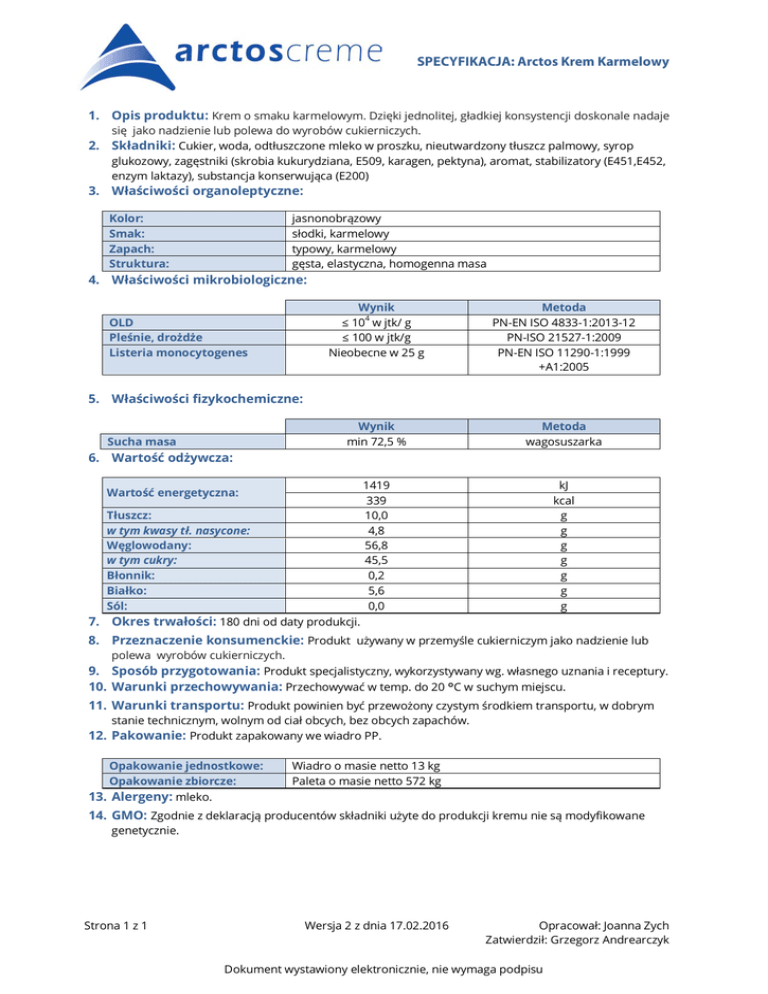 SPECYFIKACJA: Arctos Krem Karmelowy 1. Opis produktu: Krem o smaku karmelowym. Dzięki jednolitej, gładkiej konsystencji doskonale nadaje się jako nadzienie lub polewa do wyrobów cukierniczych. 2. Składniki: Cukier, woda, odtłuszczone mleko w proszku, nieutwardzony tłuszcz palmowy, syrop glukozowy, zagęstniki (skrobia kukurydziana, E509, karagen, pektyna), aromat, stabilizatory (E451,E452, enzym laktazy), substancja konserwująca (E200) 3. Właściwości organoleptyczne: Kolor: Smak: Zapach: Struktura: jasnonobrązowy słodki, karmelowy typowy, karmelowy gęsta, elastyczna, homogenna masa 4. Właściwości mikrobiologiczne: OLD Pleśnie, drożdże Listeria monocytogenes Wynik 4 ≤ 10 w jtk/ g ≤ 100 w jtk/g Nieobecne w 25 g Metoda PN-EN ISO 4833-1:2013-12 PN-ISO 21527-1:2009 PN-EN ISO 11290-1:1999 +A1:2005 Wynik min 72,5 % Metoda wagosuszarka 1419 339 10,0 4,8 56,8 45,5 0,2 5,6 0,0 kJ kcal g g g g g g g 5. Właściwości fizykochemiczne: Sucha masa 6. Wartość odżywcza: Wartość energetyczna: Tłuszcz: w tym kwasy tł. nasycone: Węglowodany: w tym cukry: Błonnik: Białko: Sól: 7. Okres trwałości: 180 dni od daty produkcji. 8. Przeznaczenie konsumenckie: Produkt używany w przemyśle cukierniczym jako nadzienie lub polewa wyrobów cukierniczych. 9. Sposób przygotowania: Produkt specjalistyczny, wykorzystywany wg. własnego uznania i receptury. 10. Warunki przechowywania: Przechowywać w temp. do 20 °C w suchym miejscu. 11. Warunki transportu: Produkt powinien być przewożony czystym środkiem transportu, w dobrym stanie technicznym, wolnym od ciał obcych, bez obcych zapachów. 12. Pakowanie: Produkt zapakowany we wiadro PP. Opakowanie jednostkowe: Opakowanie zbiorcze: Wiadro o masie netto 13 kg Paleta o masie netto 572 kg 13. Alergeny: mleko. 14. GMO: Zgodnie z deklaracją producentów składniki użyte do produkcji kremu nie są modyfikowane genetycznie. Strona 1 z 1 Wersja 2 z dnia 17.02.2016 Opracował: Joanna Zych Zatwierdził: Grzegorz Andrearczyk Dokument wystawiony elektronicznie, nie wymaga podpisu