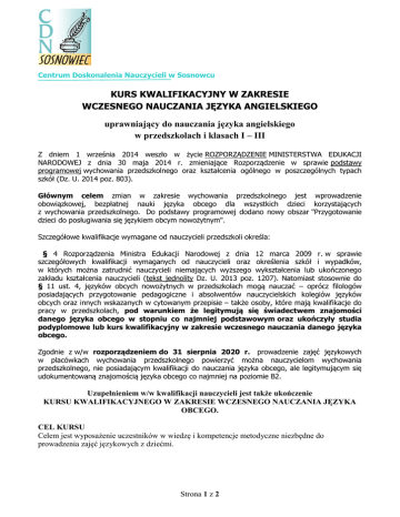 Centrum Doskonalenia Nauczycieli w Sosnowcu KURS KWALIFIKACYJNY W ZAKRESIE WCZESNEGO NAUCZANIA JĘZYKA ANGIELSKIEGO uprawniający do nauczania języka angielskiego w przedszkolach i klasach I – III Z dniem 1 września 2014 weszło w życie ROZPORZĄDZENIE MINISTERSTWA EDUKACJI NARODOWEJ z dnia 30 maja 2014 r. zmieniające Rozporządzenie w sprawie podstawy programowej wychowania przedszkolnego oraz kształcenia ogólnego w poszczególnych typach szkół (Dz. U. 2014 poz. 803). Głównym celem zmian w zakresie wychowania przedszkolnego jest wprowadzenie obowiązkowej, bezpłatnej nauki języka obcego dla wszystkich dzieci korzystających z wychowania przedszkolnego. Do podstawy programowej dodano nowy obszar "Przygotowanie dzieci do posługiwania się językiem obcym nowożytnym". Szczegółowe kwalifikacje wymagane od nauczycieli przedszkoli określa: § 4 Rozporządzenia Ministra Edukacji Narodowej z dnia 12 marca 2009 r. w sprawie szczegółowych kwalifikacji wymaganych od nauczycieli oraz określenia szkół i wypadków, w których można zatrudnić nauczycieli niemających wyższego wykształcenia lub ukończonego zakładu kształcenia nauczycieli (tekst jednolity Dz. U. 2013 poz. 1207). Natomiast stosownie do § 11 ust. 4, języków obcych nowożytnych w przedszkolach mogą nauczać – oprócz filologów posiadających przygotowanie pedagogiczne i absolwentów nauczycielskich kolegiów języków obcych oraz innych wskazanych w cytowanym przepisie – także osoby, które mają kwalifikacje do pracy w przedszkolach, pod warunkiem że legitymują się świadectwem znajomości danego języka obcego w stopniu co najmniej podstawowym oraz ukończyły studia podyplomowe lub kurs kwalifikacyjny w zakresie wczesnego nauczania danego języka obcego. Zgodnie z w/w rozporządzeniem do 31 sierpnia 2020 r. prowadzenie zajęć językowych w placówkach wychowania przedszkolnego powierzyć można nauczycielom wychowania przedszkolnego, nie posiadającym kwalifikacji do nauczania języka obcego, ale legitymującym się udokumentowaną znajomością języka obcego co najmniej na poziomie B2. Uzupełnieniem w/w kwalifikacji nauczycieli jest także ukończenie KURSU KWALIFIKACYJNEGO W ZAKRESIE WCZESNEGO NAUCZANIA JĘZYKA OBCEGO. CEL KURSU Celem jest wyposażenie uczestników w wiedzę i kompetencje metodyczne niezbędne do prowadzenia zajęć językowych z dziećmi. Strona 1 z 2 Centrum Doskonalenia Nauczycieli w Sosnowcu ADRESACI KURSU Kurs adresowany do nauczycieli legitymujących się dyplomem ukończenia studiów wyższych o profilu pedagogicznym ze specjalizacją edukacja wczesnoszkolna / wychowanie przedszkolne lub dyplomem zakładu szkolenia nauczycieli (licencjat) w zakresie edukacja wczesnoszkolna / wychowanie przedszkolne. PROGRAM KURSU Zgodny z założeniami „Ramowego programu kursu z zakresu metodyki nauczania języka obcego w okresie wczesnoszkolnym dla nauczycieli nauczania początkowego”, zatwierdzonego przez MEN. TREŚCI PROGRAMOWE KURSU Obejmują cztery obszary tematyczne: - wczesnoszkolne nauczanie języka angielskiego z elementami metodyki ogólnej nauczania języka angielskiego, - praktyki pedagogiczne, - doskonalenie języka obcego, - kulturoznawstwo obszaru anglojęzycznego. CZAS TRWANIA KURSU - dwa semestry - 270 godzin dydaktycznych (w tym m.in. 70 godzin metodyki nauczania języka obcego oraz 110 godzin doskonalenia języka angielskiego). KOSZT KURSU - 1 300,00 zł – za semestr MIEJSCE PROWADZENIA KURSU: - CDN w Sosnowcu Strona 2 z 2