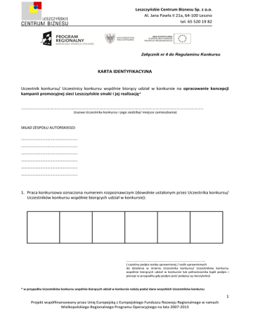 Leszczyńskie Centrum Biznesu Sp. z o.o. Al. Jana Pawła II 21a, 64-100 Leszno tel. 65 520 19 82 Załącznik nr 4 do Regulaminu Konkursu KARTA IDENTYFIKACYJNA Uczestnik konkursu/ Uczestnicy konkursu wspólnie biorący udział w konkursie na opracowanie koncepcji kampanii promocyjnej sieci Leszczyńskie smaki i jej realizację* ..…………………………………………………………………………………………………………………………………………….……………………………………… (nazwa Uczestnika konkursu i jego siedziba/ miejsce zamieszkania) SKŁAD ZESPOŁU AUTORSKIEGO: …………………………………………………. …………………………………………………. …………………………………………………. …………………………………………………. …………………………………………………. …………………………………………………. 1. Praca konkursowa oznaczona numerem rozpoznawczym (dowolnie ustalonym przez Uczestnika konkursu/ Uczestników konkursu wspólnie biorących udział w konkursie): …………………………………………………………………………………….…. ( czytelny podpis osoby uprawnionej / osób uprawnionych do działania w imieniu Uczestnika konkursu/ Uczestników konkursu wspólnie biorących udział w konkursie lub pełnomocnika bądź podpis i pieczęć w przypadku gdy podpis jest/ podpisy są nieczytelne) * w przypadku Uczestników konkursu wspólnie biorących udział w konkursie należy podać dane wszystkich Uczestników konkursu 1 Projekt współfinansowany przez Unię Europejską z Europejskiego Funduszu Rozwoju Regionalnego w ramach Wielkopolskiego Regionalnego Programu Operacyjnego na lata 2007-2013
