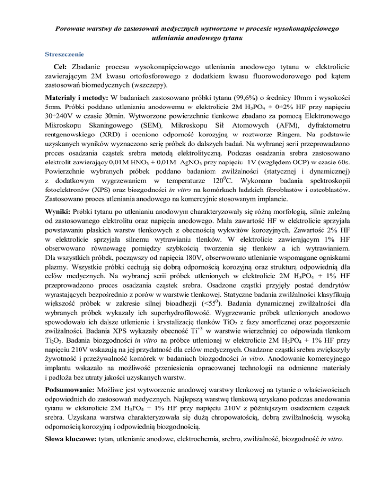 Porowate warstwy do zastosowań medycznych wytworzone w procesie wysokonapięciowego utleniania anodowego tytanu Streszczenie Cel: Zbadanie procesu wysokonapięciowego utleniania anodowego tytanu w elektrolicie zawierającym 2M kwasu ortofosforowego z dodatkiem kwasu fluorowodorowego pod kątem zastosowań biomedycznych (wszczepy). Materiały i metody: W badaniach zastosowano próbki tytanu (99,6%) o średnicy 10mm i wysokości 5mm. Próbki poddano utlenianiu anodowemu w elektrolicie 2M H3PO4 + 0÷2% HF przy napięciu 30÷240V w czasie 30min. Wytworzone powierzchnie tlenkowe zbadano za pomocą Elektronowego Mikroskopu Skaningowego (SEM), Mikroskopu Sił Atomowych (AFM), dyfraktometru rentgenowskiego (XRD) i oceniono odporność korozyjną w roztworze Ringera. Na podstawie uzyskanych wyników wyznaczono serię próbek do dalszych badań. Na wybranej serii przeprowadzono proces osadzania cząstek srebra metodą elektrolityczną. Podczas osadzania srebra zastosowano elektrolit zawierający 0,01M HNO3 + 0,01M AgNO3 przy napięciu -1V (względem OCP) w czasie 60s. Powierzchnie wybranych próbek poddano badaniom zwilżalności (statycznej i dynamicznej) z dodatkowym wygrzewaniem w temperaturze 1200C. Wykonano badania spektroskopii fotoelektronów (XPS) oraz biozgodności in vitro na komórkach ludzkich fibroblastów i osteoblastów. Zastosowano proces utleniania anodowego na komercyjnie stosowanym implancie. Wyniki: Próbki tytanu po utlenianiu anodowym charakteryzowały się różną morfologią, silnie zależną od zastosowanego elektrolitu oraz napięcia anodowego. Mała zawartość HF w elektrolicie sprzyjała powstawaniu płaskich warstw tlenkowych z obecnością wykwitów korozyjnych. Zawartość 2% HF w elektrolicie sprzyjała silnemu wytrawianiu tlenków. W elektrolicie zawierającym 1% HF obserwowano równowagę pomiędzy szybkością tworzenia się tlenków a ich wytrawianiem. Dla wszystkich próbek, począwszy od napięcia 180V, obserwowano utlenianie wspomagane ogniskami plazmy. Wszystkie próbki cechują się dobrą odpornością korozyjną oraz strukturą odpowiednią dla celów medycznych. Na wybranej serii próbek utlenionych w elektrolicie 2M H3PO4 + 1% HF przeprowadzono proces osadzania cząstek srebra. Osadzone cząstki przyjęły postać dendrytów wyrastających bezpośrednio z porów w warstwie tlenkowej. Statyczne badania zwilżalności klasyfikują większość próbek w zakresie silnej bioadhezji (<550). Badania dynamicznej zwilżalności dla wybranych próbek wykazały ich superhydrofilowość. Wygrzewanie próbek utlenionych anodowo spowodowało ich dalsze utlenienie i krystalizację tlenków TiO2 z fazy amorficznej oraz pogorszenie zwilżalności. Badania XPS wykazały obecność Ti+3 w warstwie wierzchniej co odpowiada tlenkom Ti2O3. Badania biozgodności in vitro na próbce utlenionej w elektrolicie 2M H3PO4 + 1% HF przy napięciu 210V wskazują na jej przydatność dla celów medycznych. Osadzone cząstki srebra zwiększyły żywotność i przeżywalność komórek w badaniach biozgodności in vitro. Anodowanie komercyjnego implantu wskazało na możliwość przeniesienia opracowanej technologii na odmienne materiały i podłoża bez utraty jakości uzyskanych warstw. Podsumowanie: Możliwe jest wytworzenie anodowej warstwy tlenkowej na tytanie o właściwościach odpowiednich do zastosowań medycznych. Najlepszą warstwę tlenkową uzyskano podczas anodowania tytanu w elektrolicie 2M H3PO4 + 1% HF przy napięciu 210V z późniejszym osadzeniem cząstek srebra. Uzyskana warstwa charakteryzowała się dużą chropowatością, dobrą zwilżalnością, wysoką odpornością korozyjną i odpowiednią biozgodnością. Słowa kluczowe: tytan, utlenianie anodowe, elektrochemia, srebro, zwilżalność, biozgodność in vitro.