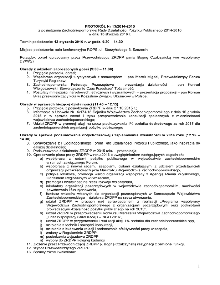 PROTOKÓŁ Nr 13/2014-2016 z posiedzenia Zachodniopomorskiej Rady Działalności Pożytku Publicznego 2014-2016 w dniu 13 stycznia 2016 r. Termin posiedzenia: 13 stycznia 2016 r. w godz. 9.30 – 14.30 Miejsce posiedzenia: sala konferencyjna ROPS, ul. Starzyńskiego 3, Szczecin Porządek obrad opracowany przez Przewodniczącą ZRDPP panią Bognę Czałczyńską (we współpracy z WWS). Obrady z udziałem zaproszonych gości (9:30 – 11.30) 1. Przyjęcie porządku obrad; 2. Współpraca organizacji turystycznych z samorządem – pan Marek Migdal, Przewodniczący Forum Turystyki Regionów; 3. Zachodniopomorska Federacja Pozarządowa – prezentacja działalności – pan Konrad Wielgoszewski, Stowarzyszenie Czas Przestrzeń Tożsamość; 4. Postulaty mniejszości narodowych, etnicznych i wyznaniowych – prezentacja propozycji – pan Roman Biłas przewodniczący koła w Koszalinie Związku Ukraińców w Polsce. Obrady w sprawach bieżącej działalności (11.45 – 12.15) 5. Przyjęcie protokołu z posiedzenia ZRDPP w dniu 27.10.2015 r.; 6. Informacja o Uchwale Nr IX/174/15 Sejmiku Województwa Zachodniopomorskiego z dnia 15 grudnia 2015 r. w sprawie zasad i trybu przeprowadzania konsultacji społecznych z mieszkańcami województwa zachodniopomorskiego; 7. Udział ZRDPP w promocji akcji na rzecz przekazywania 1% podatku dochodowego za rok 2015 dla zachodniopomorskich organizacji pożytku publicznego; Obrady w sprawie podsumowania dotychczasowej i zaplanowania działalności w 2016 roku (12.15 – 14.30) 8. Sprawozdanie z I Ogólnopolskiego Forum Rad Działalności Pożytku Publicznego, jako inspiracja do dalszej działalności; 9. Podsumowanie działalności ZRDPP w 2015 roku – prezentacja; 10. Opracowanie planu pracy ZRDPP w roku 2016 z uwzględnieniem następujących zagadnień: a) współpraca z radami pożytku publicznego w województwie zachodniopomorskim w ramach zawiązanego Forum, b) współpraca z innymi radami, zespołami, ciałami działającymi z udziałem przedstawicieli organizacji pozarządowych przy Marszałku Województwa Zachodniopomorskiego, c) polityka lokalowa, promocja wśród organizacji współpracy z Agencją Mienia Wojskowego, Oddziałem Regionalnym w Szczecinie, d) promocja i działalność na rzecz rozwoju wolontariatu, e) inkubatory organizacji pozarządowych w województwie zachodniopomorskim, możliwości powstawania i funkcjonowania, f) fundusz wkładów własnych dla organizacji pozarządowych w Samorządzie Województwa Zachodniopomorskiego – działania ZRDPP na rzecz utworzenia, g) udział ZRDPP w pracach nad sprawozdaniem z realizacji „Programu współpracy Województwa Zachodniopomorskiego z organizacjami pozarządowymi oraz podmiotami prowadzącymi działalność pożytku publicznego na rok 2015”, h) udział ZRDPP w przeprowadzeniu konkursu Marszałka Województwa Zachodniopomorskiego „Lider Współpracy SAMORZĄD – NGO 2016”, i) udział ZRDPP w przygotowaniu i realizacji akcji 1% podatku dla zachodniopomorskich opp, j) szkolenie z technik i narzędzi konsultacji, k) szkolenie z budowania relacji i podnoszenia efektywności pracy w zespole, l) zmiany w Regulaminie ZRDPP, m) posiedzenia wyjazdowe ZRDPP, n) wybory do ZRDPP kolejnej kadencji. 11. Złożenie przez Przewodniczącą ZRDPP p. Bognę Czałczyńską rezygnacji z pełnionej funkcji. 12. Wybór Przewodniczącego ZRDPP. 13. Sprawy różne i wniesione: 1 a) Ustalenie godziny spotkań ZRDPP (godziny dotychczasowe, tj. w czasie pracy urzędowej lub godziny popołudniowe). Przebieg posiedzenia: 1. Otwarcie posiedzenia przez panią przewodniczącą B. Czałczyńską. Powitanie zaproszonych gości. 2. W związku z punktem dotyczącym przyjęcia porządku obrad pani E. Gizy złożyła propozycję o przeniesienie części punktów porządku na kolejne posiedzenie. Uzasadnienie: bardzo duża ilość spraw w porządku obrad, w tym z udziałem zaproszonych gości. Pan K. Drzazga poprosił o doprecyzowanie zmian. Zmiany zaproponowane przez panią E. Gizę: przeniesienie punktów 8, 9, 10 na kolejne posiedzenie. Pani B. Jaskierska zgłosiła uwagę o zbieżności punktów 7 oraz 10 i). Pani B. Czałczyńska wyjaśniła, iż pkt 7 to sprawy bieżące a pkt 10 i) – jeden z tematów do ujęcia w planie. W tym miejscu pani M. Kuncewicz złożyła wniosek o rozpoczęciu w tej chwili części z udziałem obecnych gości i przeniesieniu dyskusji nad porządkiem obrad na część dotyczącą spraw bieżących ZRDPP. Pani B. Czałczyńska zadecydowała o przyjęciu w tym momencie obrad porządku w istniejącym kształcie, a w części bez udziału o ustaleniu ewentualnych zmian. W tym miejscu pan J. Kotlęga wniósł uwagę o konieczności przyjęcia porządku w tym momencie posiedzenia oraz propozycję przegłosowania wniosku złożonego przez panią E. Gizę. Kolejny wniosek zgłosiła pani I. Olejnik-Czerwonka: o wykreślenie punktu 11 w związku z fizycznym brakiem rezygnacji. Co za tym idzie wykreślenia wymaga także punkt 12. Pani przewodnicząca B. Czałczyńska upewniła się, iż porządek obrad rozsyłany był w kształcie posiadanym przez obecnych. Ponownie zaproponowała, aby porządek przyjąć w takim kształcie, a w dalszej części posiedzenia przedyskutować ewentualne zmiany. W tym miejscy pani przewodnicząca zarządziła głosowanie za przyjęciem porządku obrad. Przy 15 obecnych członkach Rady oddano 11 głosów „za” przyjęciem porządku obrad, 2 „przeciw” i 2 wstrzymujące się. 3. W dalszej części obrad pani przewodnicząca zapowiedziała prezentację Współpraca organizacji turystycznych z samorządem i powitała gości. W tym miejscu pani M. Kuncewicz zaproponowała przedstawienie się członków Rady oraz wszystkich obecnych gości. Dokonano prezentacji. W dalszej kolejności pan Marek Migdal zaprezentował działalność organizacji turystycznych oraz omówił ich współpracę z samorządami w województwie zachodniopomorskim. Dużym mankamentem działalno
