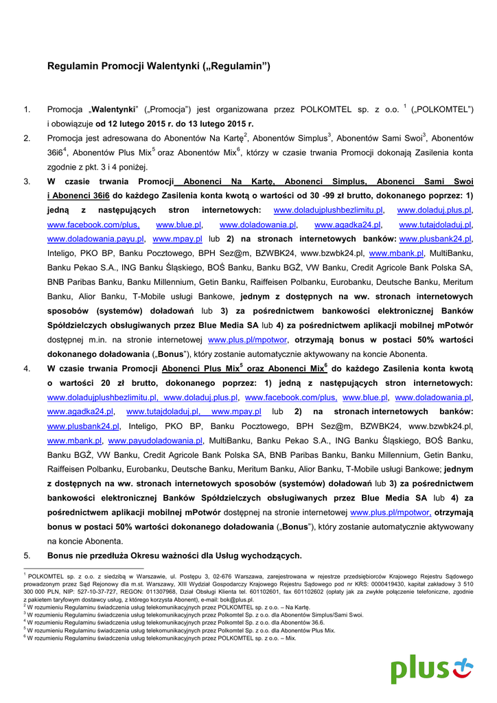 Regulamin Promocji Walentynki („Regulamin”) 1. Promocja „Walentynki” („Promocja”) jest organizowana przez POLKOMTEL sp. z o.o. 1 („POLKOMTEL”) i obowiązuje od 12 lutego 2015 r. do 13 lutego 2015 r. 2. 2 3 3 Promocja jest adresowana do Abonentów Na Kartę , Abonentów Simplus , Abonentów Sami Swoi , Abonentów 4 5 6 36i6 , Abonentów Plus Mix oraz Abonentów Mix , którzy w czasie trwania Promocji dokonają Zasilenia konta zgodnie z pkt. 3 i 4 poniżej. 3. W czasie trwania Promocji Abonenci Na Kartę, Abonenci Simplus, Abonenci Sami Swoi i Abonenci 36i6 do każdego Zasilenia konta kwotą o wartości od 30 -99 zł brutto, dokonanego poprzez: 1) jedną z następujących www.facebook.com/plus, stron internetowych: www.blue.pl, www.doladujplushbezlimitu.pl, www.doladowania.pl, www.agadka24.pl, www.doladuj.plus.pl, www.tutajdoladuj.pl, www.doladowania.payu.pl, www.mpay.pl lub 2) na stronach internetowych banków: www.plusbank24.pl, Inteligo, PKO BP, Banku Pocztowego, BPH Sez@m, BZWBK24, www.bzwbk24.pl, www.mbank.pl, MultiBanku, Banku Pekao S.A., ING Banku Śląskiego, BOŚ Banku, Banku BGŻ, VW Banku, Credit Agricole Bank Polska SA, BNB Paribas Banku, Banku Millennium, Getin Banku, Raiffeisen Polbanku, Eurobanku, Deutsche Banku, Meritum Banku, Alior Banku, T-Mobile usługi Bankowe, jednym z dostępnych na ww. stronach internetowych sposobów (systemów) doładowań lub 3) za pośrednictwem bankowości elektronicznej Banków Spółdzielczych obsługiwanych przez Blue Media SA lub 4) za pośrednictwem aplikacji mobilnej mPotwór dostępnej m.in. na stronie internetowej www.plus.pl/mpotwor, otrzymają bonus w postaci 50% wartości dokonanego doładowania („Bonus”), który zostanie automatycznie aktywowany na koncie Abonenta. 4. 5 6 W czasie trwania Promocji Abonenci Plus Mix oraz Abonenci Mix do każdego Zasilenia konta kwotą o wartości 20 zł brutto, dokonanego poprzez: 1) jedną z następujących stron internetowych: www.doladujplushbezlimitu.pl, www.doladuj.plus.pl, www.facebook.com/plus, www.blue.pl, www.doladowania.pl, www.agadka24.pl, www.tutajdoladuj.pl, www.mpay.pl lub 2) na stronach internetowych banków: www.plusbank24.pl, Inteligo, PKO BP, Banku Pocztowego, BPH Sez@m, BZWBK24, www.bzwbk24.pl, www.mbank.pl, www.payudoladowania.pl, MultiBanku, Banku Pekao S.A., ING Banku Śląskiego, BOŚ Banku, Banku BGŻ, VW Banku, Credit Agricole Bank Polska SA, BNB Paribas Banku, Banku Millennium, Getin Banku, Raiffeisen Polbanku, Eurobanku, Deutsche Banku, Meritum Banku, Alior Banku, T-Mobile usługi Bankowe; jednym z dostępnych na ww. stronach internetowych sposobów (systemów) doładowań lub 3) za pośrednictwem bankowości elektronicznej Banków Spółdzielczych obsługiwanych przez Blue Media SA lub 4) za pośrednictwem aplikacji mobilnej mPotwór dostępnej na stronie internetowej www.plus.pl/mpotwor, otrzymają bonus w postaci 50% wartości dokonanego doładowania („Bonus”), który zostanie automatycznie aktywowany na koncie Abonenta. 5. 1 Bonus nie przedłuża Okresu ważności dla Usług wychodzących. POLKOMTEL sp. z o.o. z siedzibą w Warszawie, ul. Postępu 3, 02-676 Warszawa, zarejestrowana w rejestrze przedsiębiorców Krajowego Rejestru Sądowego prowadzonym przez Sąd Rejonowy dla m.st. Warszawy, XIII Wydział Gospodarczy Krajowego Rejestru Sądowego pod nr KRS: 0000419430, kapitał zakładowy 3 510 300 000 PLN, NIP: 527-10-37-727, REGON: 011307968, Dział Obsługi Klienta tel. 601102601, fax 601102602 (opłaty jak za zwykłe połączenie telefoniczne, zgodnie z pakietem taryfowym dostawcy usług, z którego korzysta Abonent), e-mail: [email protected]. 2 W rozumieniu Regulaminu świadczenia usług telekomunikacyjnych przez POLKOMTEL sp. z o.o. – Na Kartę. 3 W rozumieniu Regulaminu świadczenia usług telekomunikacyjnych przez Polkomtel Sp. z o.o. dla Abonentów Simplus/Sami Swoi. 4 W rozumieniu Regulaminu świadczenia usług telekomunikacyjnych przez Polkomtel Sp. z o.o. dla Abonentów 36.6. 5 W rozumieniu Regulaminu świadczenia usług telekomunikacyjnych przez Polkomtel Sp. z o.o. dla Abonentów Plus Mix. 6 W rozumieniu Regulaminu świadczenia usług telekomunikacyjnych przez POLKOMTEL sp. z o.o. – Mix. 6. Bonus może być wykorzystany na wszystkie usługi telekomunikacyjne dostępne dla danego Abonenta określonego w pkt. 2 Regulaminu zgodnie z taryfą, z której korzysta. 7. W kwestiach nieuregulowanych Regulaminem zastosowanie mają odpowiednio postanowienia Regulaminu świadczenia usług telekomunikacyjnych przez POLKOMTEL Sp. z o.o. dla Abonentów Simplus/Sami Swoi (dla Umów zawartych przed 25.12.2014r.), Regulaminu świadczenia usług telekomunikacyjnych przez POLKOMTEL Sp. z o.o. dla Abonentów 36.6 (dla Umów zawartych przed 25.12.2014r.), Regulaminu świadczenia usług telekomunikacyjnych przez POLKOMTEL sp. z o.o. – Na Kartę (dla Umów zawartych od 25.12.2014 r.), Regulaminu świadczenia usług telekomunikacyjnych przez POLKOMTEL Sp. z o.o. dla Abonentów Plus Mix (dla Umów zawartych przed 25.12.2014 r.) lub Regulaminu świadczenia usług telekomunikacyjnych przez POLKOMTEL sp. z o.o. – Mix (dla Umów zawartych przed 25.12.2014 r.), o ile Regulamin nie stanowi inaczej. 8. POLKOMTEL może zakończyć świadczenie usług w ramach aktywowanej Promocji lub dokonać zmiany warunków Promocji na podstawie wypowiedzenia dokonanego na 30 dni przed zakończeniem Promocji lub wejściem w życie nowych warunków Promocji. Wypowiedzenie nastąpi SMS-em wysłanym na numer telefonu Abonenta, który skorzystał z Promocji. 9. Informacja o odwołaniu Promocji zostanie podana przez Polkomtel do wiadomości publicznej na stronie internetowej www.plus.pl oraz na stronach internetowych www.doladuj.plus.pl, www.facebook.com/plus. 10. Regulamin dostępny jest na stronach internetowych, www.plus.pl, www.facebook.com/plus, w siedzibie POLKOMTEL oraz w Punktach Sprzedaży i Salonach Firmowych sieci Plus.