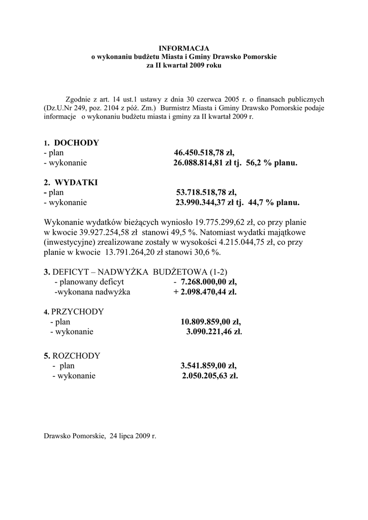 INFORMACJA o wykonaniu budżetu Miasta i Gminy Drawsko Pomorskie za II kwartał 2009 roku Zgodnie z art. 14 ust.1 ustawy z dnia 30 czerwca 2005 r. o finansach publicznych (Dz.U.Nr 249, poz. 2104 z póź. Zm.) Burmistrz Miasta i Gminy Drawsko Pomorskie podaje informacje o wykonaniu budżetu miasta i gminy za II kwartał 2009 r. 1. DOCHODY - plan - wykonanie 46.450.518,78 zł, 26.088.814,81 zł tj. 56,2 % planu. 2. WYDATKI - plan - wykonanie 53.718.518,78 zł, 23.990.344,37 zł tj. 44,7 % planu. Wykonanie wydatków bieżących wyniosło 19.775.299,62 zł, co przy planie w kwocie 39.927.254,58 zł stanowi 49,5 %. Natomiast wydatki majątkowe (inwestycyjne) zrealizowane zostały w wysokości 4.215.044,75 zł, co przy planie w kwocie 13.791.264,20 zł stanowi 30,6 %. 3. DEFICYT – NADWYŻKA BUDŻETOWA (1-2) - planowany deficyt - 7.268.000,00 zł, -wykonana nadwyżka + 2.098.470,44 zł. 4. PRZYCHODY - plan - wykonanie 10.809.859,00 zł, 3.090.221,46 zł. 5. ROZCHODY - plan - wykonanie 3.541.859,00 zł, 2.050.205,63 zł. Drawsko Pomorskie, 24 lipca 2009 r.