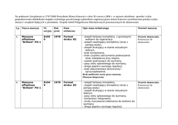 Na podstawie Zarządzenia nr 2747/2006 Prezydenta Miasta Katowice z dnia 30 czerwca 2006 r. w sprawie określenia sposobu i trybu gospodarowania składnikami majątku ruchomego powierzonego jednostkom organizacyjnym miasta Katowice przedstawiam poniżej wykaz maszyn i urządzeń będących w posiadaniu Zespołu Szkół Poligraficzno-Mechanicznych przeznaczonych do złomowania: Lp Nazwa maszyny Nr Rok seryjny prod. Dane techniczne Opis stanu technicznego Wartość maszyny 1. Maszyna offsetowa "Brillant" PO-1 8105 0 1978 Format druku: B2 - zespół farbowy kompletny, z gumowymi wałkami do regeneracji, - zespół nawilżający kompletny (wraz z pompą wody), - zespół drukujący w stanie wizualnym dobrym, - brak kompresora, - brak czujnika zatrzymania podnoszenia stołu nakładacza przy stopce, - ssawki podnoszące do wymiany, - pasy stołu spływowego do wymiany, - droga papieru wymaga regulacji, - brak dokumentacji technicznej i oprzyrządowania. Brak możliwości oceny pracy maszyny. Maszyna niesprawna. Wartość złomowania. Przeznaczyć do złomowania 2. Maszyna offsetowa "Brillant" PO-1 8104 9 1978 Format druku: B2 - zespół farbowy kompletny - zespół nawilżający kompletny (wraz z pompą wody) - zespół drukujący w stanie wizualnym dobrym - pasy stołu spływowego do wymiany, - kompresor niesprawny - śruby mocowania kałamarza do duktora do wymiany - droga papieru wymaga regulacji Wartość złomowania. Przeznaczyć do złomowania - brak dokumentacji technicznej i oprzyrządowania. Brak możliwości oceny pracy maszyny. Maszyna niesprawna. 3. Krajarka Perfecta SEYPA 92 2190 1 1975 długość cięcia: 920mm, - nie trzymanie parametrów podczas krojenia - niesprawny układ elektryczny - niesprawny układ fotoelektryczny zabezpieczający - brak pokrętła wyłącznika głównego i napędu - brak kluczyka do stacyjki - prowadzenie belki nożowej do wymiany - luzy na śrubie pociągowej siodełka - widoczne ślady długotrwałego nie użytkowania - brak oprzyrządowania - brak dokumentacji technicznej. Maszyna niesprawna Wartość złomowania. Przeznaczyć do złomowania 4. Krajarka Maxima MS-80 RVP 3571 07 1982 długość cięcia - 800 mm - brak trzymania parametrów krojenia wymagana naprawa łożyskowania siodełka wymagana naprawa pompy docisku do wymiany pas napędowy brak oprzyrządowania i dokumentacji technicznej. Maszyna niesprawna. Wartość złomowania. Przeznaczyć do złomowania 5. Krajarka Maxima MH80-3 524 1978 długość cięcia - 800 mm, - uszkodzenie elektryczne - zawieszanie się podczas pracy - brak elektrycznych przycisków posuwu Wartość złomowania. Przeznaczyć do złomowania siodełka - brak utrzymania parametrów krojenia - brak noża i śrub mocujących - brak oprzyrządowania i dokumentacji technicznej - widoczne ślady długotrwałego nie użytkowania. Maszyna niesprawna. 6. Maszyna drukująca Grafopress 2168 5 1968 - części stalowe zardzewiałe, - układ elektryczny do wymiany - brak pasa napędowego - brak dźwigni zesprzęglania maszyny - brak oprzyrządowania i dokumentacji technicznej Maszyna niesprawna. Wartość złomowania Przeznaczyć do złomowania 7. Maszyna drukująca dociskowa "PhoenixPress" 1182 4 1953 - brak zespołu drukującego, - brak napędu, - brak sterowania napędu, - uszkodzone koła zębate, - luzy na panewkach, - brak oprzyrządowania i dokumentacji maszyny Maszyna niesprawna Wartość złomowania Przeznaczyć do złomowania Wszystkie w/w maszyny pozostają od wielu lat wyłączone z eksploatacji i zgodnie z wymienionym Zarządzeniem Prezydenta Miasta Katowice będą złomowane. Maszyny i urządzenia mogą być sprzedane w cenie złomu. Sprzedaży każdego urządzenia dokonuje się tylko w całości Ewentualnych chętnych do zagospodarowania proszę o pisemne zgłoszenie deklaracji zakupu przesyłając ją na adres szkoły: Zespół Szkół Poligraficzno Mechanicznych im. A. Krajowej ul. A. Krajowej 84, 40-671 Katowice lub osobiste złożenie w sekretariacie szkoły pod w/w adresem w terminie: do 17 kwietnia 2013 r. do godz. 14.00 Pismo powinno zawierać: 1. nazwę, siedzibę i adres – lub imię i nazwisko i adres występującego o sprzedaż 2. wskazanie z powyższego zestawienia rodzaju urządzenia do zakupu 3. oświadczenie, że sprzedany składnik majątku – po zapłaceniu należności – zostanie odebrany w miejscu i czasie wskazanym przez sprzedającego Podania będą rozpatrywane wg kolejności wpływu. Koszty ewentualnego demontażu i transportu pokrywa kupujący. Telefon do kontaktu: 32 20 28 463 Dyrektor Szkoły Ryszard Jaworski Katowice, 10 kwietnia 2013 r.