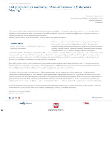 Czwartek, 23 października 2014 List prezydenta na konferencji "Annual Business in Małopolska Meeting" Uczestnicy i Organizatorzy konferencji Annual Business in Ma łopolska Meeting “Biznes nie zna granic ” w Krakowie Ćwier ćwiecze polskiej wolności przynios ło wiele dokona ń. Szczególnie imponuj ące – tak że zdaniem zagranicznych obserwatorów – są nasze sukcesy gospodarcze. Polska gospodarka ro śnie nieprzerwanie od ponad dwudziestu lat. W ci ągu ćwier ćwiecza polski PKB zwi ększy ł się ponad dwukrotnie, a prognozy na najbli ższe lata okre ślaj ą nasz wzrost na poziomie przeszło 3 procent rocznie. Wa żnym wspó łtwórc ą polskiego sukcesu jest aktywna Ma łopolska. Składam wyrazy uznania ma łopolskim działaczom gospodarczym i wszystkim, Zobacz także: Doradca Krzysztof Król na konferencji Annual Business in Małopolska Meeting 2014 którzy buduj ą pozytywny klimat dla przedsi ębiorczości. W Ma łopolsce łatwo przekona ć się o sile najlepszych polskich tradycji, po łą czonych z modernizacyjnym zapałem. To region wysokich technologii, innowacji, gospodarki opartej na wiedzy. Rozwojowe impulsy p łyn ą z Krakowa, jednego z najwi ększych o środków akademickich w Polsce. Inwestycj ą w przysz łość Małopolski są rosnące nak łady na dzia łalno ść badawczo -rozwojową. Cieszę się, że właśnie Kraków sta ł się miejscem spotka ń, gromadz ących środowiska gospodarcze, akademickie i samorz ądowe. Tegoroczna debata pod has łem „Biznes nie zna granic ” jest podwójnie inspiruj ąca: z jednej strony podkre śla, że rozmach przedsi ębiorczości zale żyod ambicji i wyobra źni, z drugiej za ś – że granice pa ństw nie powinny by ć przeszkodą dla wzajemnie korzystnej wspó łpracy gospodarczej. Przyk ładem wybiegaj ącego w przysz łość biznesu bez granic jest sukces i potencja ł Krakowskiego Parku Technologicznego. To ogromne innowacyjne przedsięwzięcie,to tak że 17 tysi ęcy miejsc pracy. Z uznaniem my ślę o tym, że Park zbudowa ł pozycj ę wyspecjalizowanej instytucji otoczenia biznesu, która obok bogatej oferty dla firm realizuje równie ż projekty strategiczne dla województwa ma łopolskiego. Tak w łaśnie nale ży pojmowa ć wyzwania dotycz ące sukcesu gospodarczego – wzrost gospodarczy jest bowiem procesem, a nie jednorazowym osiągni ęciem. Jednym z przepisów na trwa ły sukces jest wspó łpraca pomi ędzy środowiskiem akademickim, biznesowym i administracyjnym, czego dobrym przyk ładem jest Ma łopolska. Dzięki temu powsta ł w tym regionie ekosystem nowoczesnej gospodarki. Wa żną rolę w rozwoju przedsi ębiorczości pełni samorz ąd terytorialny, który w przysz łym roku obchodzi ć będzie swe 25 -lecie. To w łaśnie samorz ąd, znawca lokalnych spraw, powinien by ć najbli żej problemów przedsi ębiorców. Cieszę się, że łą czą się tutaj punkty widzenia i mo żliwości działania dla wspólnego dobra mieszka ńców Małopolski. Serdecznie gratuluj ę wszystkim dzisiaj wyró żnionym Ma łopolskimi Nagrodami Gospodarczymi. Pokazuj ą Państwo, jak by ć kreatywnym i umacnia ć kapita ł społeczny. Życz ę owocnych obrad, życz ę sukcesów gospodarczych s łużących ma łopolskiej społeczności. Prezydent Rzeczypospolitej Polskiej Bronisław Komorowski Poleć znajomemu