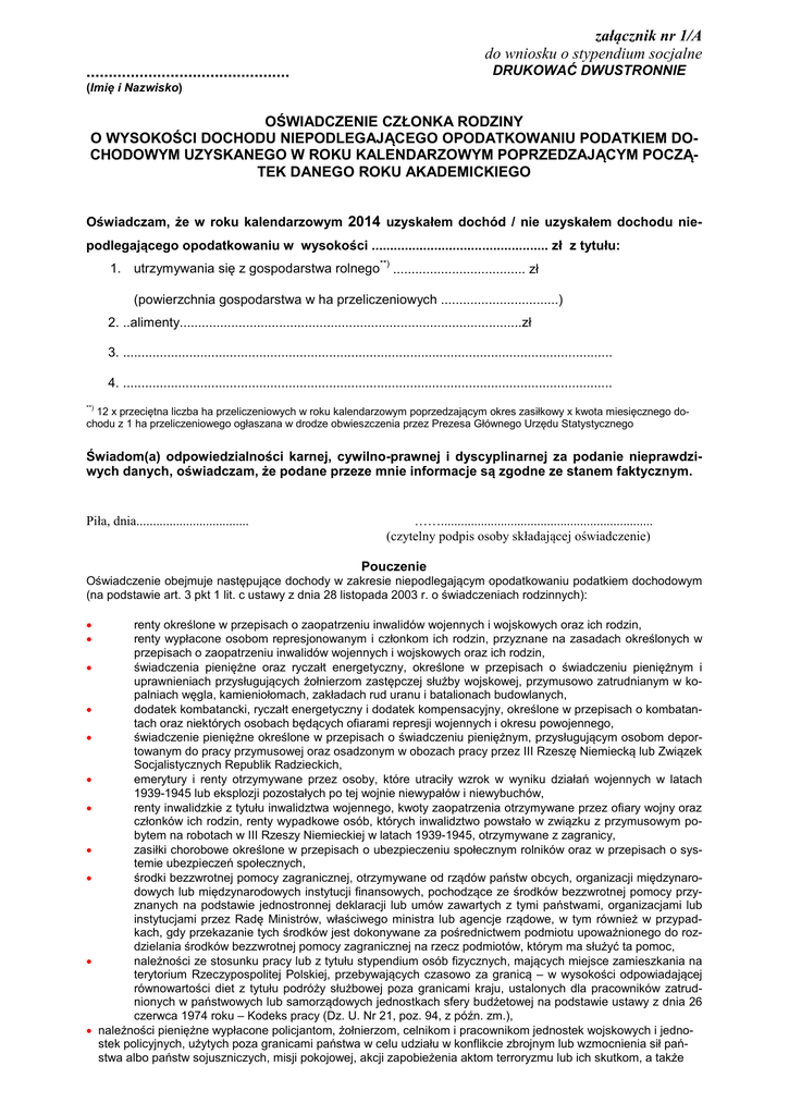 załącznik nr 1/A do wniosku o stypendium socjalne DRUKOWAĆ DWUSTRONNIE .............................................. (Imię i Nazwisko) OŚWIADCZENIE CZŁONKA RODZINY O WYSOKOŚCI DOCHODU NIEPODLEGAJĄCEGO OPODATKOWANIU PODATKIEM DOCHODOWYM UZYSKANEGO W ROKU KALENDARZOWYM POPRZEDZAJĄCYM POCZĄTEK DANEGO ROKU AKADEMICKIEGO Oświadczam, że w roku kalendarzowym 2014 uzyskałem dochód / nie uzyskałem dochodu niepodlegającego opodatkowaniu w wysokości ................................................ zł z tytułu: 1. utrzymywania się z gospodarstwa rolnego **) .................................... zł (powierzchnia gospodarstwa w ha przeliczeniowych ................................) 2. ..alimenty.............................................................................................zł 3. ..................................................................................................................................... 4. ..................................................................................................................................... 12 x przeciętna liczba ha przeliczeniowych w roku kalendarzowym poprzedzającym okres zasiłkowy x kwota miesięcznego dochodu z 1 ha przeliczeniowego ogłaszana w drodze obwieszczenia przez Prezesa Głównego Urzędu Statystycznego **) Świadom(a) odpowiedzialności karnej, cywilno-prawnej i dyscyplinarnej za podanie nieprawdziwych danych, oświadczam, że podane przeze mnie informacje są zgodne ze stanem faktycznym. Piła, dnia.................................. ……................................................................ (czytelny podpis osoby składającej oświadczenie) Pouczenie Oświadczenie obejmuje następujące dochody w zakresie niepodlegającym opodatkowaniu podatkiem dochodowym (na podstawie art. 3 pkt 1 lit. c ustawy z dnia 28 listopada 2003 r. o świadczeniach rodzinnych): • • • • • • • • • • • renty określone w przepisach o zaopatrzeniu inwalidów wojennych i wojskowych oraz ich rodzin, renty wypłacone osobom represjonowanym i członkom ich rodzin, przyznane na zasadach określonych w przepisach o zaopatrzeniu inwalidów wojennych i wojskowych oraz ich rodzin, świadczenia pieniężne oraz ryczałt energetyczny, określone w przepisach o świadczeniu pieniężnym i uprawnieniach przysługujących żołnierzom zastępczej służby wojskowej, przymusowo zatrudnianym w kopalniach węgla, kamieniołomach, zakładach rud uranu i batalionach budowlanych, dodatek kombatancki, ryczałt energetyczny i dodatek kompensacyjny, określone w przepisach o kombatantach oraz niektórych osobach będących ofiarami represji wojennych i okresu powojennego, świadczenie pieniężne określone w przepisach o świadczeniu pieniężnym, przysługującym osobom deportowanym do pracy przymusowej oraz osadzonym w obozach pracy przez III Rzeszę Niemiecką lub Związek Socjalistycznych Republik Radzieckich, emerytury i renty otrzymywane przez osoby, które utraciły wzrok w wyniku działań wojennych w latach 1939-1945 lub eksplozji pozostałych po tej wojnie niewypałów i niewybuchów, renty inwalidzkie z tytułu inwalidztwa wojennego, kwoty zaopatrzenia otrzymywane przez ofiary wojny oraz członków ich rodzin, renty wypadkowe osób, których inwalidztwo powstało w związku z przymusowym pobytem na robotach w III Rzeszy Niemieckiej w latach 1939-1945, otrzymywane z zagranicy, zasiłki chorobowe określone w przepisach o ubezpieczeniu społecznym rolników oraz w przepisach o systemie ubezpieczeń społecznych, środki bezzwrotnej pomocy zagranicznej, otrzymywane od rządów państw obcych, organizacji międzynarodowych lub międzynarodowych instytucji finansowych, pochodzące ze środków bezzwrotnej pomocy przyznanych na podstawie jednostronnej deklaracji lub umów zawartych z tymi państwami, organizacjami lub instytucjami przez Radę Ministrów, właściwego ministra lub agencje rządowe, w tym również w przypadkach, gdy przekazanie tych środków jest dokonywane za pośrednictwem podmiotu upoważnionego do rozdzielania środków bezzwrotnej pomocy zagranicznej na rzecz podmiotów, którym ma służyć ta pomoc, należności ze stosunku pracy lub z tytułu stypendium osób fizycznych, mających miejsce zamieszkania na terytorium Rzeczypospolitej Polskiej, przebywających czasowo za granicą – w wysokości odpowiadającej równowartości diet z tytułu podróży służbowej poza granicami kraju, ustalonych dla pracowników zatrudnionych w państwowych lub samorządowych jednostkach sfery budżetowej na podstawie ustawy z dnia 26 czerwca 1974 roku – Kodeks pracy (Dz. U. Nr 21, poz. 94, z późn. zm.), należności pieniężne wypłacone policjantom, żołnierzom, celnikom i pracownikom jednostek wojskowych i jednostek policyjnych, użytych poza granicami państwa w celu udziału w konflikcie zbrojnym lub wzmocnienia sił państwa albo państw sojuszniczych, misji pokojowej, akcji zapobieżenia aktom terroryzmu lub ich skutkom, a także • • • • • • • • • • • • • • • • • • należności pieniężne wypłacone żołnierzom, policjantom, celnikom i pracownikom pełniącym funkcje obserwatorów w misjach pokojowych organizacji międzynarodowych i sił wielonarodowych, należności pieniężne ze stosunku służbowego, otrzymywane w czasie służby kandydackiej przez funkcjonariuszy Policji, Państwowej Straży Pożarnej, Straży Granicznej i Biura Ochrony Rządu, obliczone za okres, w którym osoby te uzyskały dochód, dochody członków rolniczych spółdzielni produkcyjnych z tytułu członkostwa w rolniczej spółdzielni produkcyjnej, pomniejszone o składki na ubezpieczenie społeczne, alimenty na rzecz dzieci, stypendia doktoranckie i habilitacyjne przyznane na podstawie ustawy z dnia 14 marca 2003 roku o stopniach naukowych i tytule naukowym oraz o stopniach i tytule w zakresie sztuki, stypendia sportowe przyznane na podstawie ustawy z dnia 25 czerwca 2010 