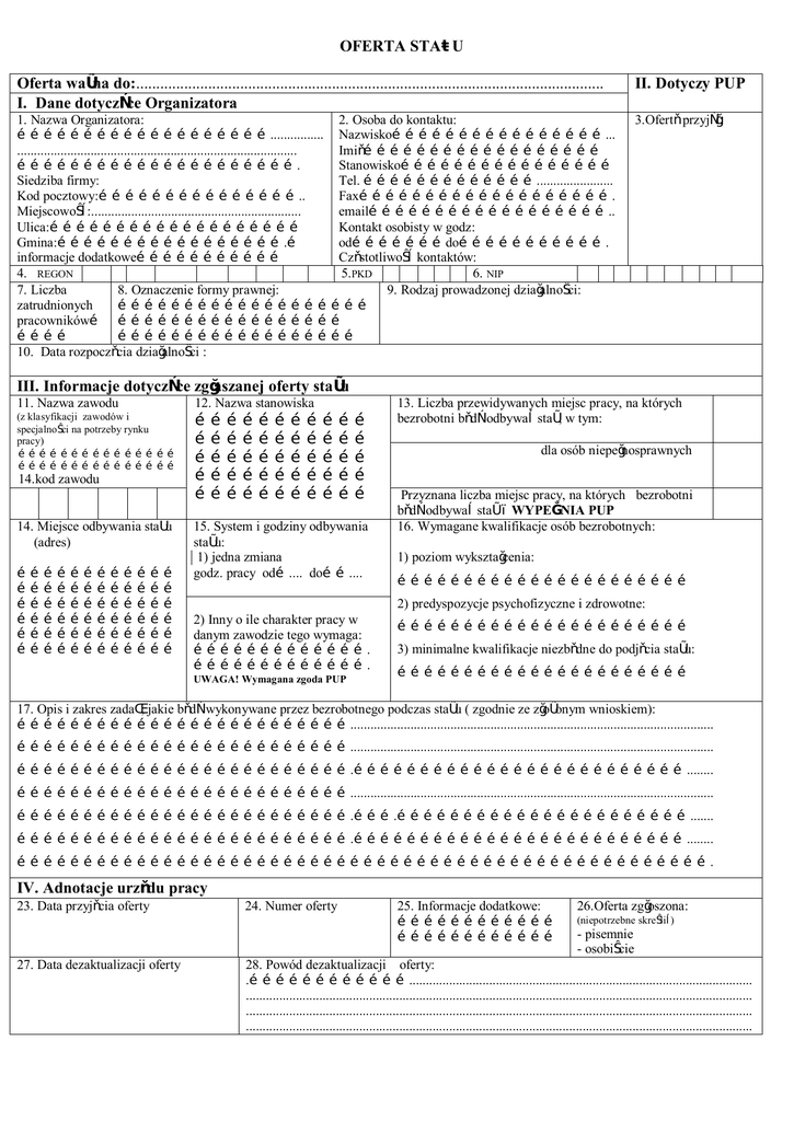 OFERTA STAŻU Oferta ważna do:..................................................................................................................... I. Dane dotyczące Organizatora II. Dotyczy PUP 1. Nazwa Organizatora: 2. Osoba do kontaktu: …………………………………………………................ Nazwisko…………………………………………... .................................................................................... Imię……………………………………………… ………………………………………………………. Stanowisko………………………………………… Siedziba firmy: Tel. …………………………………....................... Kod pocztowy:……………………………………….. Fax…………………………………………………. Miejscowość:............................................................... email……………………………………………….. Ulica:………………………………………………… Kontakt osobisty w godz: Gmina:…………………………………………….… od…………………do……………………………. informacje dodatkowe…………………………… Częstotliwość kontaktów: 4. REGON 5.PKD 6. NIP 7. Liczba 8. Oznaczenie formy prawnej: 9. Rodzaj prowadzonej działalności: zatrudnionych ………………………………………………… pracowników… …………………………………………… ………… ……………………………………………… 10. Data rozpoczęcia działalności : 3.Ofertę przyjął: III. Informacje dotyczące zgłaszanej oferty stażu 11. Nazwa zawodu 12. Nazwa stanowiska (z klasyfikacji zawodów i specjalności na potrzeby rynku pracy) ……………………………………… ……………………………………… …………………………… …………………………… …………………………… …………………………… …………………………… 14.kod zawodu 14. Miejsce odbywania stażu (adres) ……………………………… ……………………………… ……………………………… ……………………………… ……………………………… ……………………………… 15. System i godziny odbywania stażu: 1) jedna zmiana godz. pracy od….... do…….... 13. Liczba przewidywanych miejsc pracy, na których bezrobotni będą odbywać staż, w tym: dla osób niepełnosprawnych Przyznana liczba miejsc pracy, na których bezrobotni będą odbywać staż – WYPEŁNIA PUP 16. Wymagane kwalifikacje osób bezrobotnych: 1) poziom wykształcenia: ………………………………………………………… 2) predyspozycje psychofizyczne i zdrowotne: 2) Inny o ile charakter pracy w danym zawodzie tego wymaga: …………………………………. …………………………………. UWAGA! Wymagana zgoda PUP ………………………………………………………… 3) minimalne kwalifikacje niezbędne do podjęcia stażu: ………………………………………………………… 17. Opis i zakres zadań, jakie będą wykonywane przez bezrobotnego podczas stażu ( zgodnie ze złożonym wnioskiem): …………………………………………………………………............................................................................................................. …………………………………………………………………............................................................................................................. ………………………………………………………………….…………………………………………………………………........ …………………………………………………………………............................................................................................................. ………………………………………………………………….……….…………………………………………………………....... ………………………………………………………………….…………………………………………………………………........ …………………………………………………………………………………………………………………………………………. IV. Adnotacje urzędu pracy 23. Data przyjęcia oferty 27. Data dezaktualizacji oferty 24. Numer oferty 25. Informacje dodatkowe: ……………………………… ……………………………… 26.Oferta zgłoszona: (niepotrzebne skreślić) - pisemnie - osobiście 28. Powód dezaktualizacji oferty: .………………………………....................................................................................................... ........................................................................................................................................................ ........................................................................................................................................................ ........................................................................................................................................................ OŚWIADCZENIE PRACODAWCY: 1. Oświadczam ,że w okresie 365 dni przed zgłoszeniem oferty stażu zostałem/nie zostałem* ukarany lub skazany prawomocnym wyrokiem za naruszenie przepisów prawa pracy Jeżeli tak, to z jakiego tytułu……………………………………………………………………………………….. 2. Oświadczam, że jestem/nie jestem* objęty postępowaniem dotyczącym naruszenia przepisów prawa pracy Jeżeli tak, to z jakiego tytułu ……………………………………………………………………………………….. (*
