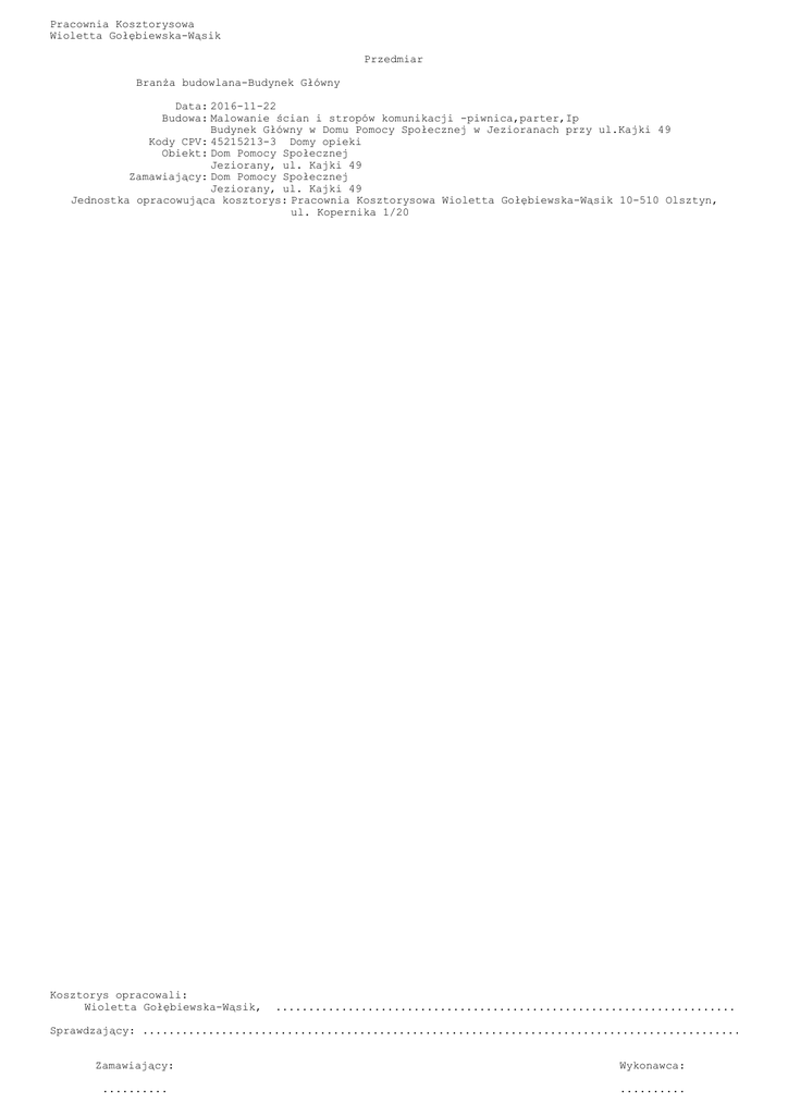 Pracownia Kosztorysowa Wioletta Gołębiewska-Wąsik Przedmiar Branża budowlana-Budynek Główny Data: 2016-11-22 Budowa: Malowanie ścian i stropów komunikacji -piwnica,parter,Ip Budynek Główny w Domu Pomocy Społecznej w Jezioranach przy ul.Kajki 49 Kody CPV: 45215213-3 Domy opieki Obiekt: Dom Pomocy Społecznej Jeziorany, ul. Kajki 49 Zamawiający: Dom Pomocy Społecznej Jeziorany, ul. Kajki 49 Jednostka opracowująca kosztorys: Pracownia Kosztorysowa Wioletta Gołębiewska-Wąsik 10-510 Olsztyn, ul. Kopernika 1/20 Kosztorys opracowali: Wioletta Gołębiewska-Wąsik, .............................................................................. Sprawdzający: ................................................................................................... Zamawiający: Wykonawca: .......... .......... Zuzia -Malowanie korytarzy w budynku głównym.-DPS Jeziorany-1 Zuzia (C) DataComp 1994-2006(lic. 11682) strona nr: 2 Przedmiar Podstawa nakładu, opis pozycji, wyliczenie ilości robót 1 Kody CPV: 45410000-4 Tynkowanie 45430000-0 Pokrywanie podłóg i ścian ELEMENT-Tynki i okładziny wewnętrzne-komunikacja 1.1 Zabezpieczenie podłógi folią na czas robót remontowych pow. podłóg 215,79 = Ilość 215,79 215,79 1.2 KNR 401/713/1 (2) Przecieranie istniejących tynków wewnętrznych, z zeskrobaniem farby lub zdzieraniem tapet, na ścianach parter-komunikacja-pom.1/1 (7,25*2+3,37*2)*3,78-(1,60* 3,10*1+1,33*2,21*1+1,33* 3,00*1+1,01*2,21*1) = 66,1658 komunikacja-pom.1/3 (1,15*2+2,47*2)*3,78-(1,33* 3,00*1+1,95*2,15*1)+(12,45* 2+2,95*2)*3,78-(1,95*2,15*1+ 1,00*2,21*1+0,78*2,20*1+ 1,10*2,25*1+1,01*2,21*3+ 1,33*3,00*2) = 110,3389 komunikacja-pom.1/14 = I piętro-komunikacja-pom.2/1 (6,56*2+2,95*2)*3,70-1,95* 66,1815 2,15*1 = komunikacja-pom.2/3 (0,95*2+2,47*2)*3,70-(1,95* 2,15*2) = 16,923 komunikacja-pom.2/8 (6,27*2+2,47*2)*3,70-(1,92* 2,15*2+1,01*2,21*2+1,02* 47,4916 2,21*1+1,00*2,21*1) = 307,1008 1.3 KNR 401/713/2 (2) Przecieranie istniejących tynków wewnętrznych, z zeskrobaniem farby lub zdzieraniem tapet, na stropach, biegach, spocznikach piwnica--pom.0/1 2,95*6,43 = 18,9685 parter-pom.1/1 3,35*7,25 = 24,2875 pom.1/3 2,89*1,15+2,89*12,45 = 39,304 pom.1/14 3,83*3,21 = 12,2943 I piętro-pom.2/1 3,79*6,56 = 24,8624 pom.2/3 0,95*2,47+6,08*2,89 = 19,9177 pom.2/8 6,27*2,89 = 18,1203 157,7547 1.4 KNRW 202/2011/4 Tynki (gładzie) 1-warstwowe z gipsu szpachlowego wykonywane ręcznie, grubość 3·mm, stropy, podłoże z tynku obmiar z poz. przecierania stropów 157,75 = 157,75 157,75 1.5 KNRW 202/2011/2 Tynki (gładzie) 1-warstwowe z gipsu szpachlowego wykonywane ręcznie, grubość 3·mm, ściany, podłoże z tynku obmiar z przecierania ścian 307,10 = 307,1 307,1 1.6 KNR 202/1215/1 Drzwiczki i kratki osadzone w ścianach, do 0,10·m2 3 = 3,0 3,0 Krot. Jedn. ~215,790 m2 ~307,10 m2 ~157,75 m2 ~157,75 m2 ~307,10 m2 ~3 szt Branża budowlana-Budynek Główny Zuzia -Malowanie korytarzy w budynku głównym.-DPS Jeziorany-1 Zuzia (C) DataComp 1994-2006(lic. 11682) strona nr: 3 Podstawa nakładu, opis pozycji, wyliczenie ilości robót 2 Kody CPV: 45440000-3 Roboty malarskie i szklarskie ELEMENT-Malowanie-komunikacja 2.1 ORGB 202/1134/1 (1) Gruntowanie podłoży, powierzchnie poziome, preparatem do gruntowania stropy 157,75 = 157,75 157,75 2.2 KNR 202/1505/3 Malowanie farbami akrylowymi emulsyjnymi wewnętrznych podłoży gipsowych , 2-krotne-biała sufity sufity 157,75 = 157,75 157,75 2.3 ORGB 202/1134/2 (1) Gruntowanie podłoży, powierzchnie pionowe, preparatem gruntującym-ściany ściany 307,10 = 307,1 307,1 2.4 KNR 202/1505/3 Malowanie farbami lateksowymi wewnętrznych podłoży gipsowych , 2-krotne-ściany sufity 307,10 = 307,1 307,1 Ilość Krot. Jedn. ~157,75 m2 ~157,75 m2 ~307,10 m2 ~307,10 m2 Branża budowlana-Budynek Główny Zuzia -Malowanie korytarzy w budynku głównym.-DPS Jeziorany-1 Zuzia (C) DataComp 1994-2006(lic. 11682) strona nr: 4 Zestawienie robocizny Lp. Kod ETO Nazwa zawodu Jedn. 1. 122 Malarze grupa II . . . . . . . . . . . . . . . . . . . . . . . . . . . . r-g 2. 342 Murarze grupa II . . . . . . . . . . . . . . . . . . . . . . . . . . . . r-g 3. 999 Robotnicy . . . . . . . . . . . . . . . . . . . . . . . . . . . . . . . . r-g 4. 391 Robotnicy grupa I . . . . . . . . . . . . . . . . . . . . . . . . . . . . r-g 5. 392 Robotnicy grupa II . . . . . . . . . . . . . . . . . . . . . . . . . . . r-g 6. 462 Tynkarze grupa II . . . . . . . . . . . . . . . . . . . . . . . . . . . . r-g Razem (z dokładnością do zaokrągleń): Ilość 50,82986 1,7208 117,69105 125,04341 18,594 122,5225 436,40162 Branża budowlana-Budynek Główny Zuzia -Malowanie korytarzy w budynku głównym.-DPS Jeziorany-1 Zuzia (C) DataComp 1994-2006(lic. 11682) strona nr: 5 Zestawienie materiałów Lp. Kod ETO Nazwa materiału 1. Farba akrylowa emulsyjna wewn. . . . . . . . . . . . . . . . . . . . . . 2. Farba lateksowa wewnętrzna o 2 kl. odpor.na szorowaniepowłoka matowa-Sigmatex Superlatex-biała . . . . . . . . . . . . . . . . . . . . 3. 1511501 Farba olejna do gruntowania . . . . . . . . . . . . . . . . . . . . . . . 4. 1511713 Farba olejna nawierzchniowa ogólnego stosowania . . . . . . . . . . . . . 5. 1740110 Gips budowlany szpachlowy . . . . . . . . . . . . . . . . . . . . . . . . 6. Kratki wen.st.A/I-przew.bl.,obw.1000-1400 . . . . . . . . . . . . . . . . 7. 1602099 Piasek do zapraw . . . . . . . . . . . . . . . . . . . . . . . . . . . . 8. Środek impregnacyjno-wzmacniający do podłoży - Głęboko penetrujący grunt bezrozpuszczalnikowy . . . . . . . . . . . . . . . . . . . . . . . . . . 9. 1720200 Wapno suchogaszone (hydratyzowane) . . . . . . . . . . . . . . . . . . . 10. 3930000 Woda . . . . . . . . . . . . . . . . . . . . . . . . . . . . . . . . . . 11. Woda przemyslowa z rurociagu . . . . . . . . . . . . . . . . . . . . . . 12. Zabezpieczenie podłógi folią na czas robót remontowych . . . . . . . . . 13. 2380824 Zaprawa cementowa M12 (m.80) . . . . . . . . . . . . . . . . . . . . . .