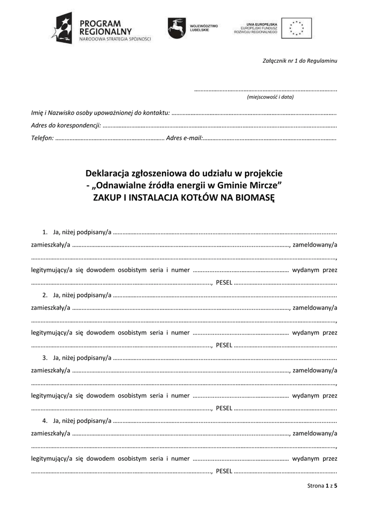 Załącznik nr 1 do Regulaminu ………………….………………………………………………………….. (miejscowość i data) Imię i Nazwisko osoby upoważnionej do kontaktu: ………………………………………………………………………………………….. Adres do korespondencji: ……………………………………………………………………………..………..………..………..……………………. Telefon: …………………………………………………………… Adres e-mail:………………..………………………………………………………. Deklaracja zgłoszeniowa do udziału w projekcie - „Odnawialne źródła energii w Gminie Mircze” ZAKUP I INSTALACJA KOTŁÓW NA BIOMASĘ 1. Ja, niżej podpisany/a ………………………………………………........…………………………..….……………………….............. zamieszkały/a ……………………………….……………………………………………………….................………………, zameldowany/a …………………………………………………………………………………………………………………………………………………………………………, legitymujący/a się dowodem osobistym seria i numer …….............…..…..………………………… wydanym przez ………………………………………………………..………………………………………..., PESEL ……………………………………………………….. 2. Ja, niżej podpisany/a ………………………………………………........…………………………..….……………………….............. zamieszkały/a ……………………………….……………………………………………………….................………………, zameldowany/a …………………………………………………………………………………………………………………………………………………………………………, legitymujący/a się dowodem osobistym seria i numer …….............…..…..………………………… wydanym przez ………………………………………………………..………………………………………..., PESEL ……………………………………………………….. 3. Ja, niżej podpisany/a ………………………………………………........…………………………..….……………………….............. zamieszkały/a ……………………………….……………………………………………………….................………………, zameldowany/a …………………………………………………………………………………………………………………………………………………………………………, legitymujący/a się dowodem osobistym seria i numer …….............…..…..………………………… wydanym przez ………………………………………………………..………………………………………..., PESEL ……………………………………………………….. 4. Ja, niżej podpisany/a ………………………………………………........…………………………..….……………………….............. zamieszkały/a ……………………………….……………………………………………………….................………………, zameldowany/a …………………………………………………………………………………………………………………………………………………………………………, legitymujący/a się dowodem osobistym seria i numer …….............…..…..………………………… wydanym przez ………………………………………………………..………………………………………..., PESEL ……………………………………………………….. Strona 1 z 5 deklaruję chęć uczestnictwa w projekcie pn. „Odnawialne źródła energii w Gminie Mircze” polegającym na zakupie i montażu instalacji z zakresu odnawialnych źródeł energii na potrzeby budynku mieszkalnego * zlokalizowanego na terenie Gminy Mircze, stanowiącego moją własność/współwłasność i położonego na działce o nr ewid. ………………………………………, obręb …………………………………..................................., pod adresem …………………………………………………………………………………………………………………………………………………………………………. Wybrany przeze mnie rodzaj instalacji – kocioł na biomasę Jestem świadomy/a odpowiedzialności karnej za składanie fałszywych oświadczeń lub zatajenie prawdy, a podane przeze mnie dane są zgodne z prawdą i stanem faktycznym, w związku z tym oświadczam, że: 1. Zapoznałem/am się z Regulaminem naboru wniosków w ramach projektu pn. „Odnawialne źródła energii 2. 3. 4. 5. w Gminie Mircze” planowanego do realizacji przez Gminę Mircze w latach 2016-2018 dla zakupu i instalacji kotłów na biomasę i akceptuję jego treść. Posiadam prawo do dysponowania nieruchomością (działką wraz z istniejącym budynkiem mieszkalnym, dla którego planowany jest montaż instalacji w ramach projektu) położoną na terenie Gminy Mircze, na podstawie (właściwe proszę zaznaczyć): aktu notarialnego księgi wieczystej postanowienia Sądu innego dokumentu, tj. ……………………………………………………………………………………………………….................... Na tej podstawie posiadam prawo do dysponowania ww. nieruchomością co najmniej do dnia 31.12.2023 r. w sposób umożliwiający monta
