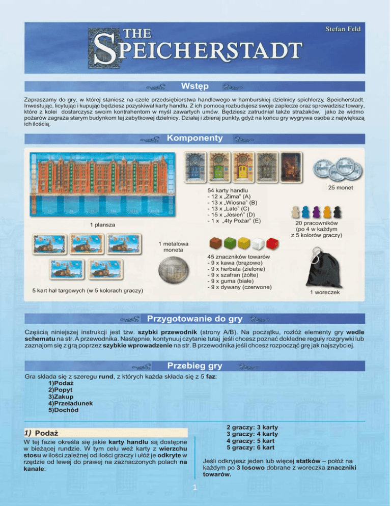 Wstêp Zapraszamy do gry, w której staniesz na czele przedsiêbiorstwa handlowego w hamburskiej dzielnicy spichlerzy, Speicherstadt. Inwestuj¹c, licytuj¹c i kupuj¹c bêdziesz pozyskiwa³ karty handlu. Z ich pomoc¹ rozbudujesz swoje zaplecze oraz sprowadzisz towary, które z kolei dostarczysz swoim kontrahentom w myœl zawartych umów. Bêdziesz zatrudnia³ tak¿e stra¿aków, jako ¿e widmo po¿arów zagra¿a starym budynkom tej zabytkowej dzielnicy. Dzia³aj i zbieraj punkty, gdy¿ na koñcu gry wygrywa osoba z najwiêksz¹ ich iloœci¹. Komponenty 54 karty handlu - 12 x „Zima” (A) - 13 x „Wiosna” (B) - 13 x „Lato” (C) - 15 x „Jesieñ” (D) - 1 x „4ty Po¿ar” (E) 1 plansza 25 monet 20 pracowników (po 4 w ka¿dym z 5 kolorów graczy) 1 metalowa moneta 45 znaczników towarów - 9 x kawa (br¹zowe) - 9 x herbata (zielone) - 9 x szafran (¿ó³te) - 9 x guma (bia³e) - 9 x dywany (czerwone) 5 kart hal targowych (w 5 kolorach graczy) 1 woreczek Przygotowanie do gry Czêœci¹ niniejszej instrukcji jest tzw. szybki przewodnik (strony A/B). Na pocz¹tku, roz³ó¿ elementy gry wedle schematu na str. A przewodnika. Nastêpnie, kontynuuj czytanie tutaj jeœli chcesz poznaæ dok³adne regu³y rozgrywki lub zaznajom siê z gr¹ poprzez szybkie wprowadzenie na str. B przewodnika jeœli chcesz rozpocz¹æ grê jak najszybciej. Przebieg gry Gra sk³ada siê z szeregu rund, z których ka¿da sk³ada siê z 5 faz: 1)Poda¿ 2)Popyt 3)Zakup 4)Prze³adunek 5)Dochód Poda¿ W tej fazie okreœla siê jakie karty handlu s¹ dostêpne w bie¿¹cej rundzie. W tym celu weŸ karty z wierzchu stosu w iloœci zale¿nej od iloœci graczy i u³ó¿ je odkryte w rzêdzie od lewej do prawej na zaznaczonych polach na kanale: 2 graczy: 3 karty 3 graczy: 4 karty 4 graczy: 5 kart 5 graczy: 6 kart Jeœli odkryjesz jeden lub wiêcej statków – po³ó¿ na ka¿dym po 3 losowo dobrane z woreczka znaczniki towarów. Popyt W tej fazie wyznacza siê wielkoœæ popytu na oferowane w pierwszej fazie karty handlu. Gracz posiadaj¹cy metalow¹ monetê rozpoczyna. Zgodnie z kierunkiem wskazówek zegara ka¿dy gracz wybiera 1 kartê umieszczaj¹c 1 swojego pracownika na budynku powy¿ej niej. Pracownika zawsze umieszczamy na najni¿szych wolnym miejscu nad kart¹. Gracze umieszczaj¹ swoich pracowników na przemian a¿ wszyscy rozmieszcz¹ po trzech. Za ka¿dym razem mo¿esz wybraæ dowoln¹ kartê. Jeœli nad wybran¹ kart¹ s¹ ju¿ jacyœ pracownicy to umieœæ swojego pracownika na kolejnym wolnym miejscu . Gracz nie mo¿e zrezygnowaæ z wy³o¿enia. Mo¿e natomiast umieœciæ wiêcej ni¿ 1 pracownika nad jedn¹ kart¹. Jeœli wszystkie 8 miejsc nad kart¹ jest zajêtych gracze nie mog¹ nad ta kart¹ umieszczaæ wiêcej pracowników. W ten sposób tworz¹ siê kolumny pracowników nad wy³o¿onymi kartami. Mo¿e siê te¿ zdarzyæ, ¿e na któr¹œ z kart nie bêdzie popytu i ¿aden gracz nie umieœci nad ni¹ pracownika.Jak tylko gracze rozmieszcz¹ po 3 pracowników faza dobiega koñca. Zobacz przyk³ad na str. B szybkiego przewodnika. Zakup Teraz przeprowadza siê zakup ka¿dej karty z osobna, od lewej do prawej. Procedura jest taka sama dla wszystkich kart. Gracz, którego pracownik zajmuje miejsce bezpoœrednio nad kart¹ (stoi najni¿ej w kolumnie) decyduje czy chce zakupiæ tê kartê. Jeœli tak, p³aci do banku tyle monet ilu wszystkich pracowników znajduje siê nad kart¹ (nie mo¿na p³aciæ metalow¹ monet¹). Gracz zabiera kartê i k³adzie przed sob¹. Od tej chwili mo¿e korzystaæ z jej funkcji. Wszyscy pracownicy znad karty wracaj¹ do swoich w³aœcicieli. Jeœli gracz nie chce b¹dŸ nie mo¿e kupiæ karty zabiera swojego pracownika z planszy. Teraz gracz, którego pracownik sta³ siê najni¿ej po³o¿onym decyduje siê na zakup. Jako, ¿e nad kart¹ jest teraz o jednego pracownika mniej jej cena spad³a o jedn¹ monetê. Jeœli i ten gracz rezygnuje z zakupu kolej przechodzi na gracza z nastêpnym najni¿szym pracownikiem itd. W ten sposób karta mo¿e byæ zaoferowana wszystkim graczom, którzy umieœcili ponad ni¹ swoich pracowników. Jeœli ¿aden nie zdecyduje siê na zakup kartê odrzuca siê z gry. Kartê odrzuca siê tak¿e, jeœli ¿aden z graczy nie umieœci³ nad ni¹ pracownika. W ten sposób rozpatruje siê zakup wszystkich kart po kolei. Rozpoczyna gracz startowy, nastêpnie gra toczy siê zgodnie z kierunkiem wskazówek zegara. (Aby przyspieszyæ grê gracze mog¹ wykonywaæ swoje dzia³ania równoczeœnie). Uwaga: Gracze nie mog¹ handlowaæ ani wymieniaæ siê pomiêdzy sob¹ monetami , towarami ani kartami! W tej fazie mo¿na u¿yæ nastêpuj¹cych kart: Statek Jeœli w tej rundzie zakupi³eœ jeden lub wiêcej statków musisz je teraz roz³adowaæ. Zdejmij z nich wszystkie znaczniki towarów. Nastêpnie dla ka¿dego znacznika z osobna zadecyduj co chcesz z nim zrobiæ: - umieœciæ go na karcie kontraktu - sprzedaæ go przedsiêbiorcy - zatrzymaæ go w swoim magazynie - zamieniæ, sprzedaæ lub przechowaæ w hali targowej Na koniec tej fazy na statkach nie mo¿e pozostaæ ¿aden towar. Nieu¿yte znaczniki przepadaj¹ (zostaj¹ od³o¿one do zasobów obok planszy). W ¿adnym wypadku nie wracaj¹ do woreczka! Kontrakt Mo¿esz przenieœæ znaczniki towarów ze statków do magazynu lub hali targowej albo na jedn¹ b¹dŸ wiêcej kart kontraktu. W tym wypadku rodzaj towaru musi odpowiadaæ symbolowi na karcie kontraktu. Na przyk³ad, br¹zow¹ kostkê mo¿na umieœciæ tylko na symbolu kawy a bia³¹ na symbolu gumy. Mo¿esz umieszczaæ pojedyncze znaczniki na kartach kontraktu wype³niaj¹c je w kolejnych etapach gry. Nie mo¿esz natomiast usuwaæ towarów raz umieszczonych na karcie kontraktu. Przedsiêbiorca Mo¿esz sprzedaæ dowoln¹ iloœæ towarów ze statków, z magazynu lub hali targowej jednemu lub kilku przedsiêbiorcom: - palacz kawy - degustator herbaty - handlarz przyprawami - handlarz dywanów - wulkanizator Ka¿dy przedsiêbiorca p³aci 1 monetê za k